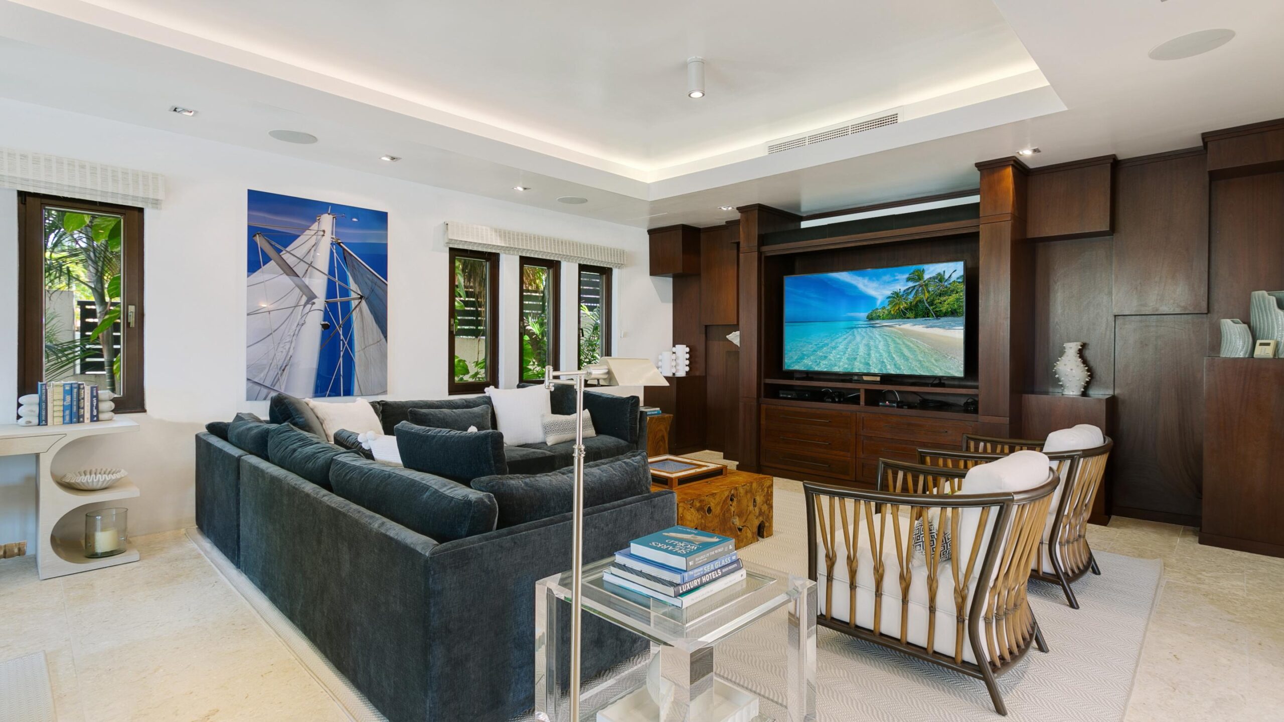 At Nevaeh, your stay includes full breakfast, three meals per day with a private chef, butler service, local transfers, house bar privileges, and your own four-seater UTV and golf carts for convenient exploration. Engage in friendly matches on the tennis/basketball court or beach volleyball, and set out to sea on kayaks and sea scooters. Relax on the beach, terrace, infinity pool, and hot tub. Indulge in fresh barbecue seafood at the al-fresco dining area. Immerse in stargazing from the hot tub or set the ambiance with the Sonos sound system. For indoor entertainment, explore the home theater or high-tech golf simulator. Ocean terrace gazebo massages or yoga sessions can be arranged.