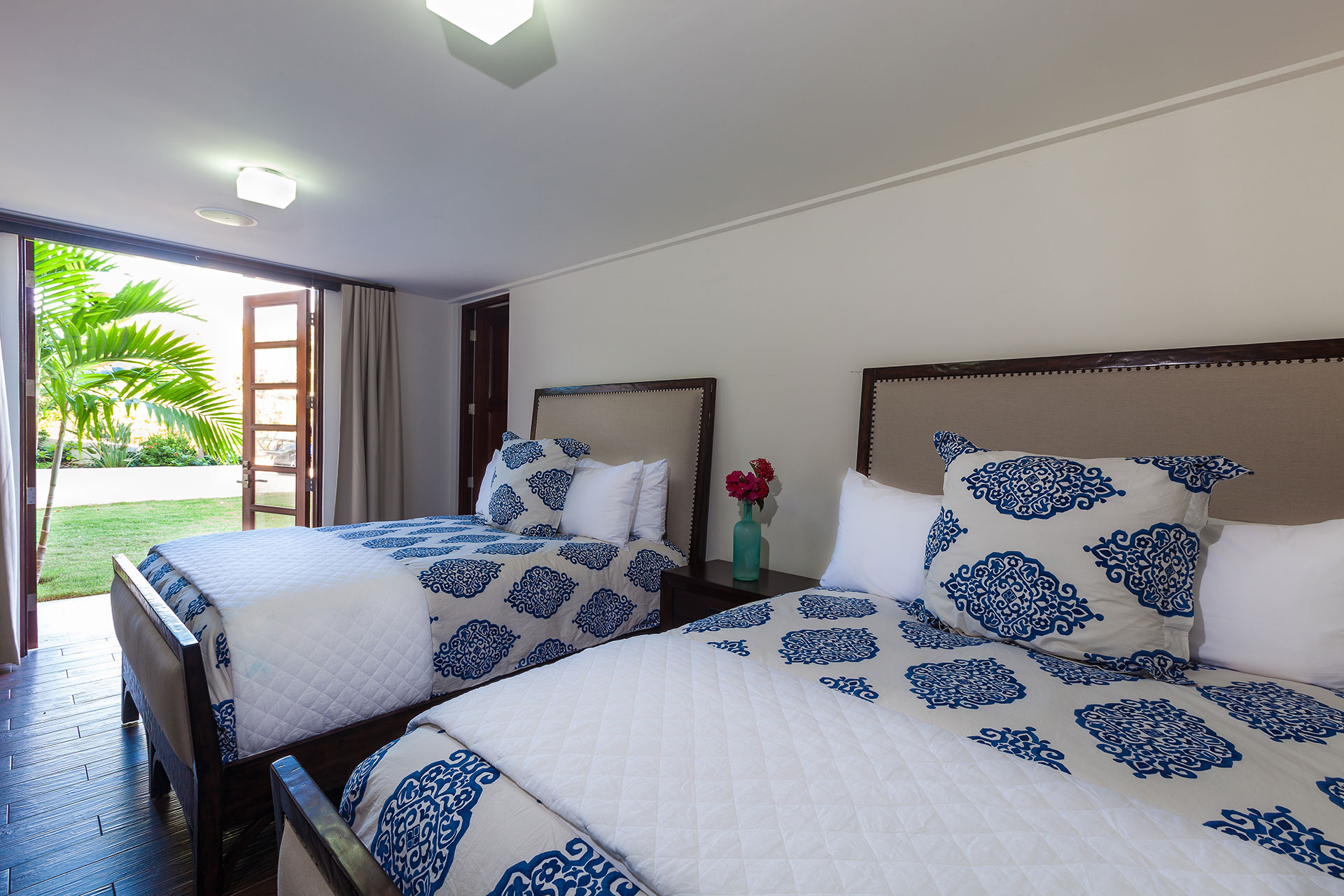 With nine bedrooms across a main house and guest house, plus a separate freestanding suite, the villa was designed for groups who want to be together without ever feeling on top of one another. In the main house, five king-bedroom suites with en-suite bathrooms offer calm, private retreats, including a standout suite with its own heated plunge pool and an outdoor bathroom that makes mornings feel like a spa ritual. The guest house adds three more bedrooms—its own master suite with en-suite bath and two additional rooms with two queen beds each sharing a bathroom—ideal for families traveling together. A ninth, freestanding king bedroom sits between the two buildings, creating a perfect “in-between” suite for someone who wants extra privacy while still being close to the heart of the villa.