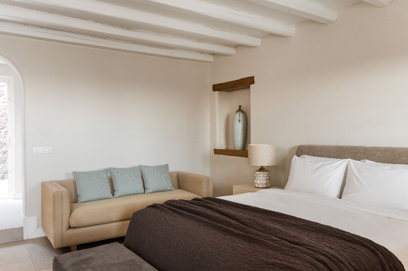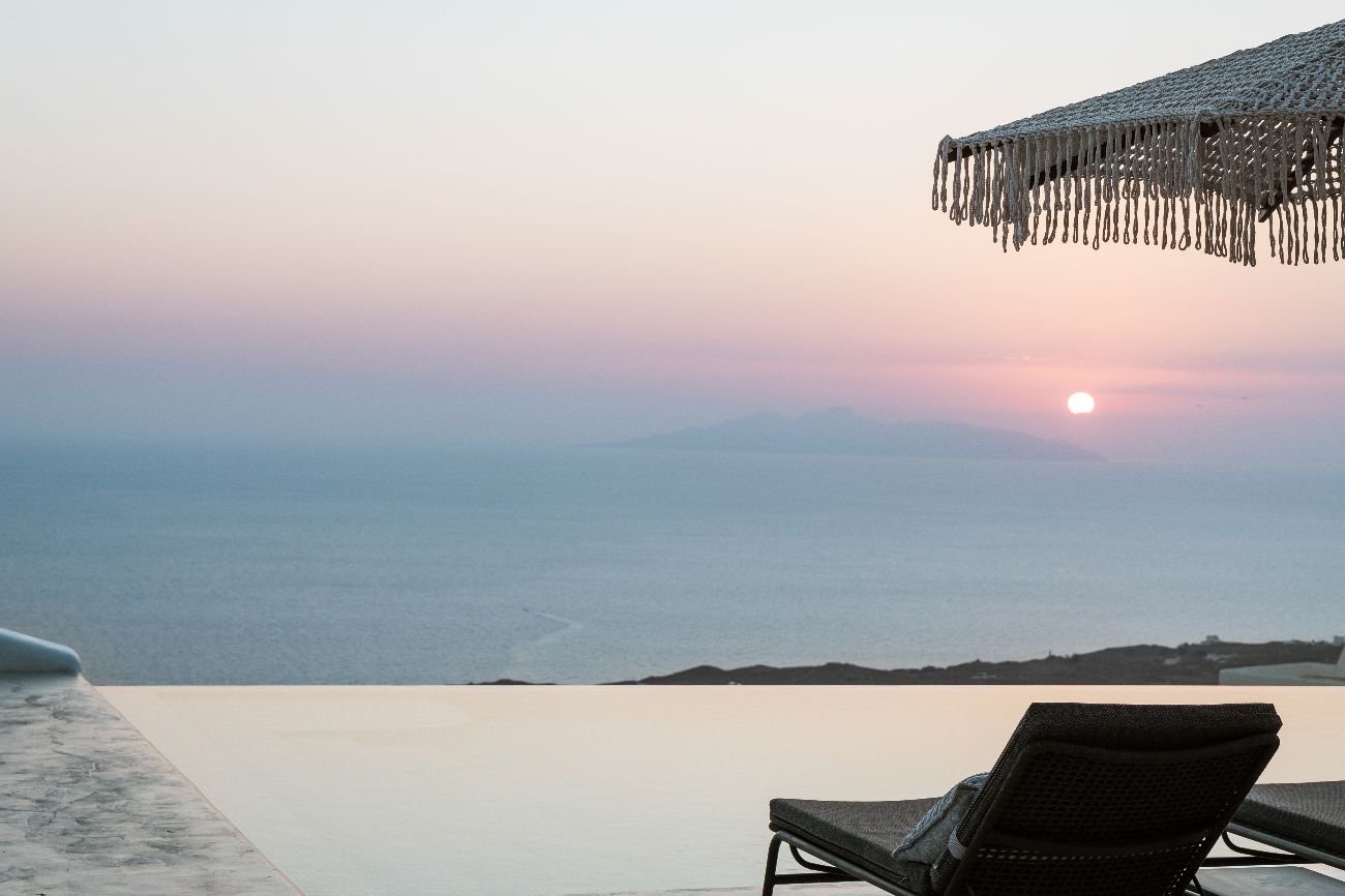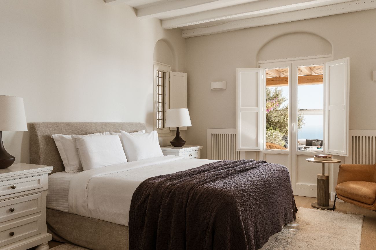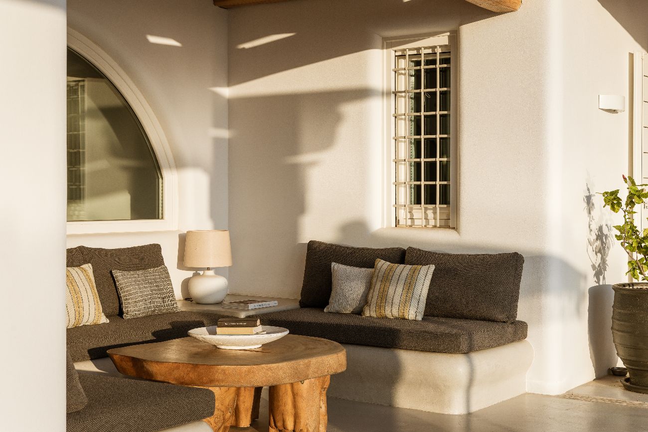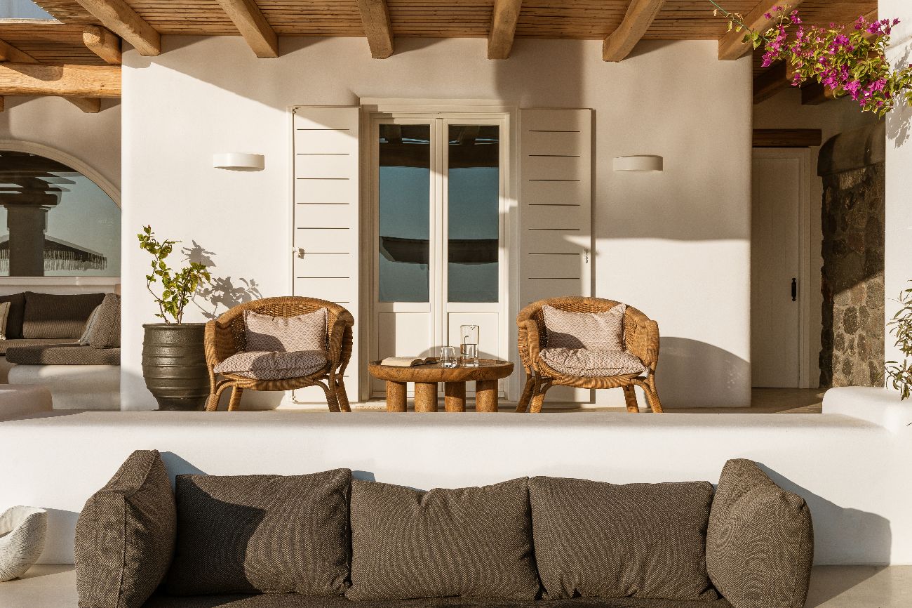 Large wooden doors open to the main terrace and pool area, which is surrounded by beautifully landscaped gardens. From the terraces, you’ll enjoy breathtaking views of the Aegean Sea, especially during sunrise.