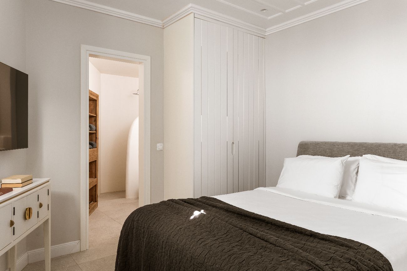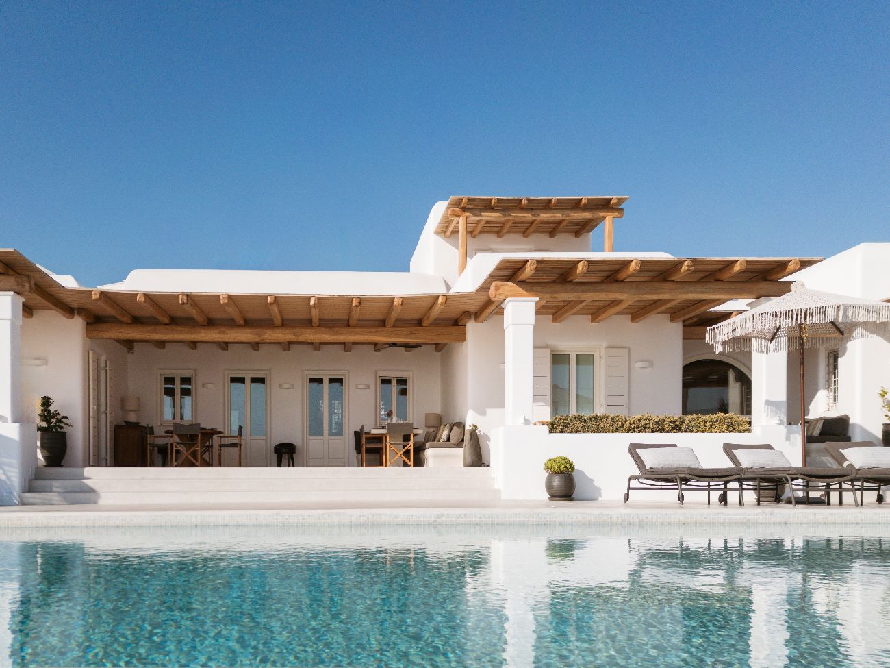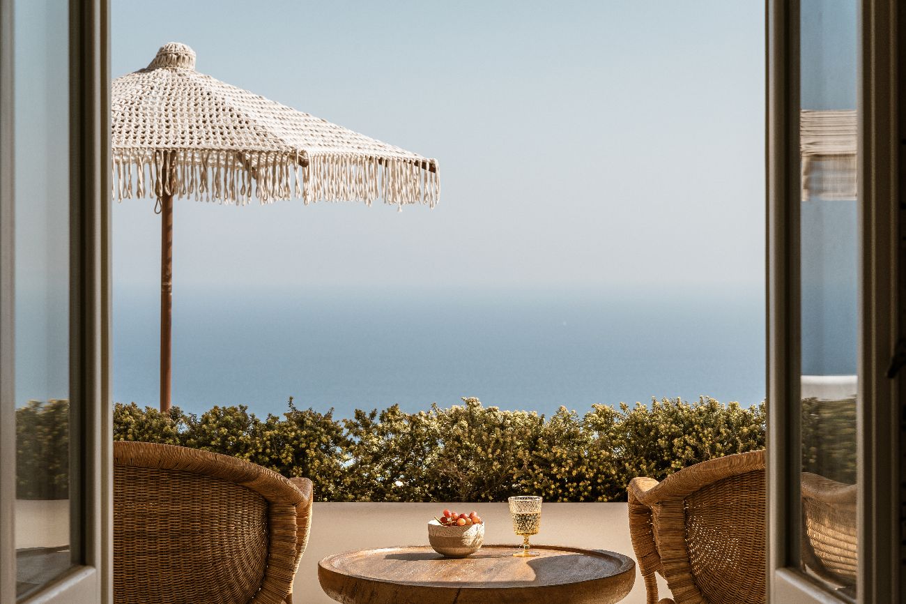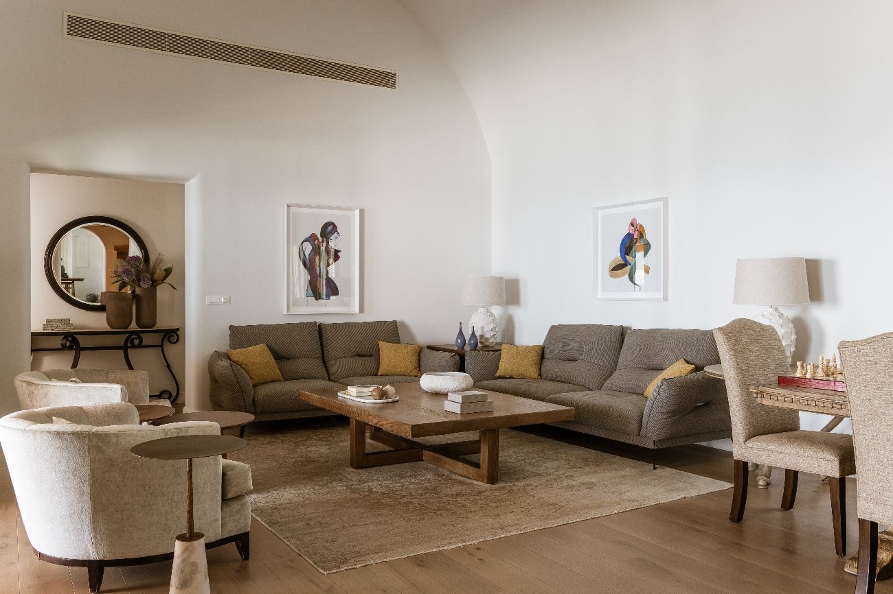 Large wooden doors open to the main terrace and pool area, which is surrounded by beautifully landscaped gardens. From the terraces, you’ll enjoy breathtaking views of the Aegean Sea, especially during sunrise.