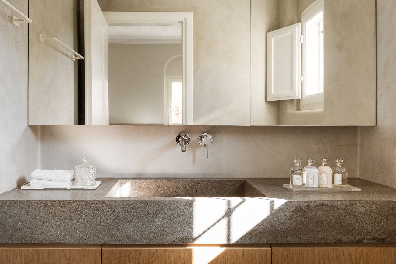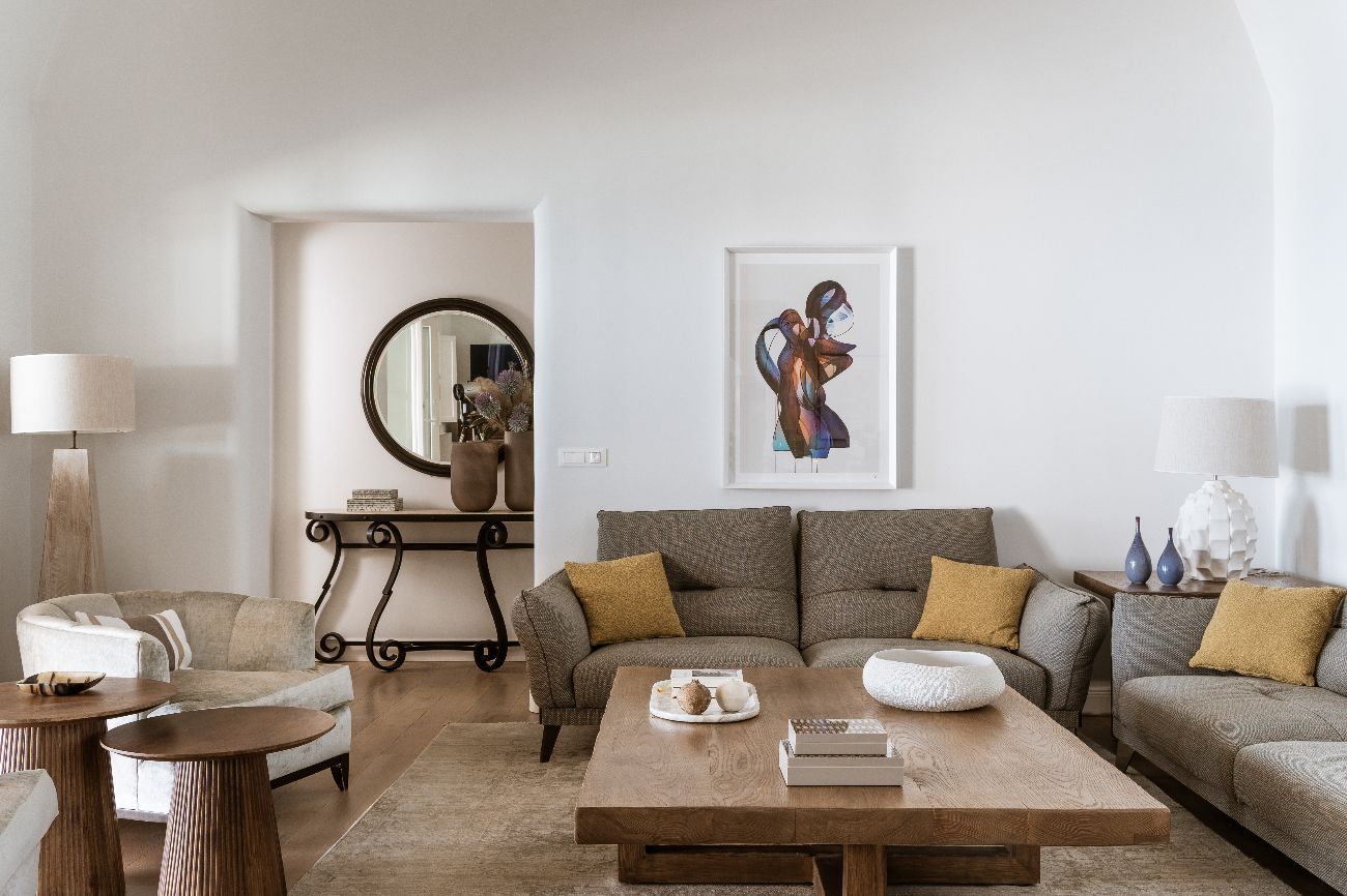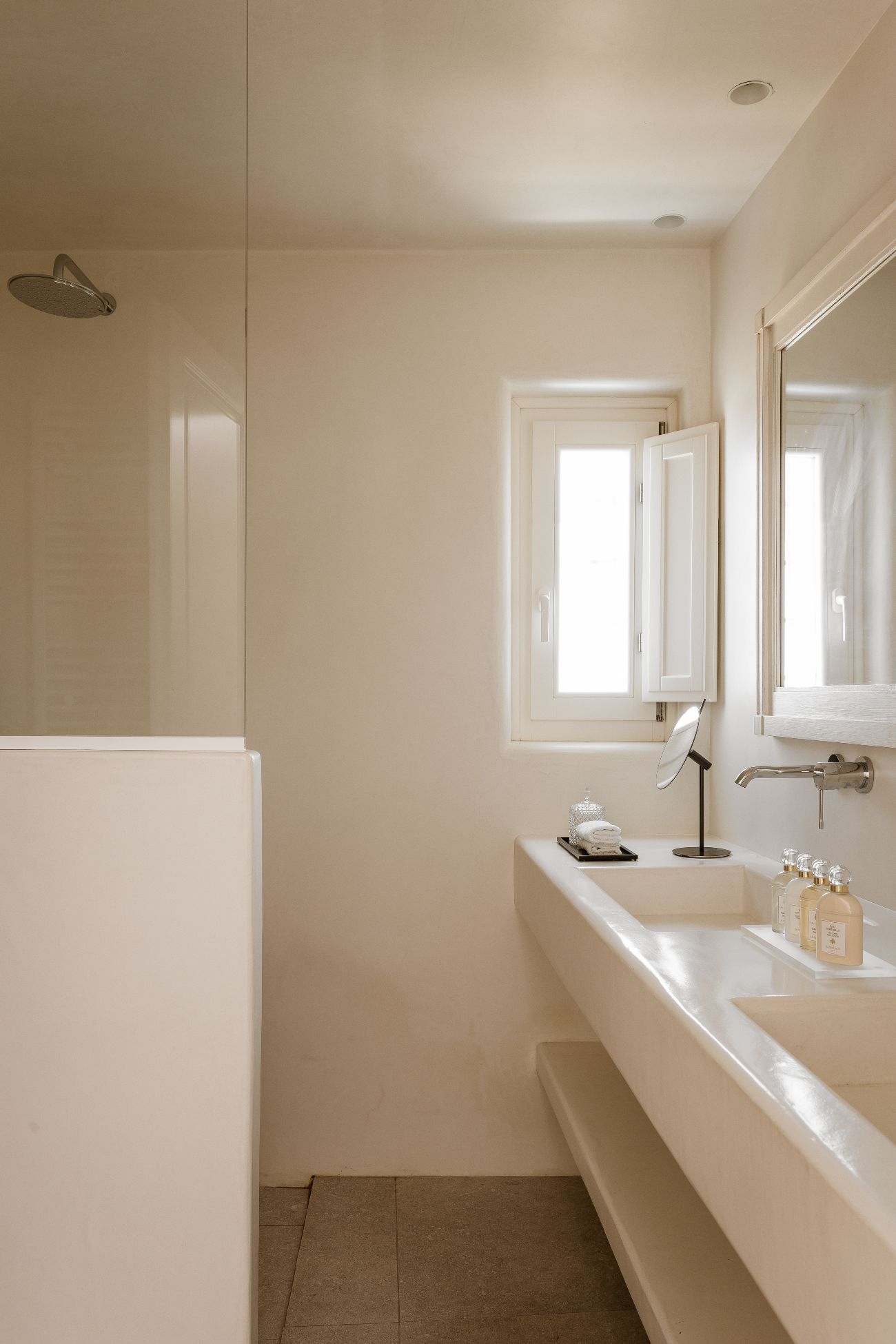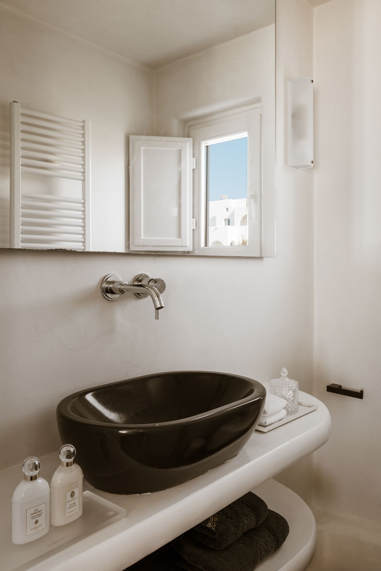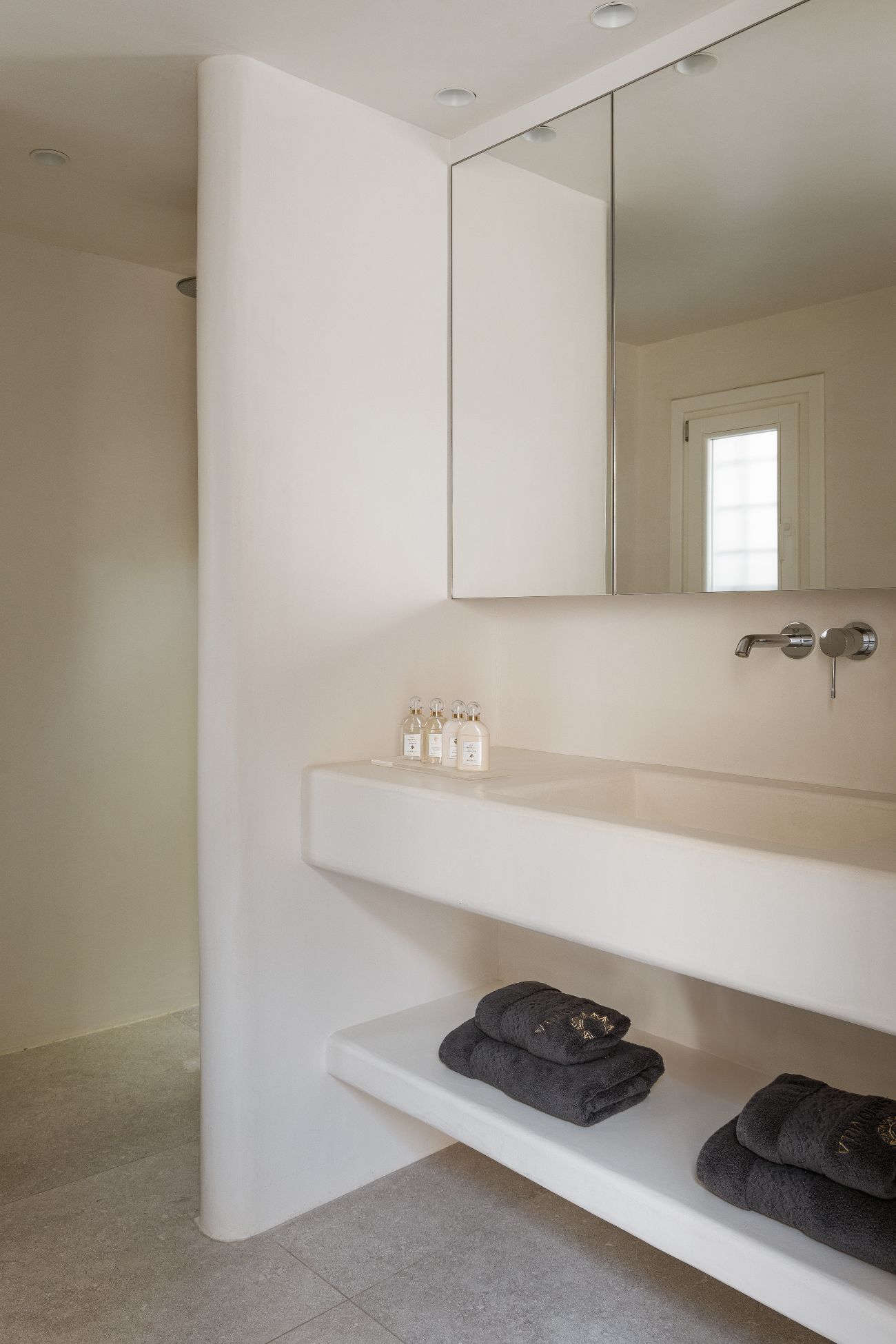 Large wooden doors open to the main terrace and pool area, which is surrounded by beautifully landscaped gardens. From the terraces, you’ll enjoy breathtaking views of the Aegean Sea, especially during sunrise.