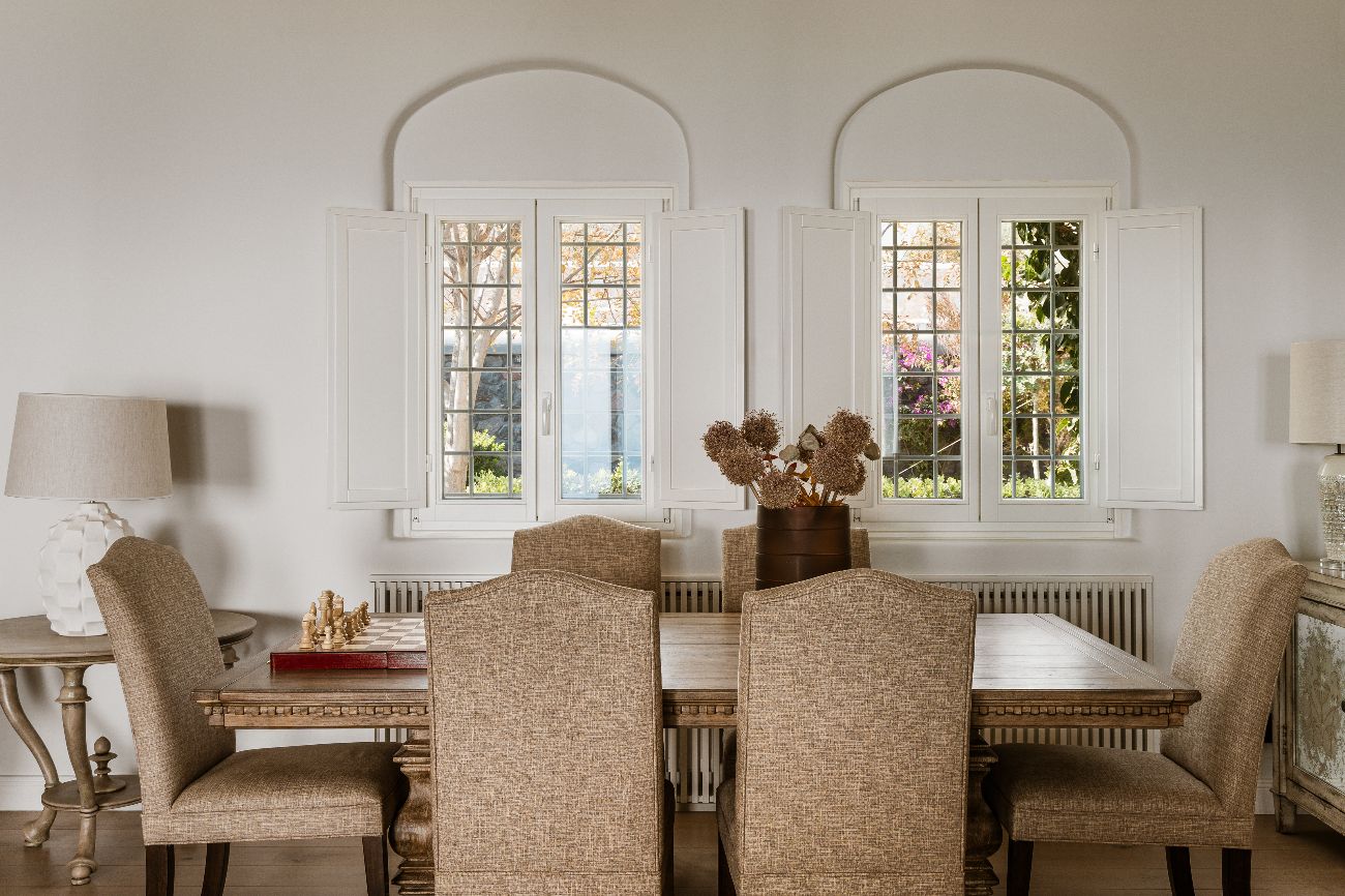 Inside, the villa features white walls, wooden floors, and large windows that let in cool breezes. The decor is cozy yet luxurious, with earthy tones adding warmth and comfort.