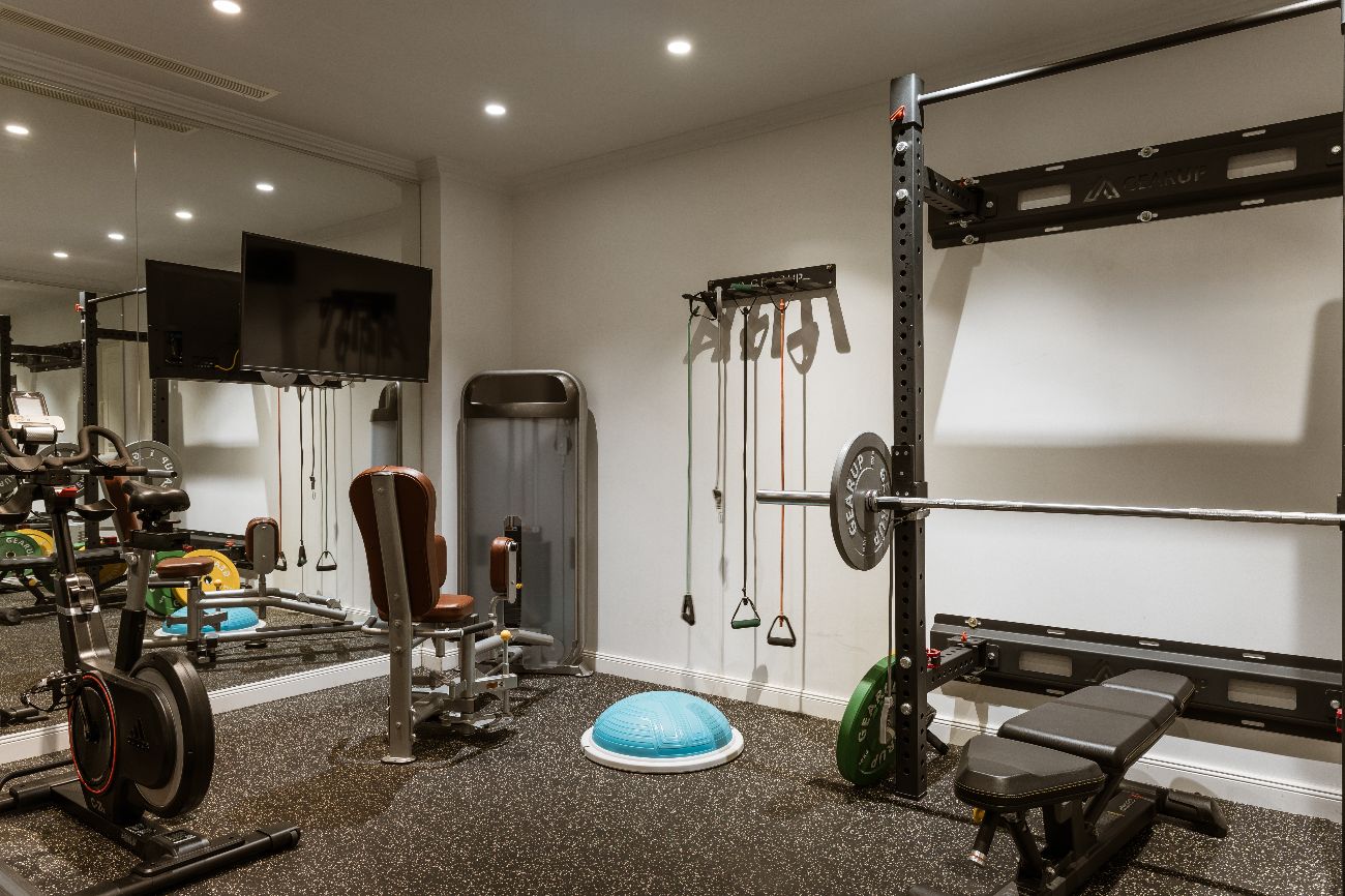 The lower level includes a second sitting room with access to the lower terrace, as well as a fully-equipped gym for those wanting to stay active.
