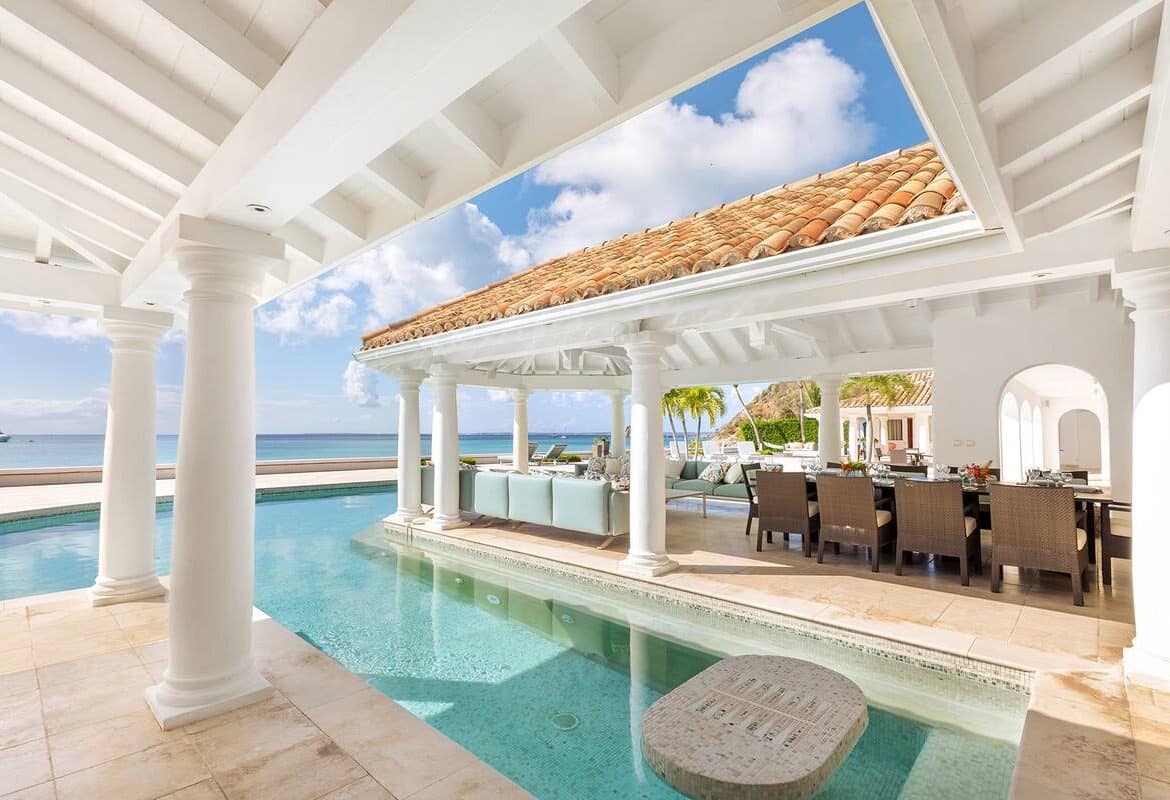 Covered and open terraces, defined by columns and arches, span the length of the villa. The large horseshoe-shaped heated pool sits at the sea’s edge. In the center of the horseshoe is a covered loggia for relaxing and dining poolside. A hot tub sits nearby for ultimate relaxation. Additionally, the villa has an on-site manager skilled in taking care of your needs and easy access down the beach to Grand Case Beach Club restaurant and bar.