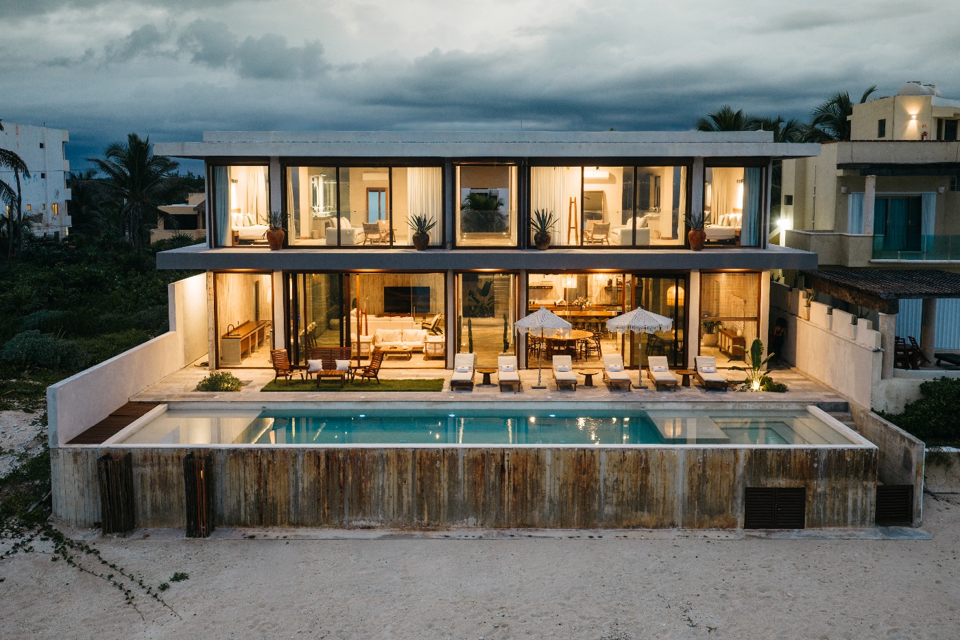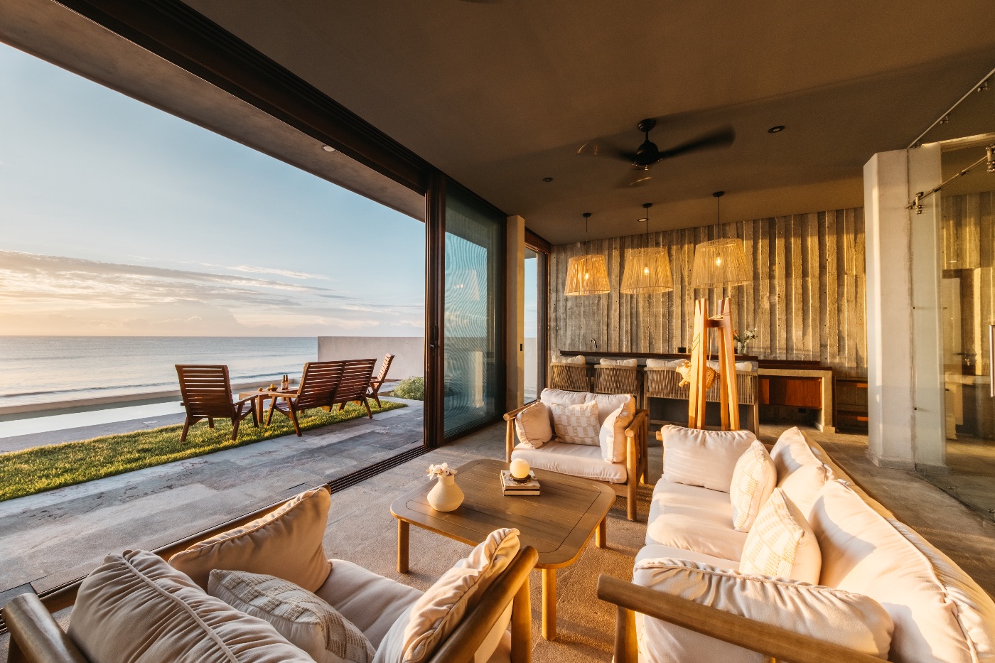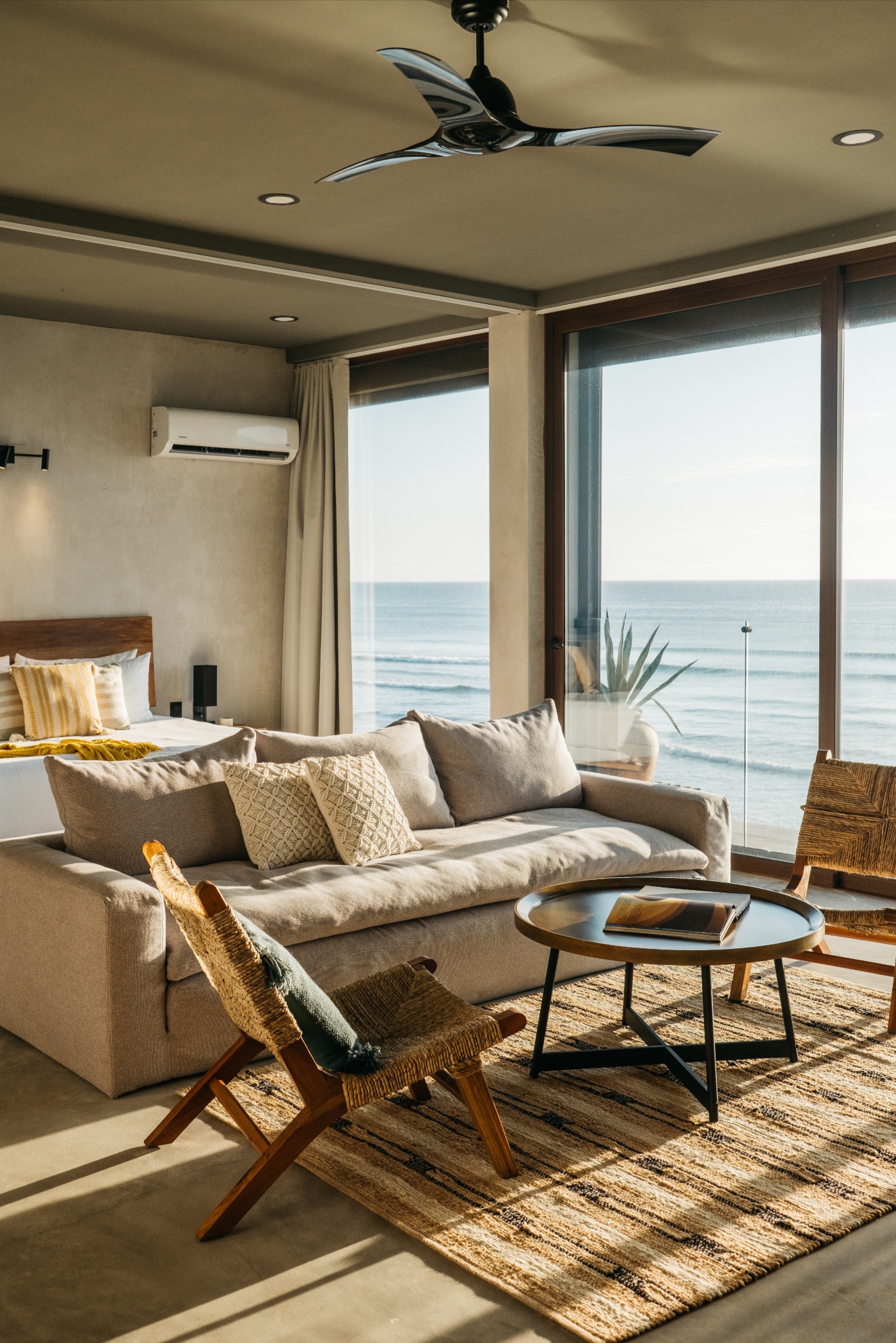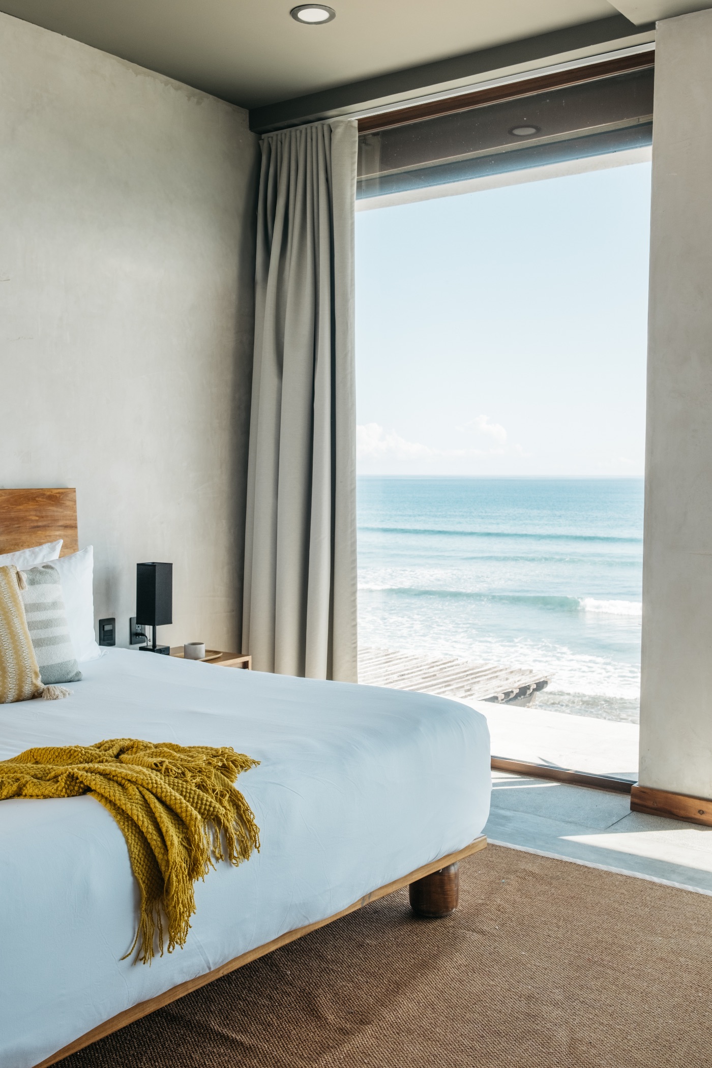 Seven bedrooms with ensuite bathrooms and windows framing the ocean from floor to ceiling