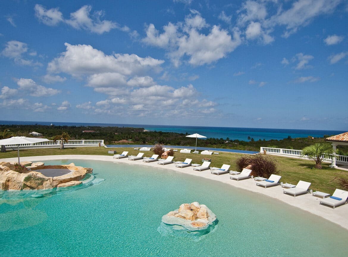 The main living spaces are a celebration of light, space, and connection to the sea. Expansive indoor lounges flow seamlessly into open pool terraces, all oriented westward toward the Caribbean Sea, where the sunsets are nothing short of cinematic. The plush leather sofas in the living room face a home cinema system, perfect for cozy movie nights or laid-back afternoons.