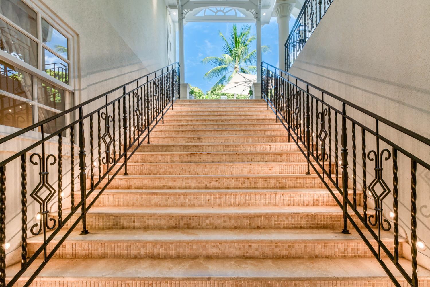 Sandy Lane Estate on the West Coast, Barbados. Spread over three levels, the villa features seven spacious bedrooms. As you enter through the large double doors, you are greeted by a waterfall and open reception areas that lead to the garden and pool terrace with a bar and BBQ. On the main level, there are four guest suites (two with direct pool access), a family room, a powder room, and a modern kitchen with stainless steel appliances and plenty of storage. The laundry and staff areas are located on the lower level, along with a three-car garage.