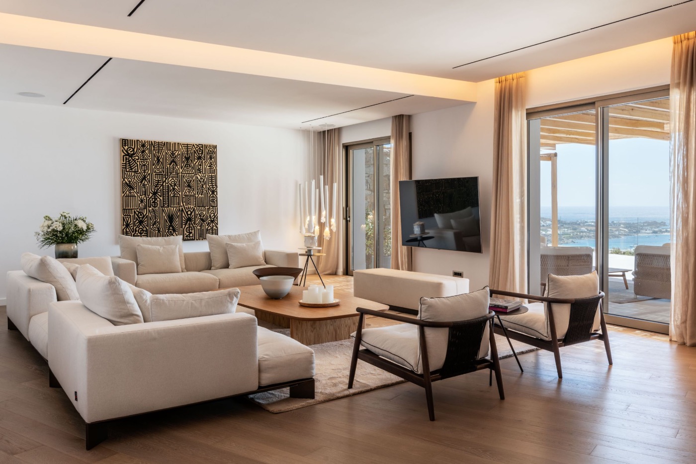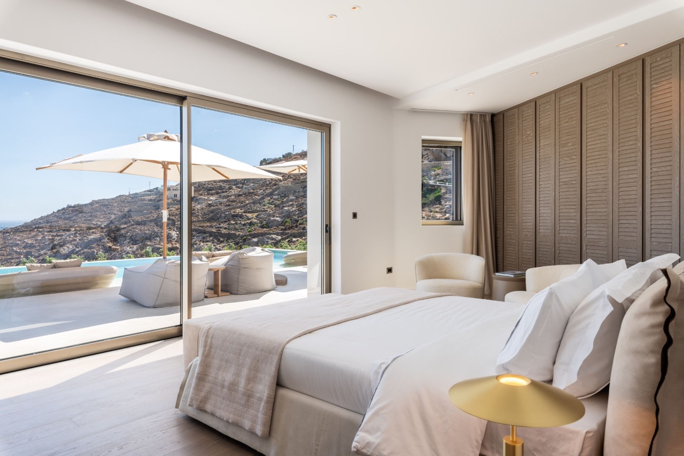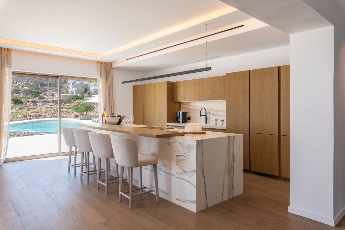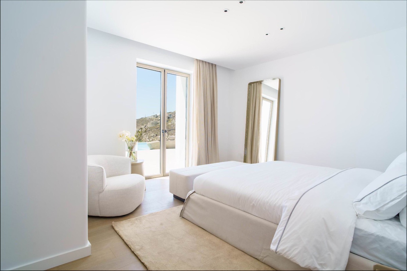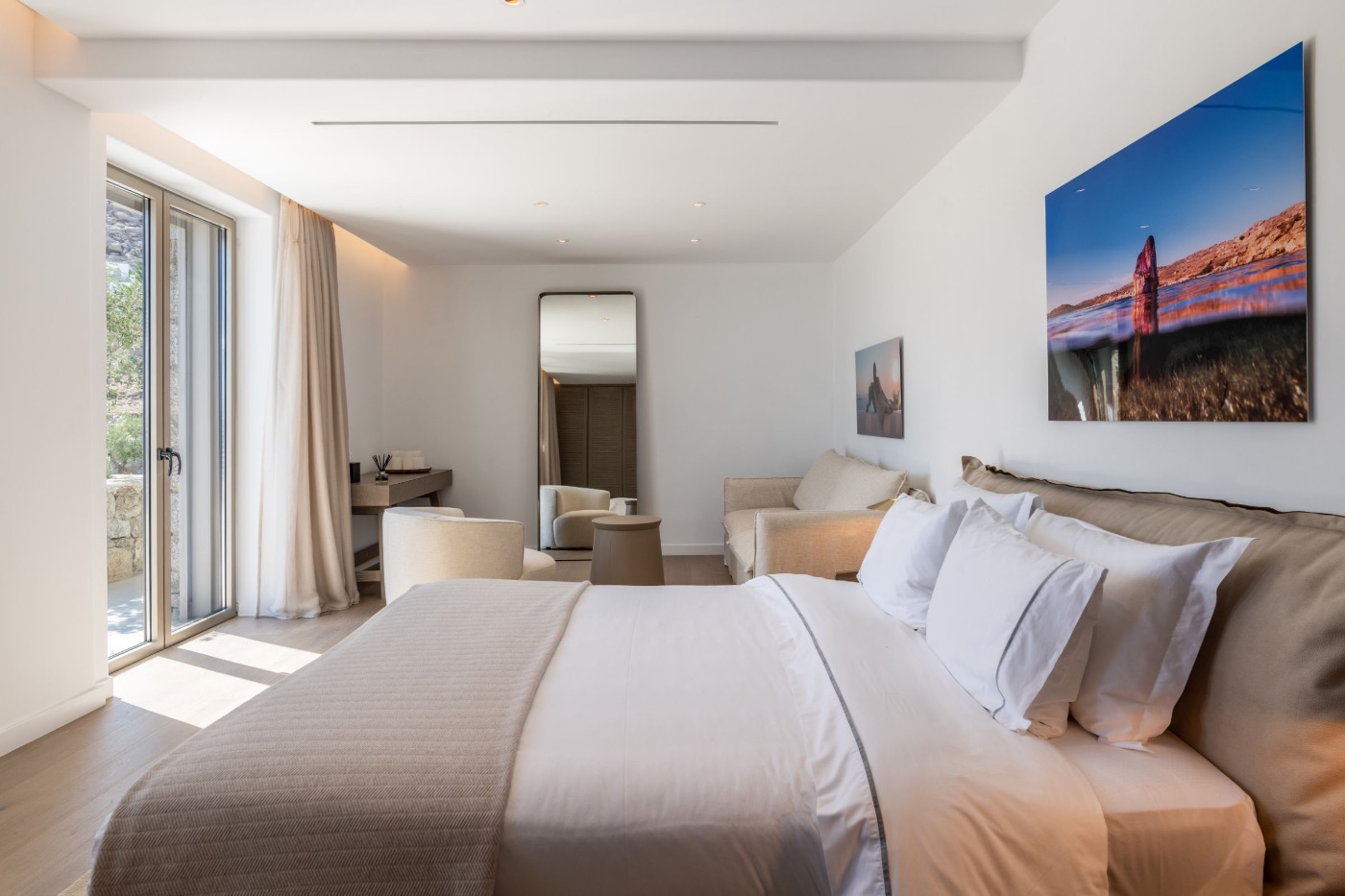 The villa’s architecture plays with transparency and light. Floor-to-ceiling glass walls blur the lines between interior and exterior, letting in the golden Mykonian light at every hour. Inside, a soothing palette of natural textures and contemporary design creates a space that feels serene, warm, and entirely your own.