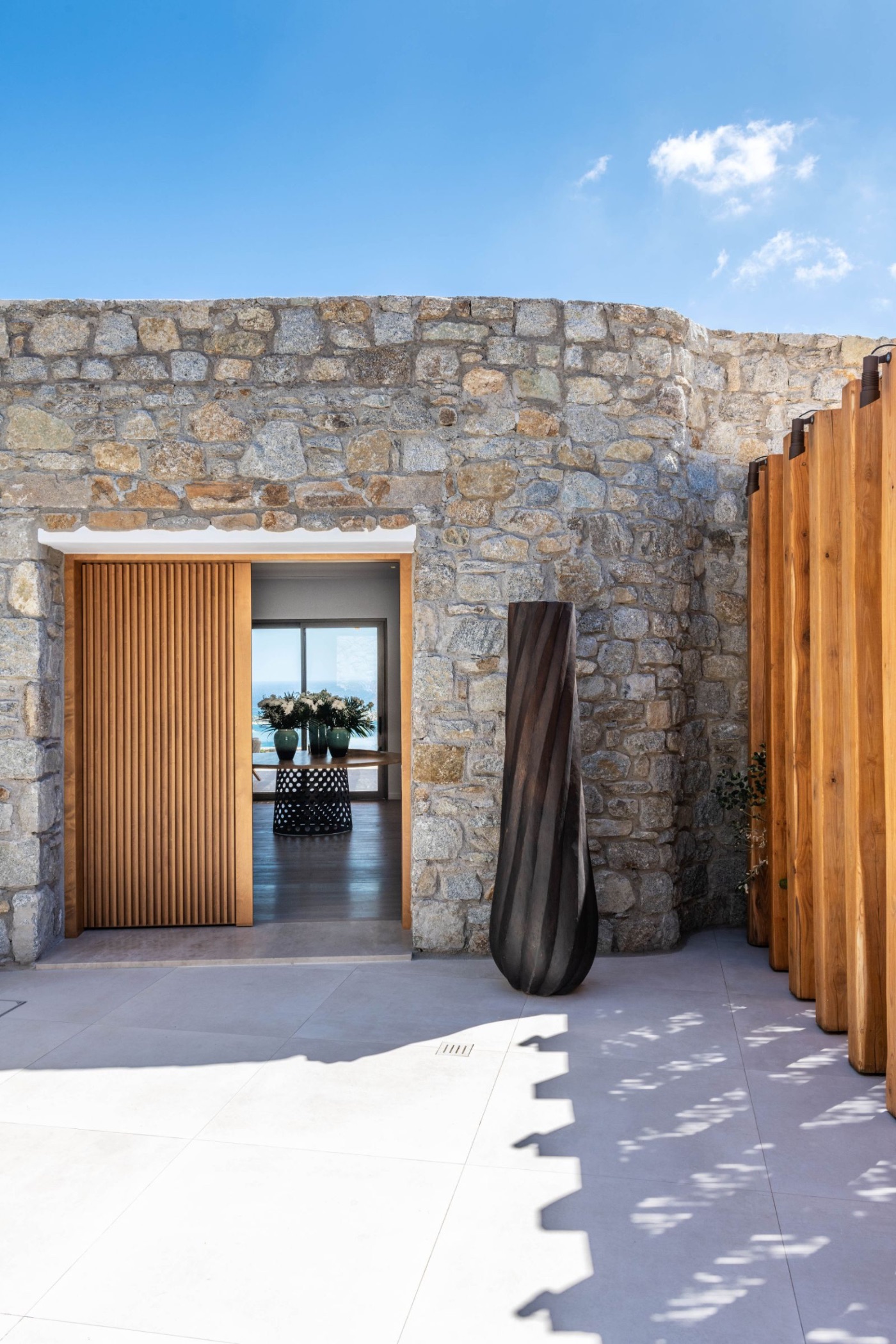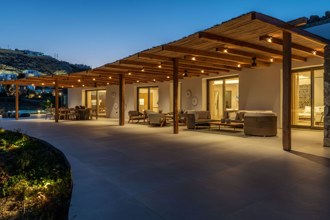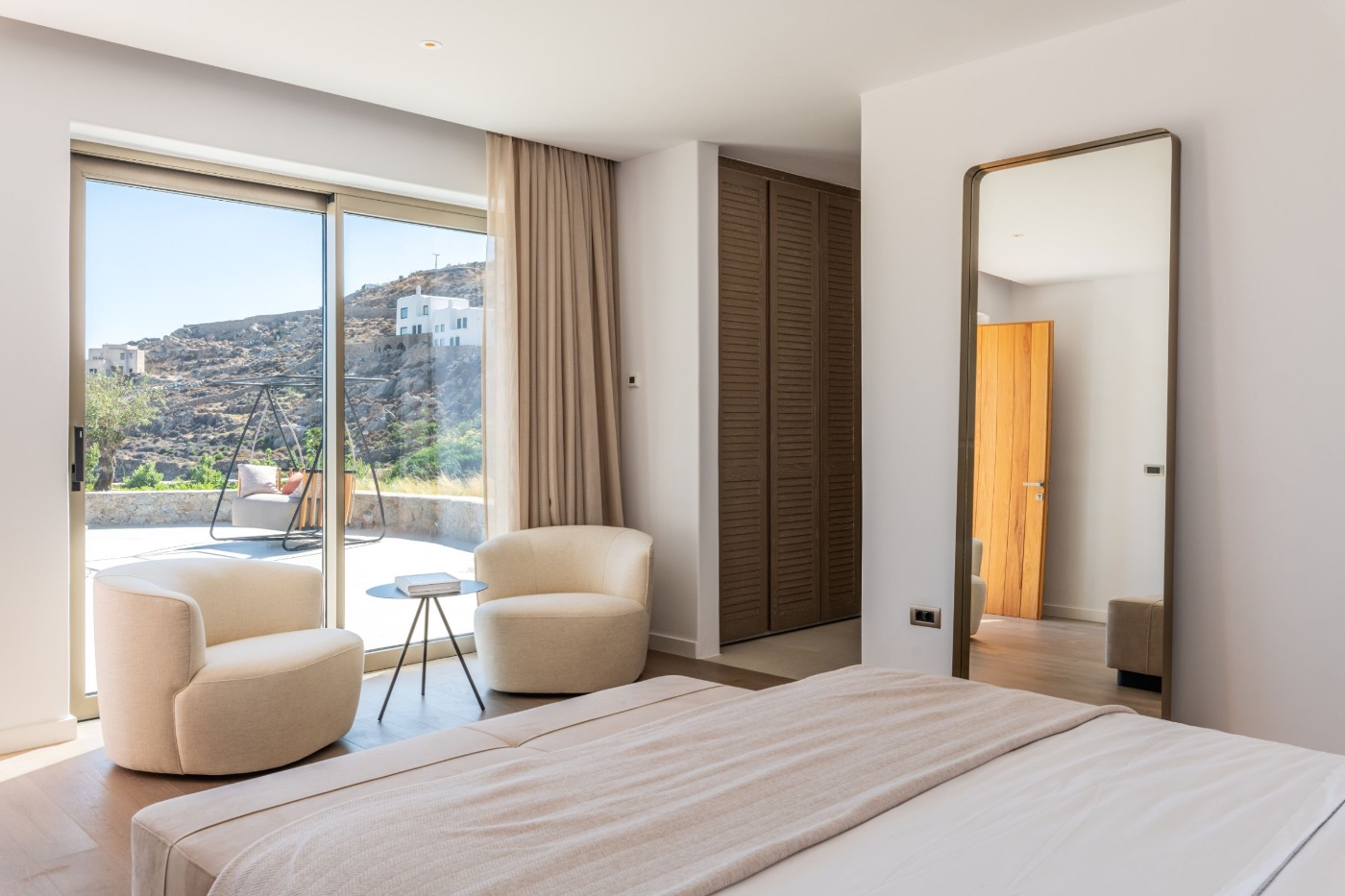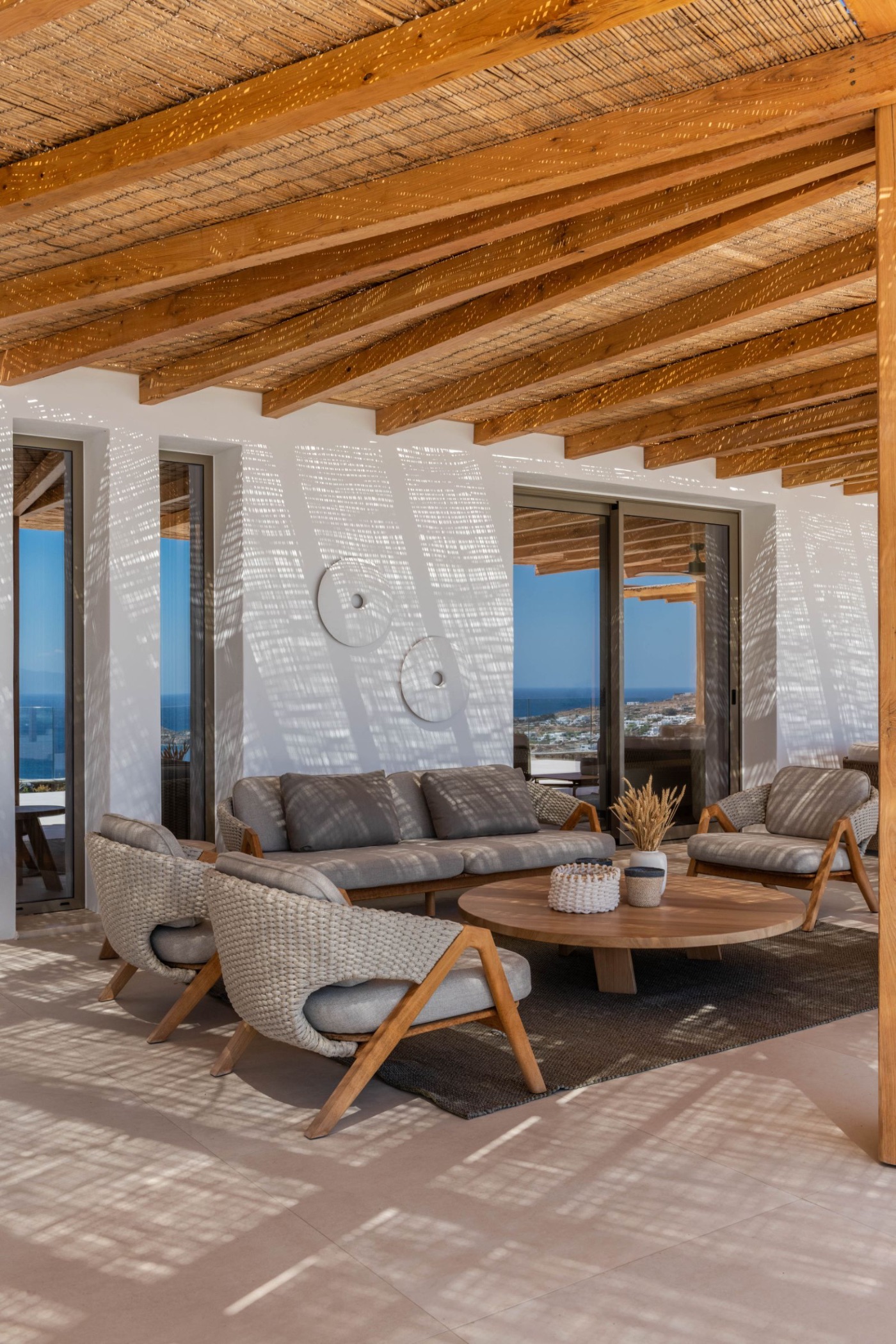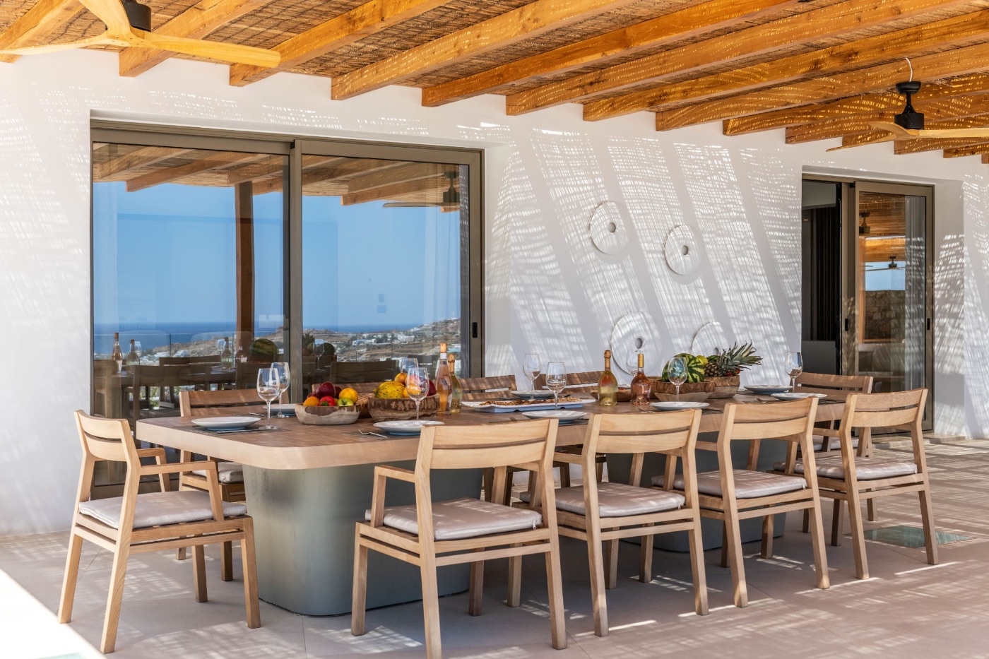 The villa’s architecture plays with transparency and light. Floor-to-ceiling glass walls blur the lines between interior and exterior, letting in the golden Mykonian light at every hour. Inside, a soothing palette of natural textures and contemporary design creates a space that feels serene, warm, and entirely your own.