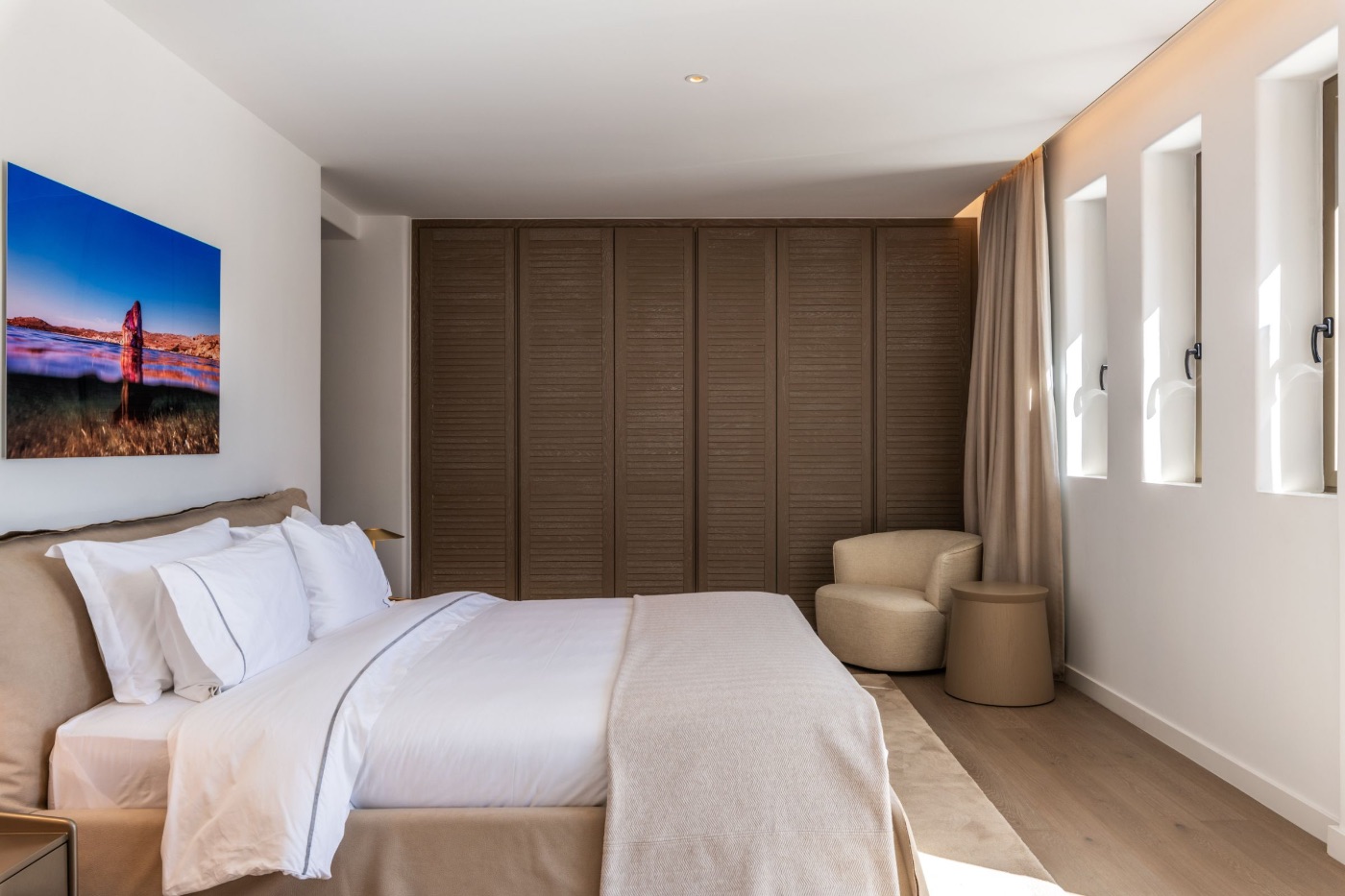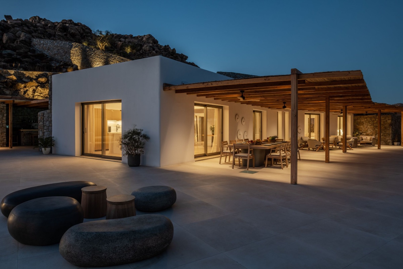 The open-plan living, dining, and kitchen areas are designed for both entertaining and unwinding, with fluid indoor-outdoor transitions that make the most of Mykonos’ idyllic climate. Whether it’s a lazy breakfast at sunrise or an evening cocktail with friends, the spaces here adapt effortlessly to the rhythm of your stay.