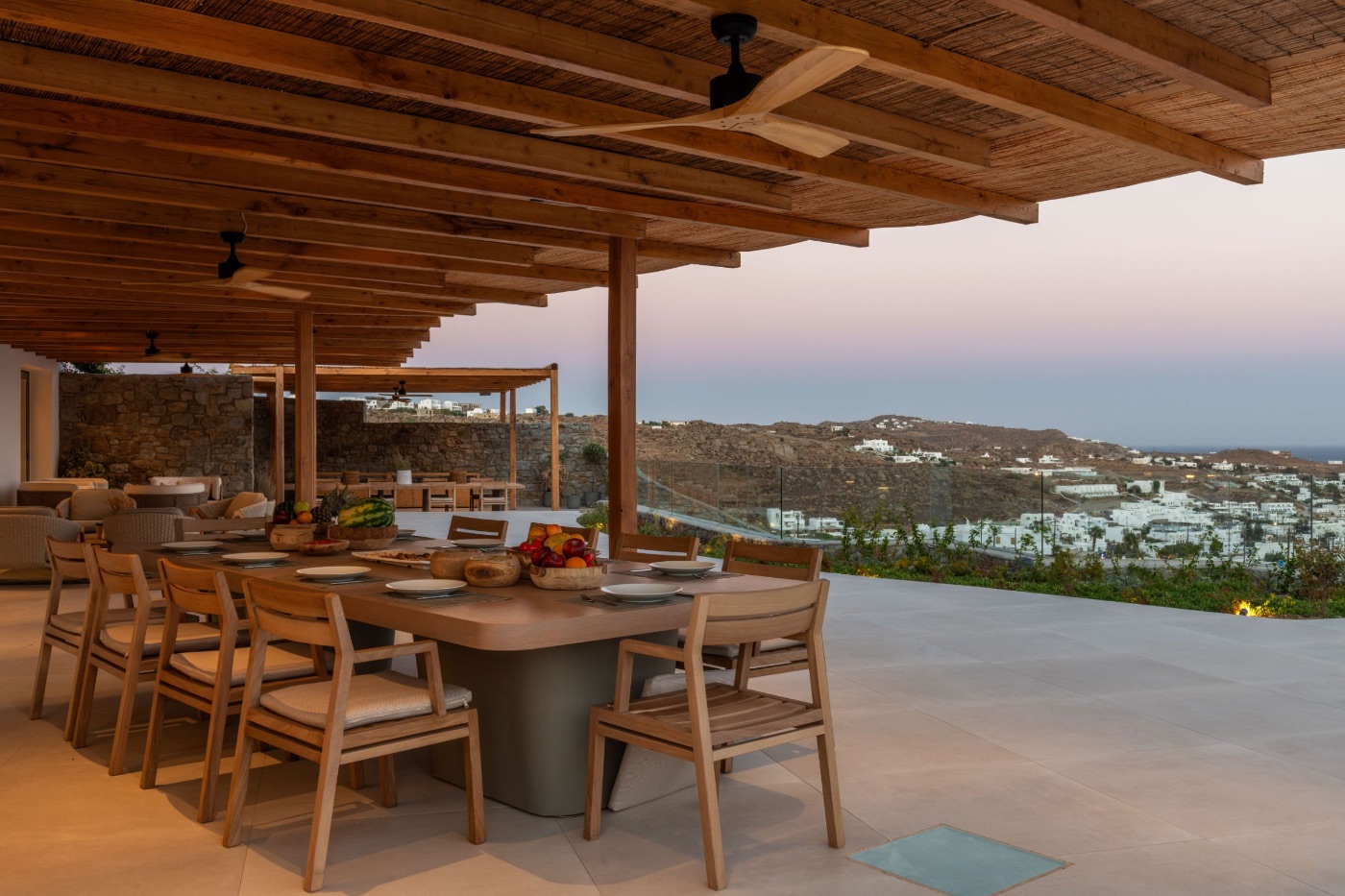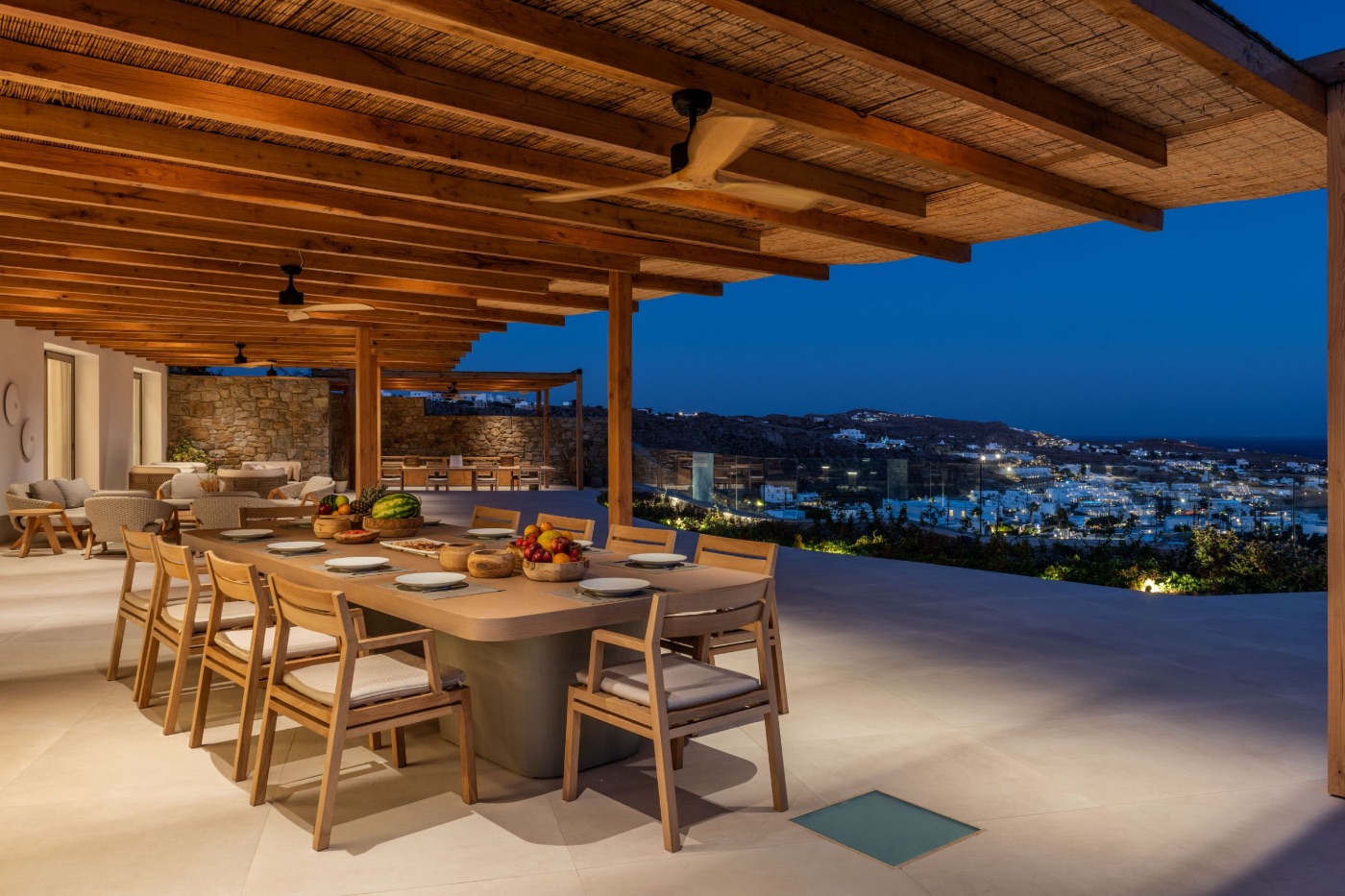 Open-air dining and lounge areas with panoramic vistas