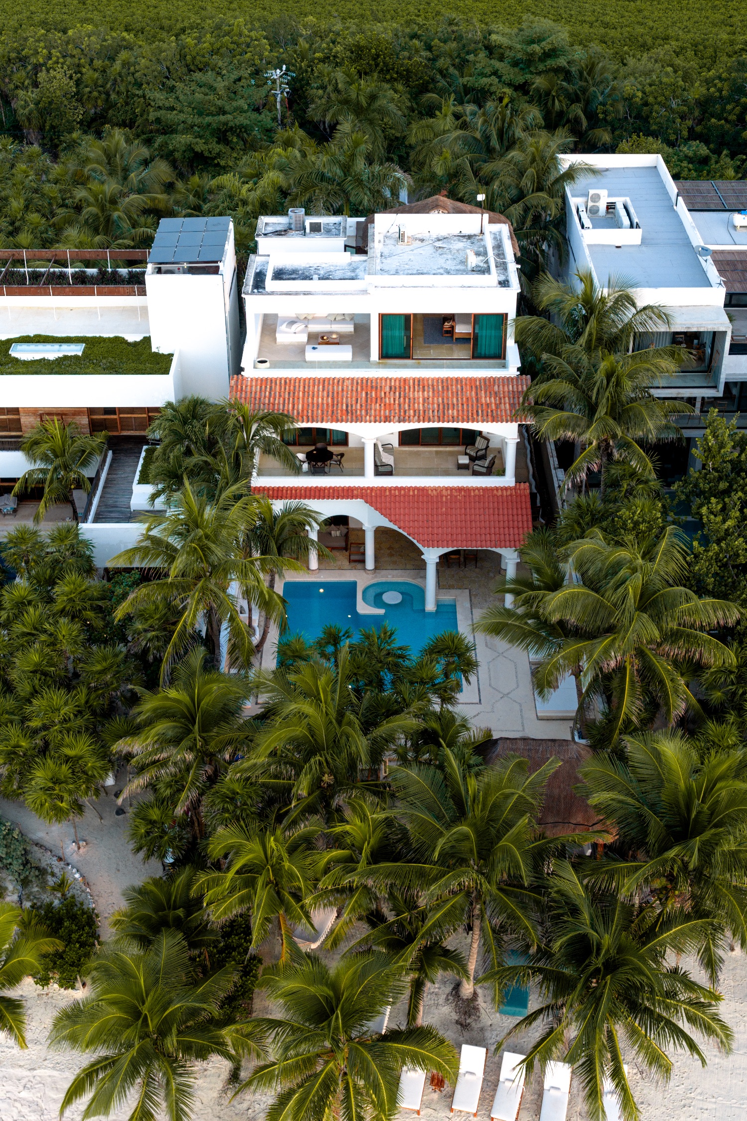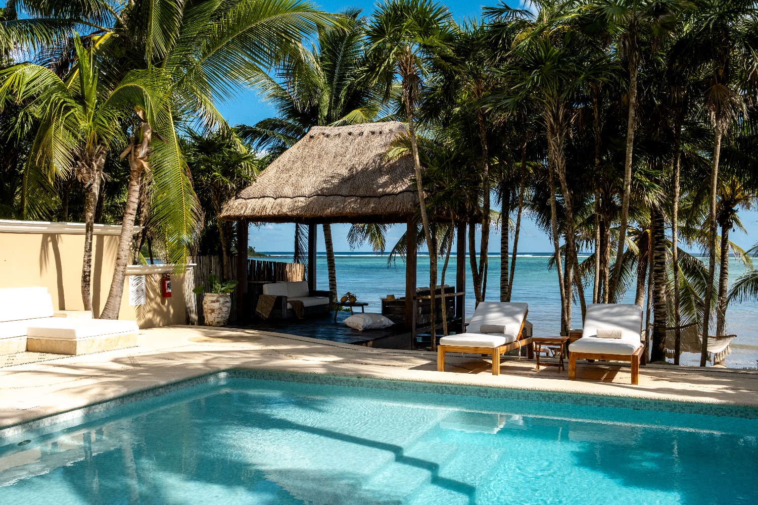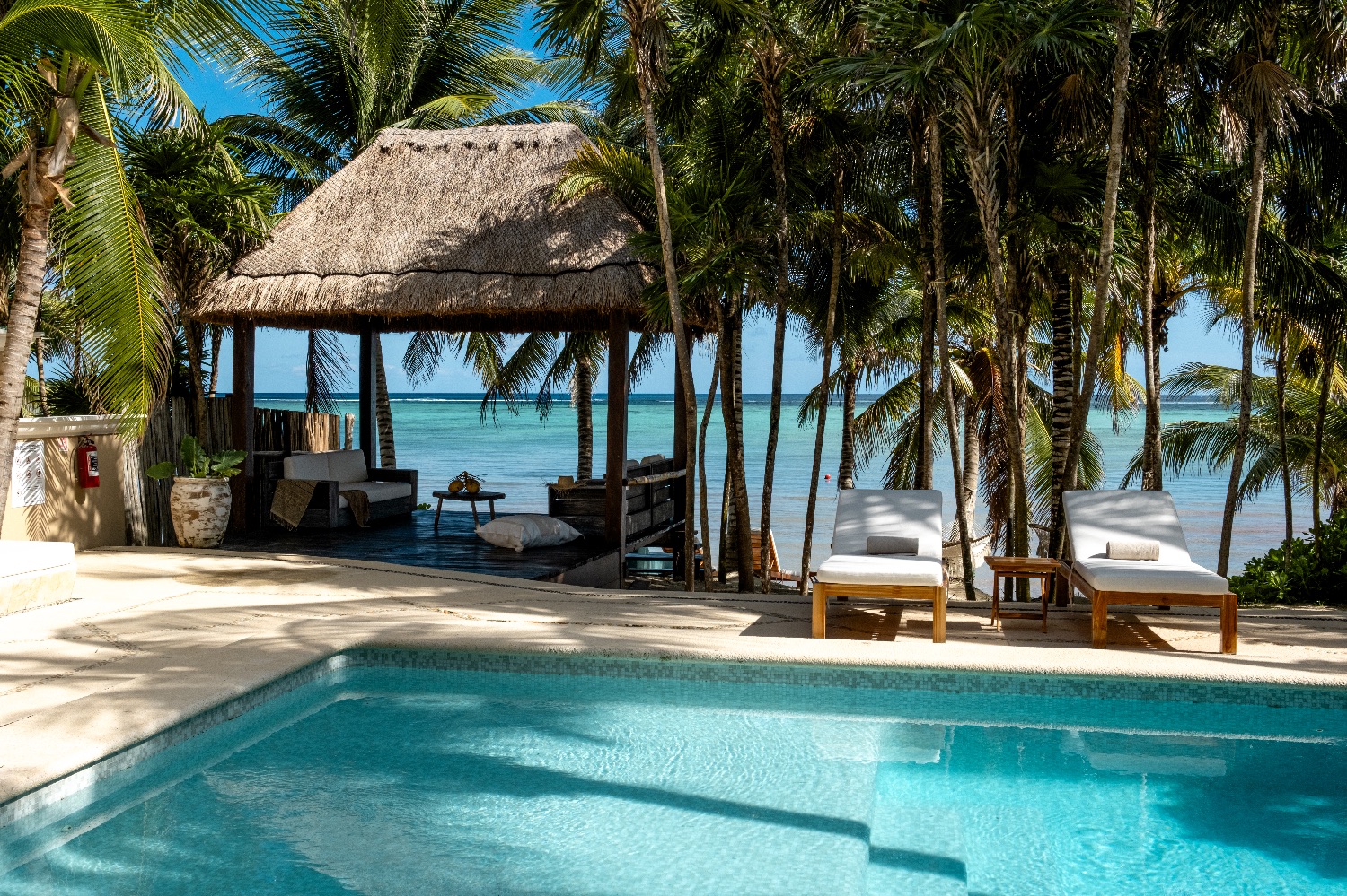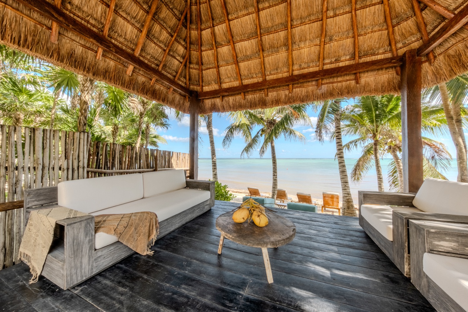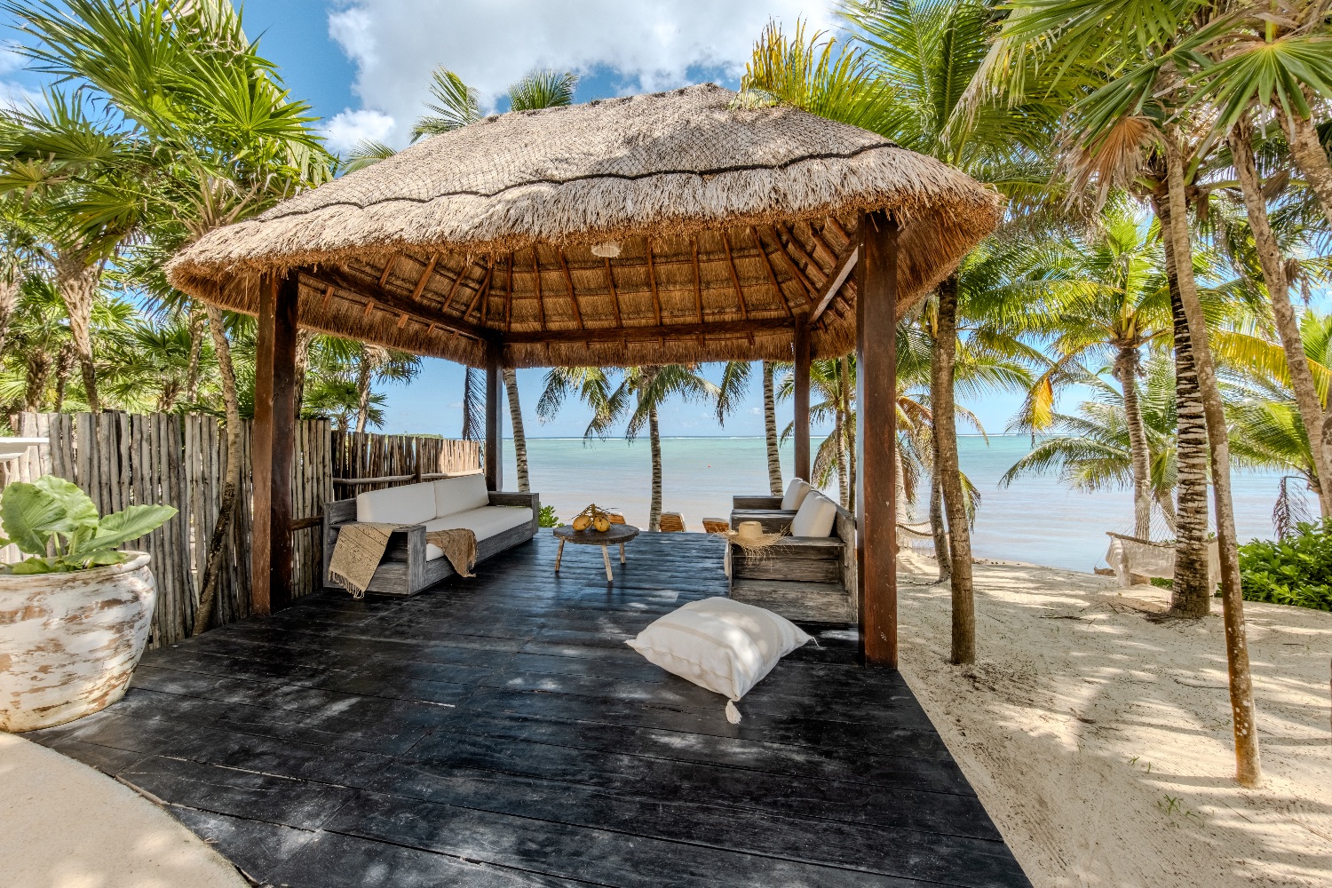 Beachside palapa dining; two outdoor lounges by the pool and one on the roof