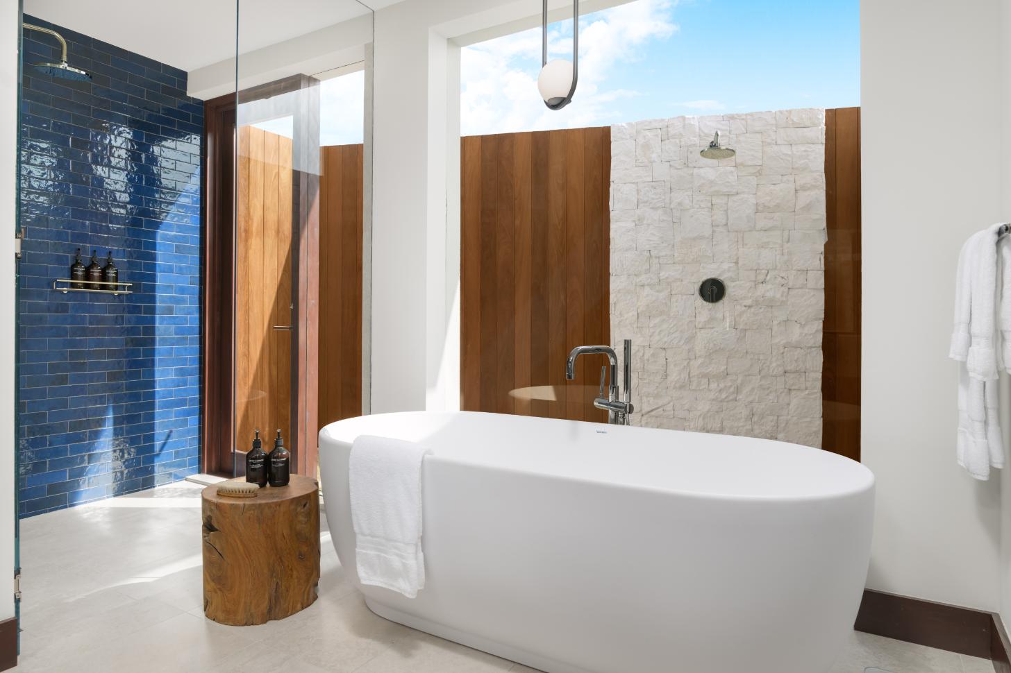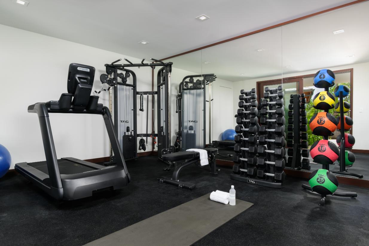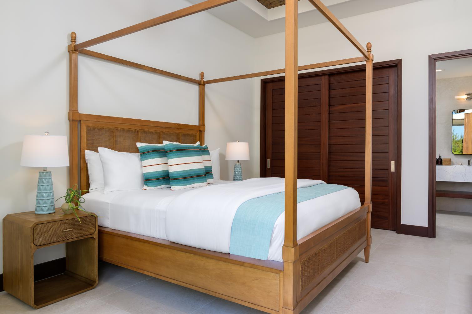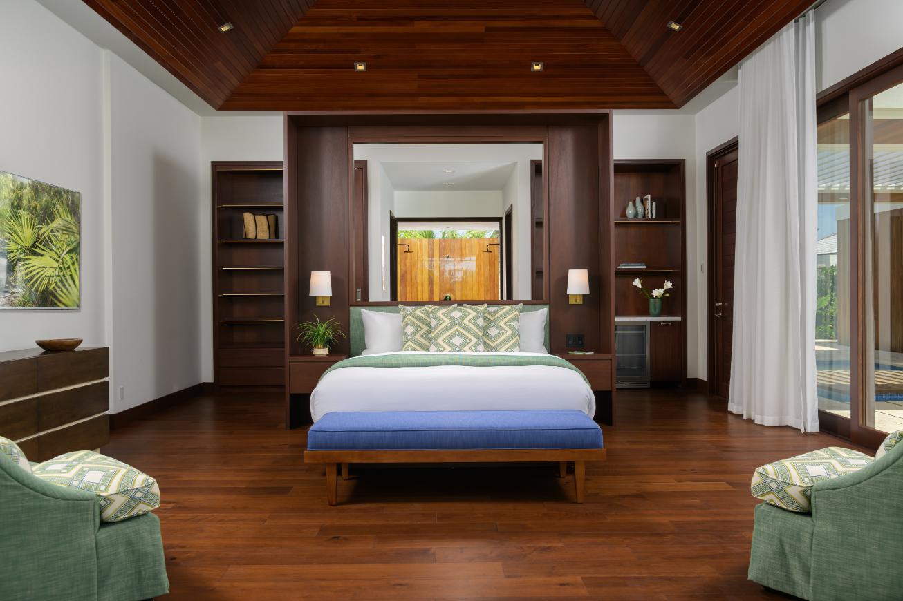 The atmosphere is cheerfully Caribbean, fresh, and welcoming as soon as you walk in. Airy yet grounded spaces are created by combining natural wood floors and pitched ceilings with vibrant textiles and artwork. With an open kitchen, a large dining table, and a comfortable seating area, the large great room unites everyone. Large sliding doors blur the line between the pool deck and the interiors, and a bonus games den keeps the fun going. The private, air-conditioned gym is set up for serious sessions without compromising vacation comfort for visitors who wish to maintain their routine.