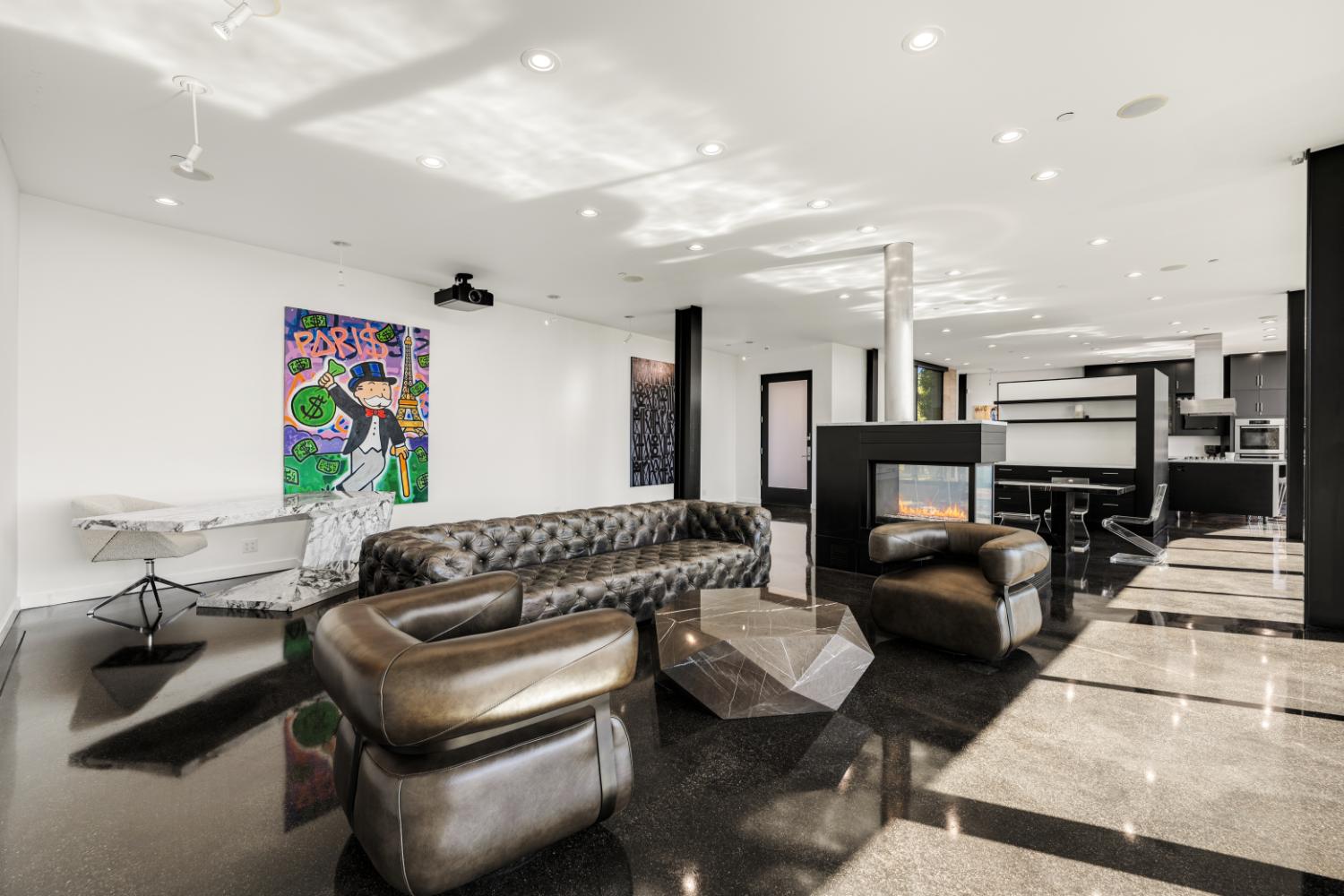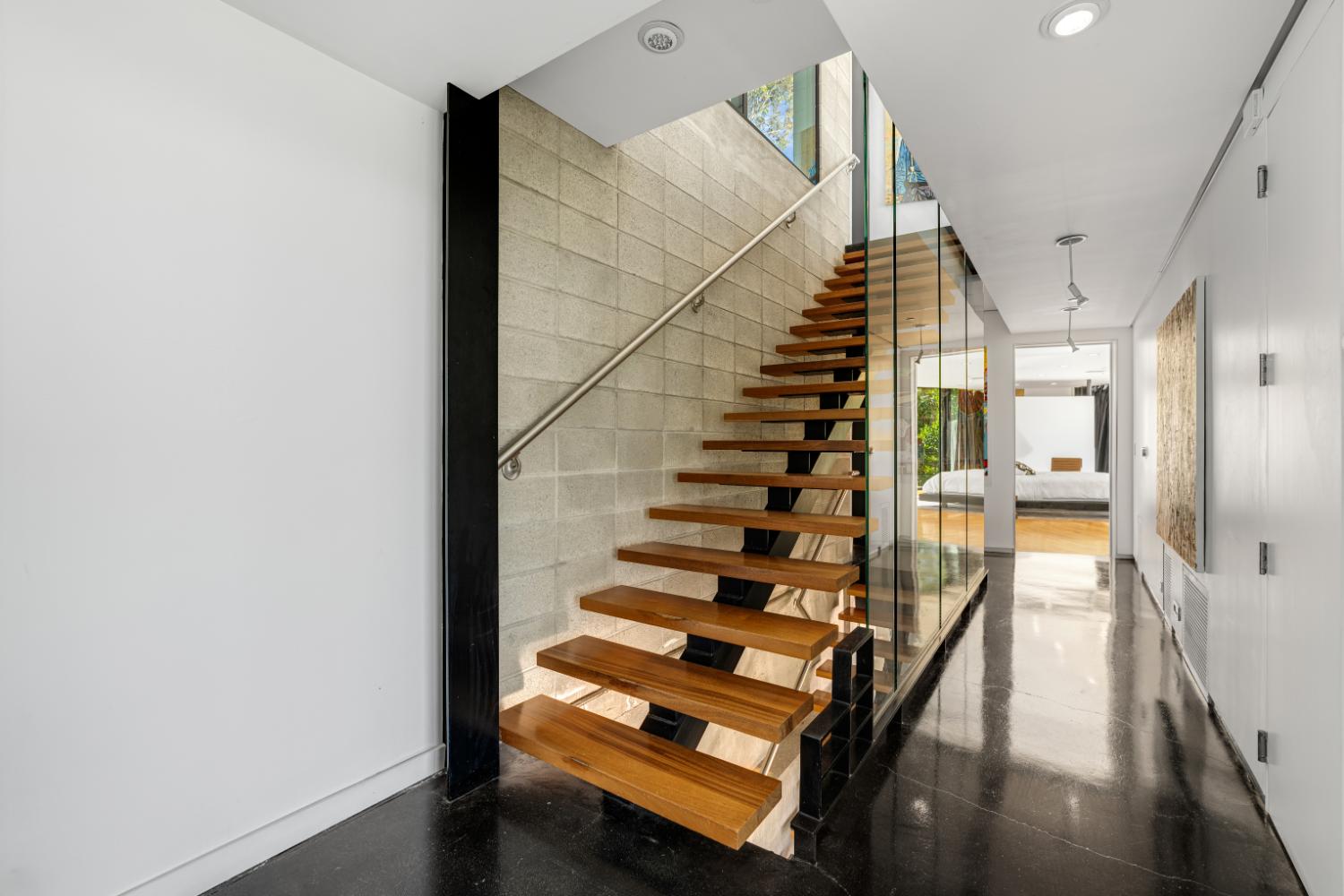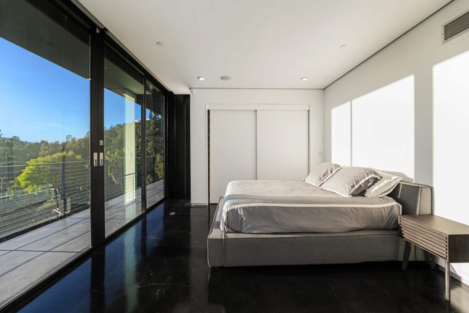 The site’s geometry becomes evident as soon as you enter the gated compound: a small footprint divided by cantilevered terraces and clean planes, each volume angled to frame a distinct section of the canyon. The exterior is muscular and honest: expanses of high-performance glazing that let in light without compromising thermal comfort, exposed concrete walls that retain the heat of the day, and a steel skeleton that makes precise gestures. The open floor plan becomes a choreography as soon as you walk through the doorway: sightlines extend from the entrance to the canyon’s edge, communal areas unfurl into private alcoves, and the line separating inside and outside is smooth and purposeful.