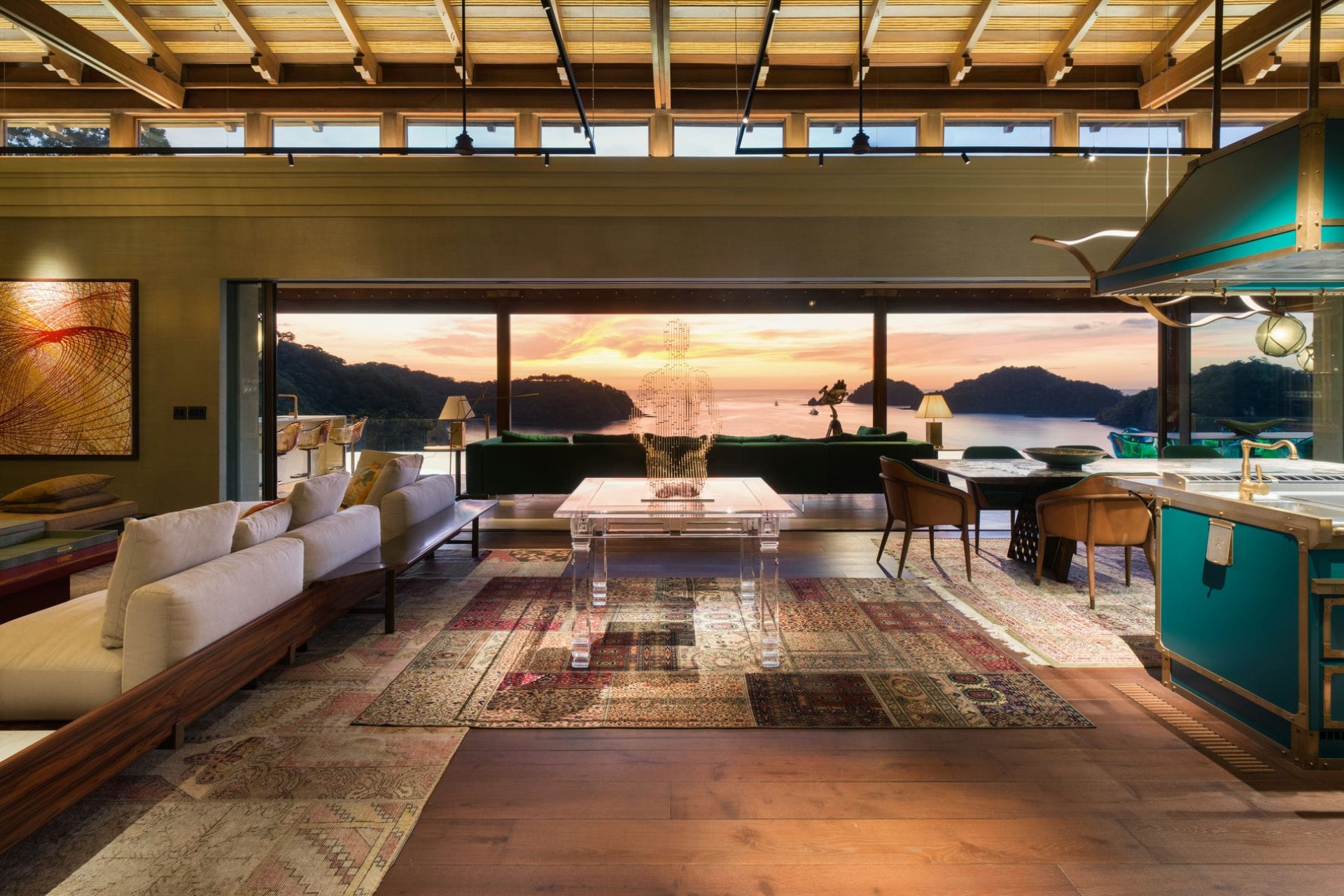 Inside, the villa unfolds through an open-plan design framed by floor-to-ceiling glass. Living areas flow effortlessly into the terrace, allowing ocean breezes and natural light to permeate every space. A plush lounge invites relaxation, while the dining area sits between the vibrant show kitchen and outdoor terrace—creating a fluid, immersive dining experience.