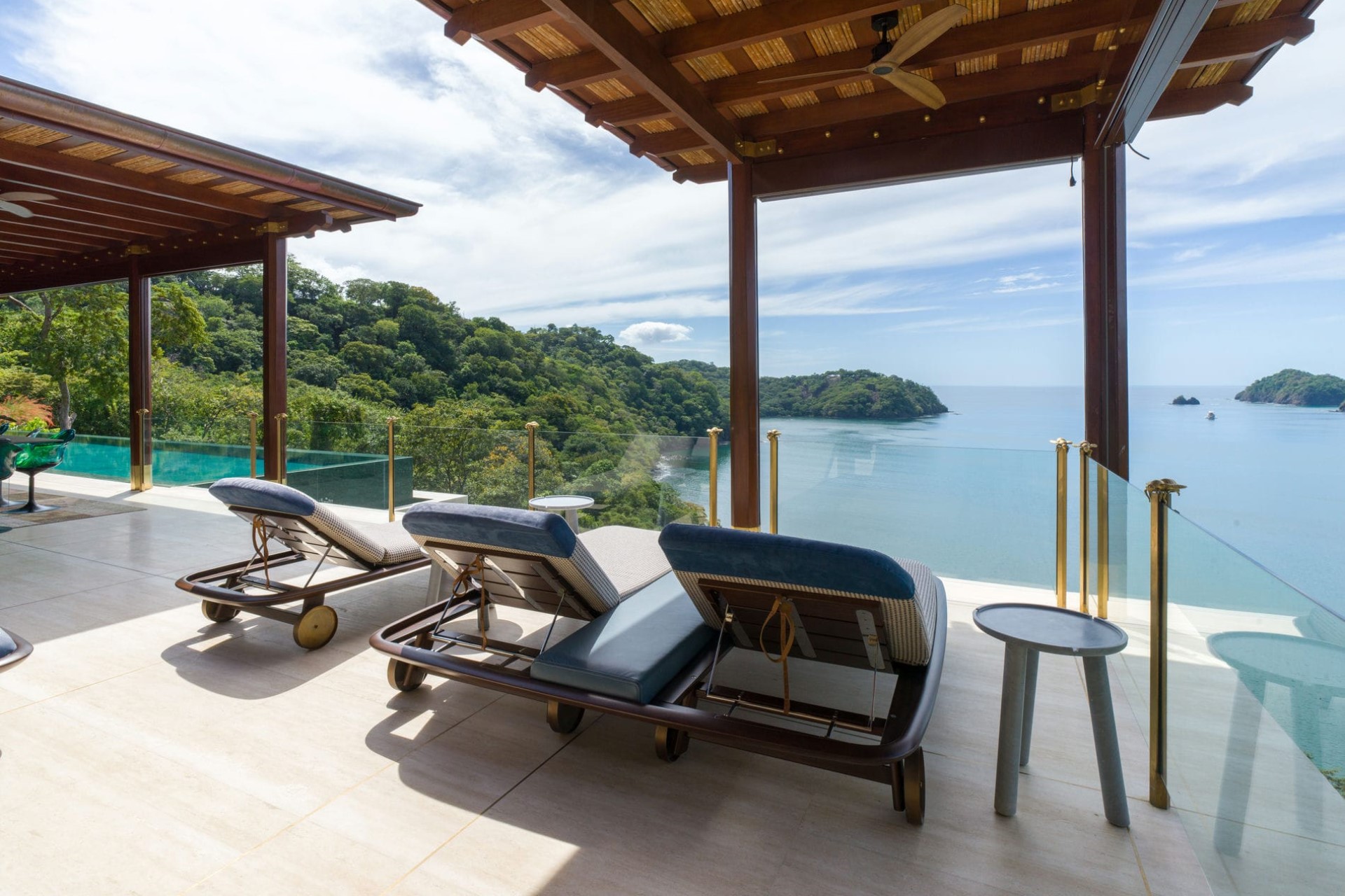 The architectural focal point of the estate is its sweeping infinity pool, positioned to dissolve into the Pacific beyond. Expansive terraces stretch across the upper level, creating a natural extension of the interior living spaces. Sun loungers, shaded lounges, and a dedicated cocktail area frame the pool, offering a front-row seat to Costa Rica’s vibrant sunsets.