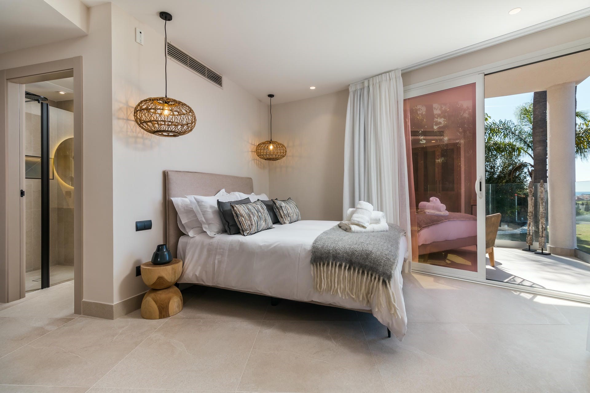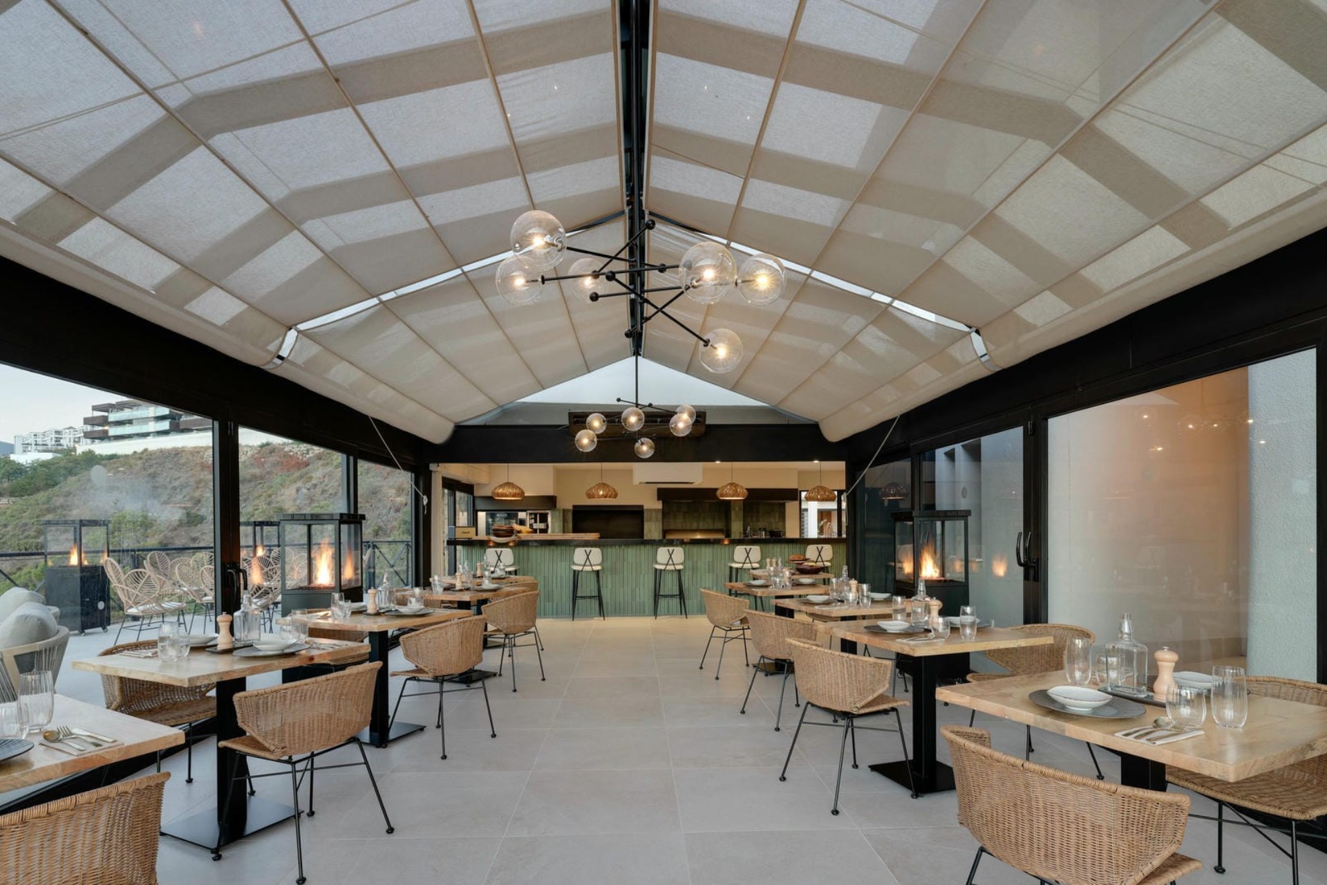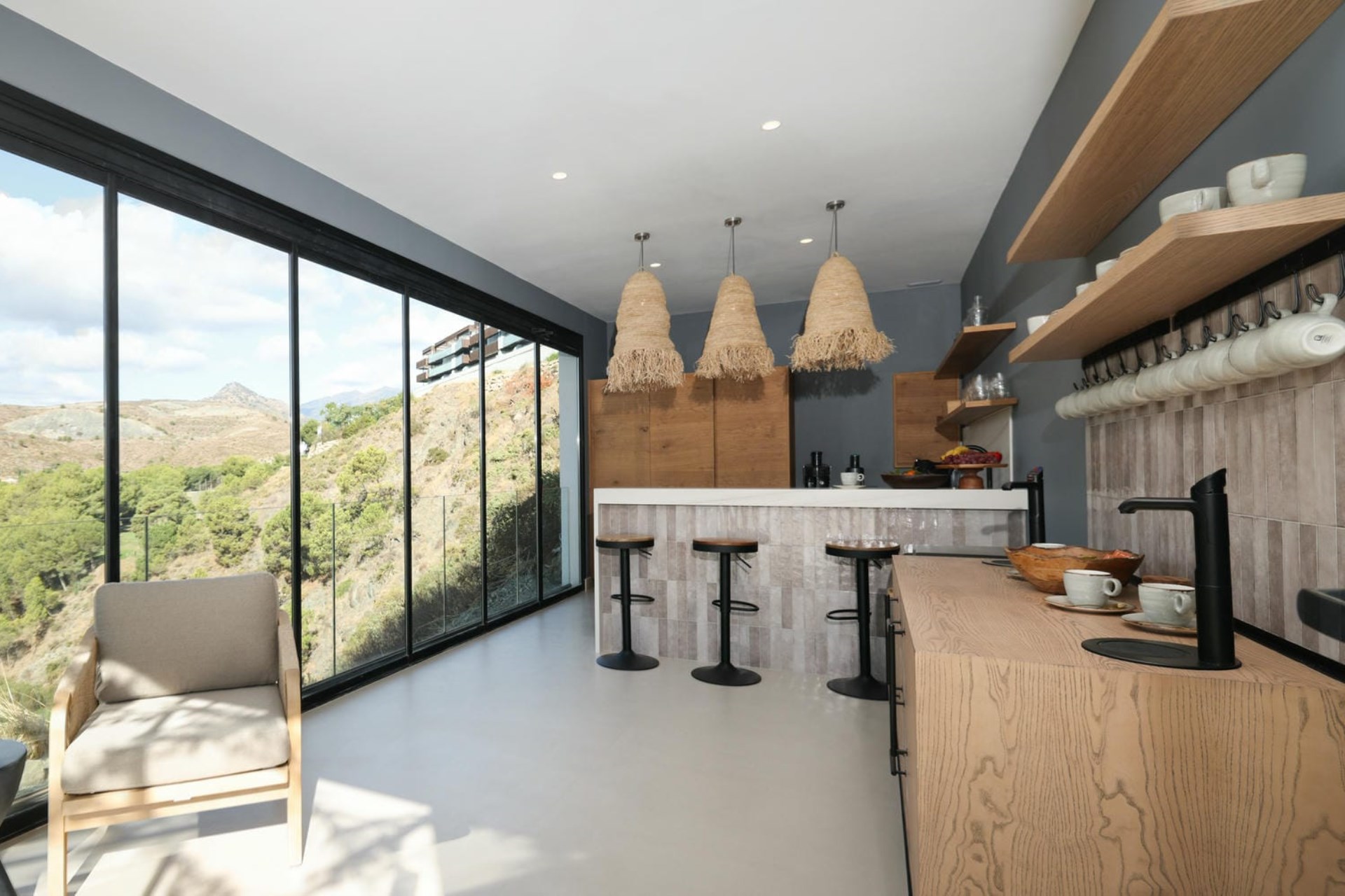 Inside, contemporary architecture meets Andalusian light. High-ceilinged lounges with bi-fold doors blur boundaries between indoors and out. A private restaurant—with indoor and alfresco seating—frames wide views across the hills to the Mediterranean beyond, creating effortless spaces for gathering and dining.