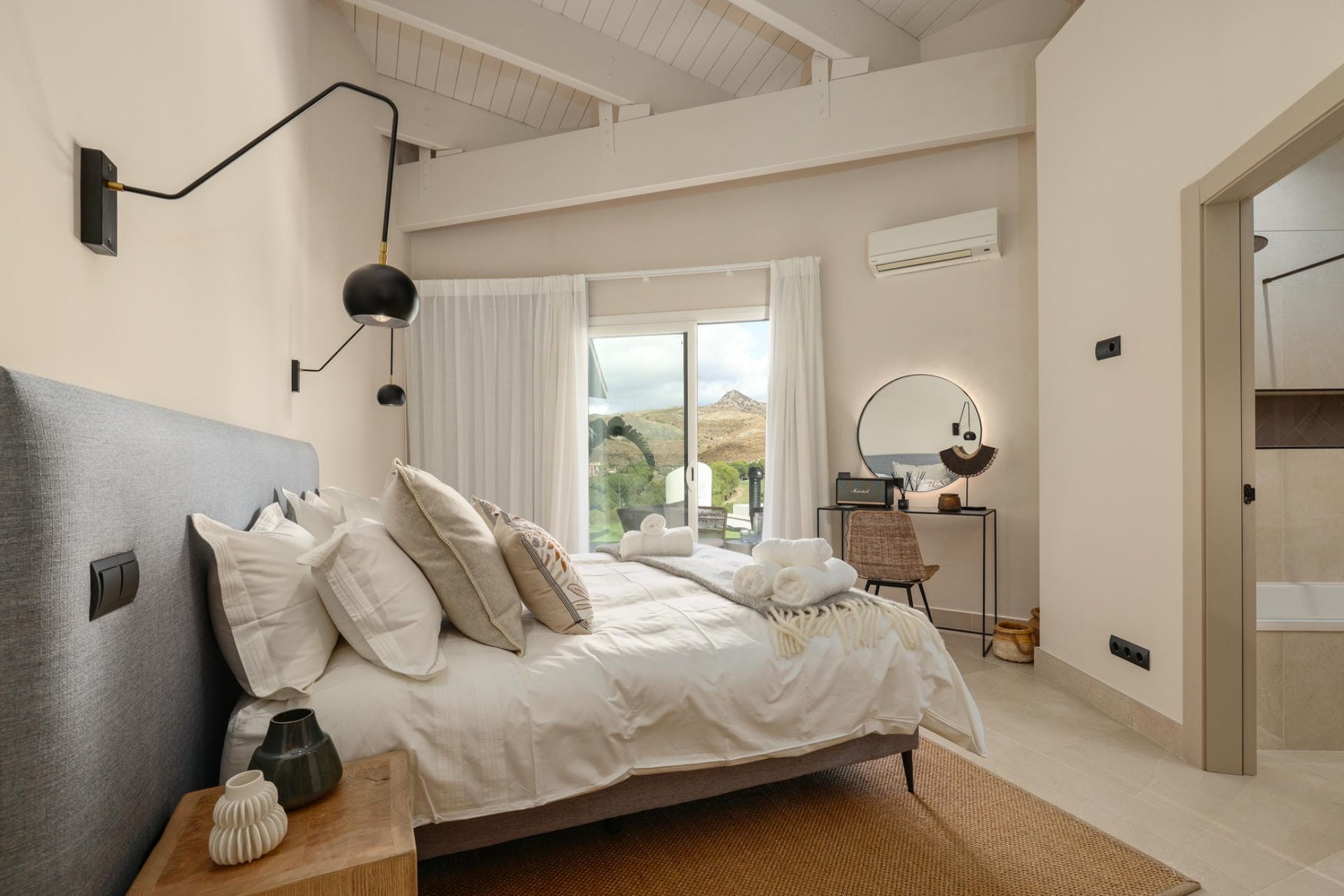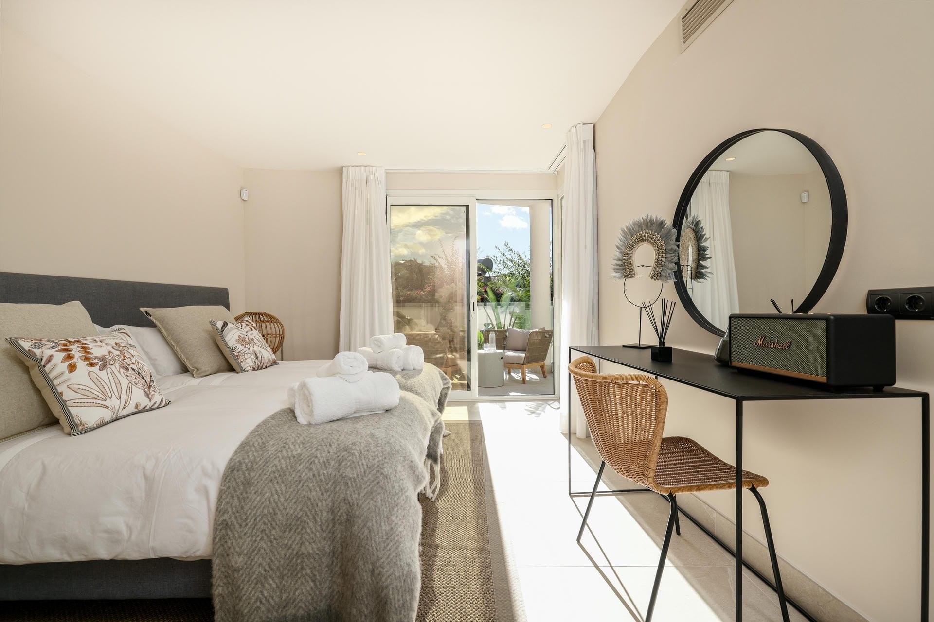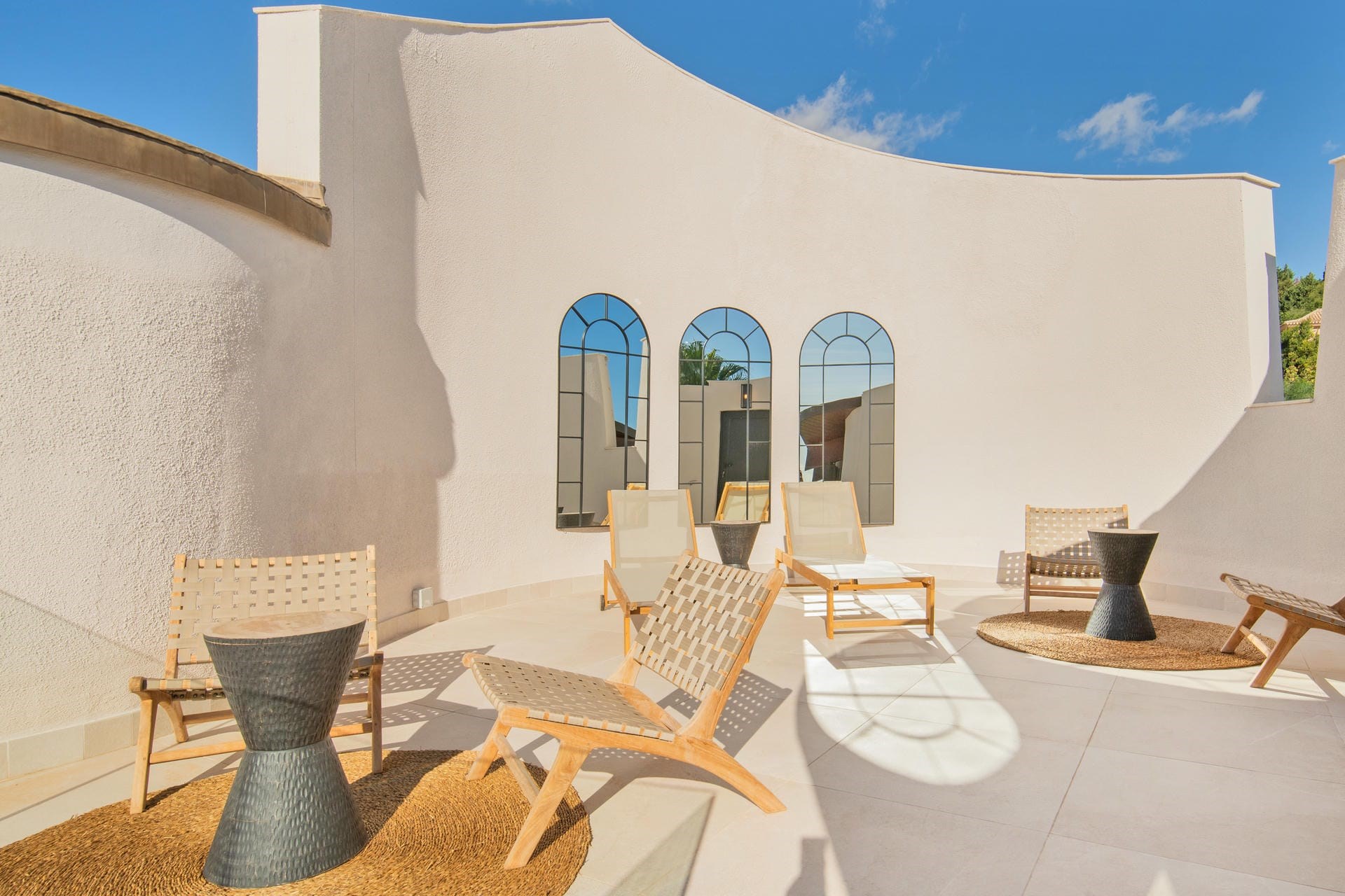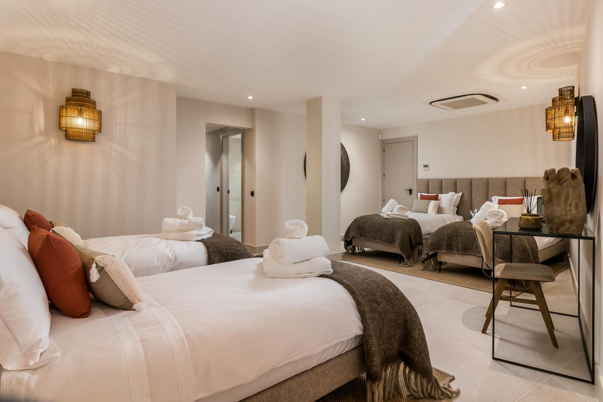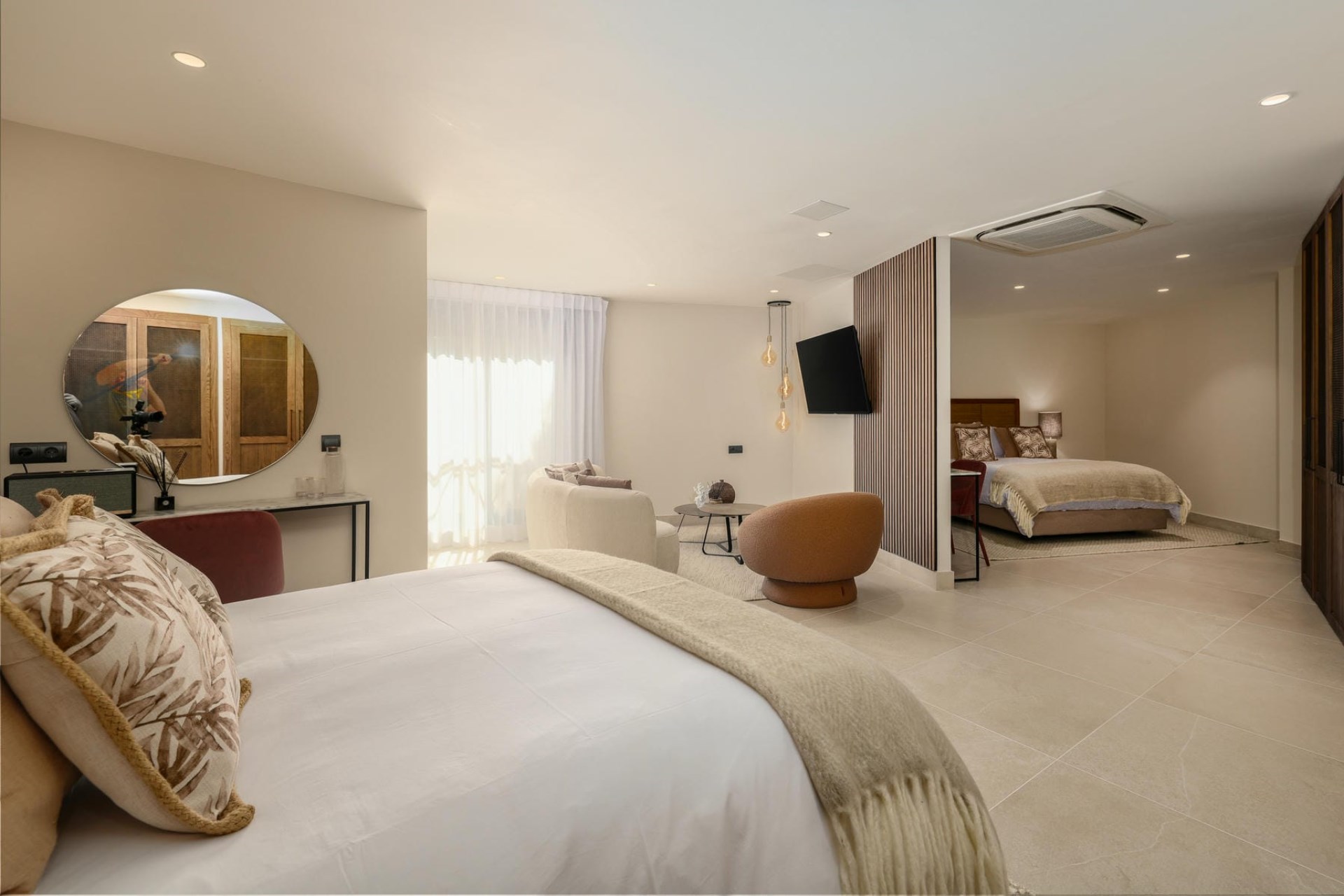 The estate sleeps up to 32 guests across 14 suites. The main villa spans three floors with nine bedrooms, many opening to private terraces. A separate studio suite adds its own living room, kitchenette, and tranquil courtyard. The guest house comprises four additional bedrooms, all set around the central courtyard for easy, connected living.