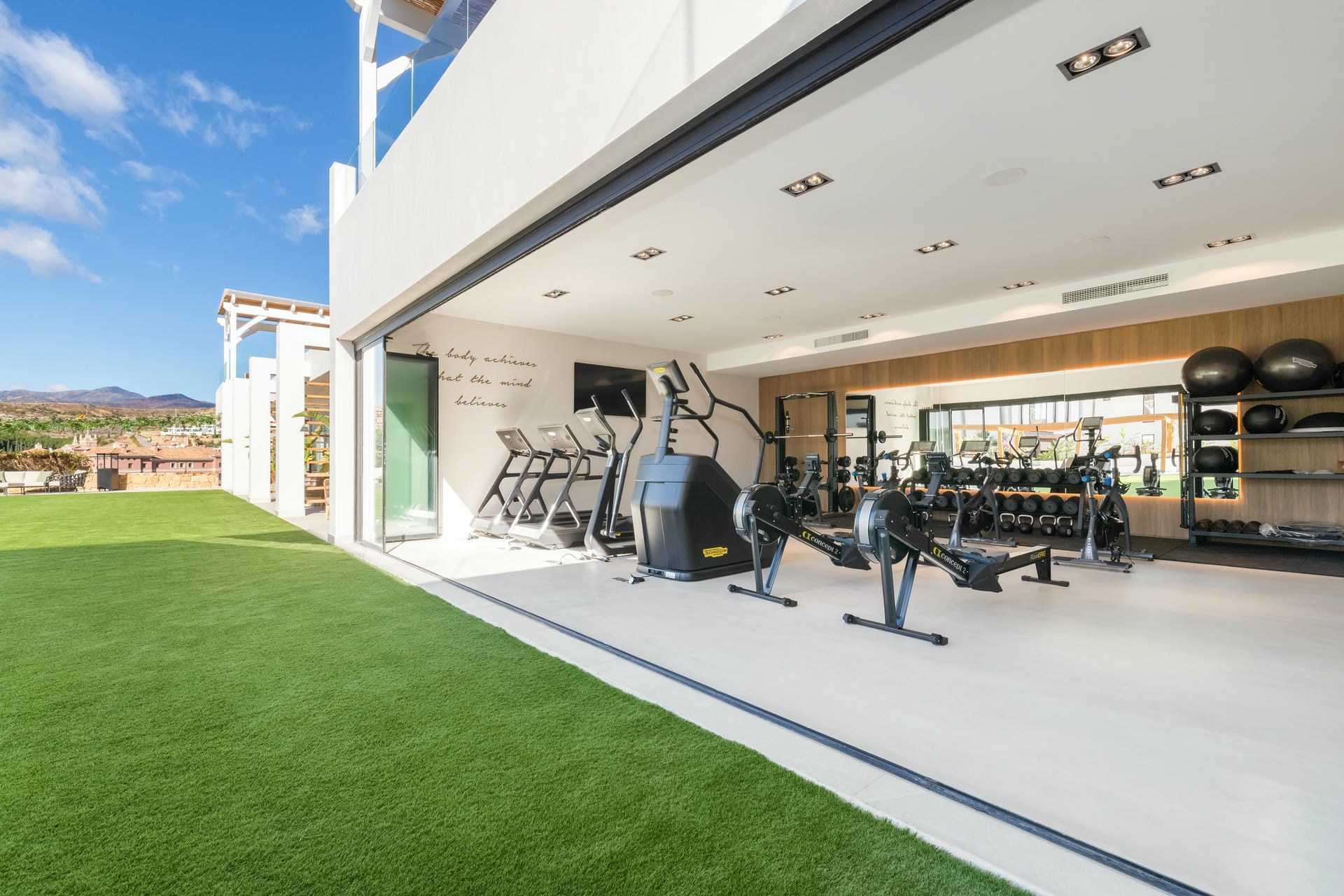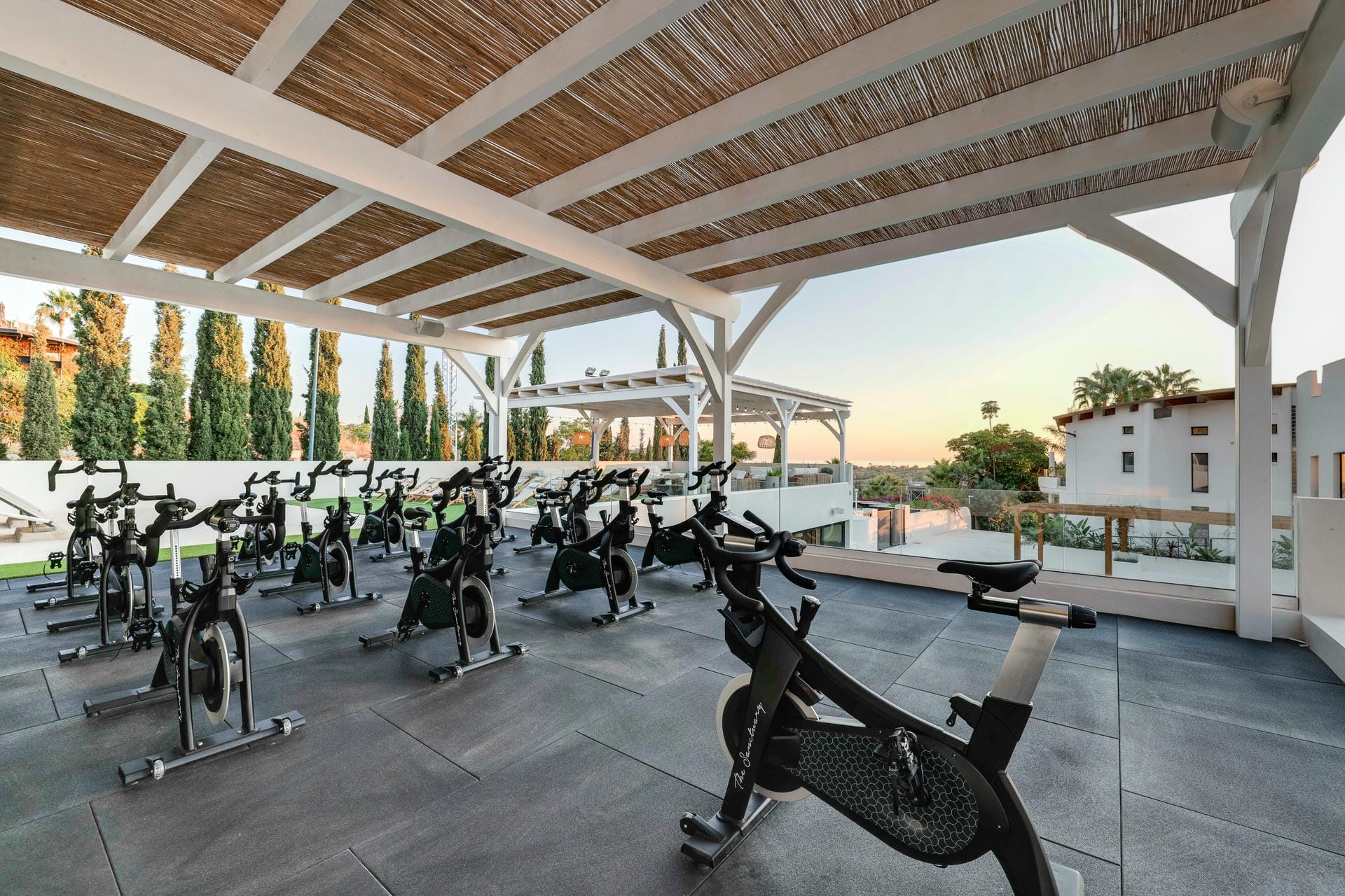 A lush courtyard garden separates the main villa from the guest house—an adaptable open-air stage for everything from morning yoga to wedding cocktails. Above, broad roof terraces extend daily life outdoors. One is designed as a private cinema beneath the stars; another hosts a rooftop spin studio with multiple bikes for energizing sessions with panoramic vistas.