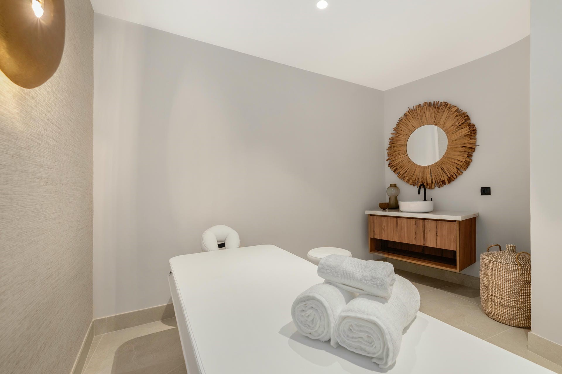 Wellness flows through the property. Opening to the courtyard are a dedicated yoga studio and a fully equipped gym featuring top-of-the-range Technogym machines, free weights, and boxing pads. Post-workout, the Juice Bar serves healthy refreshments overlooking the neighboring golf course. For deeper relaxation, the private spa offers treatment rooms, an indoor heated pool, sauna, and steam room.