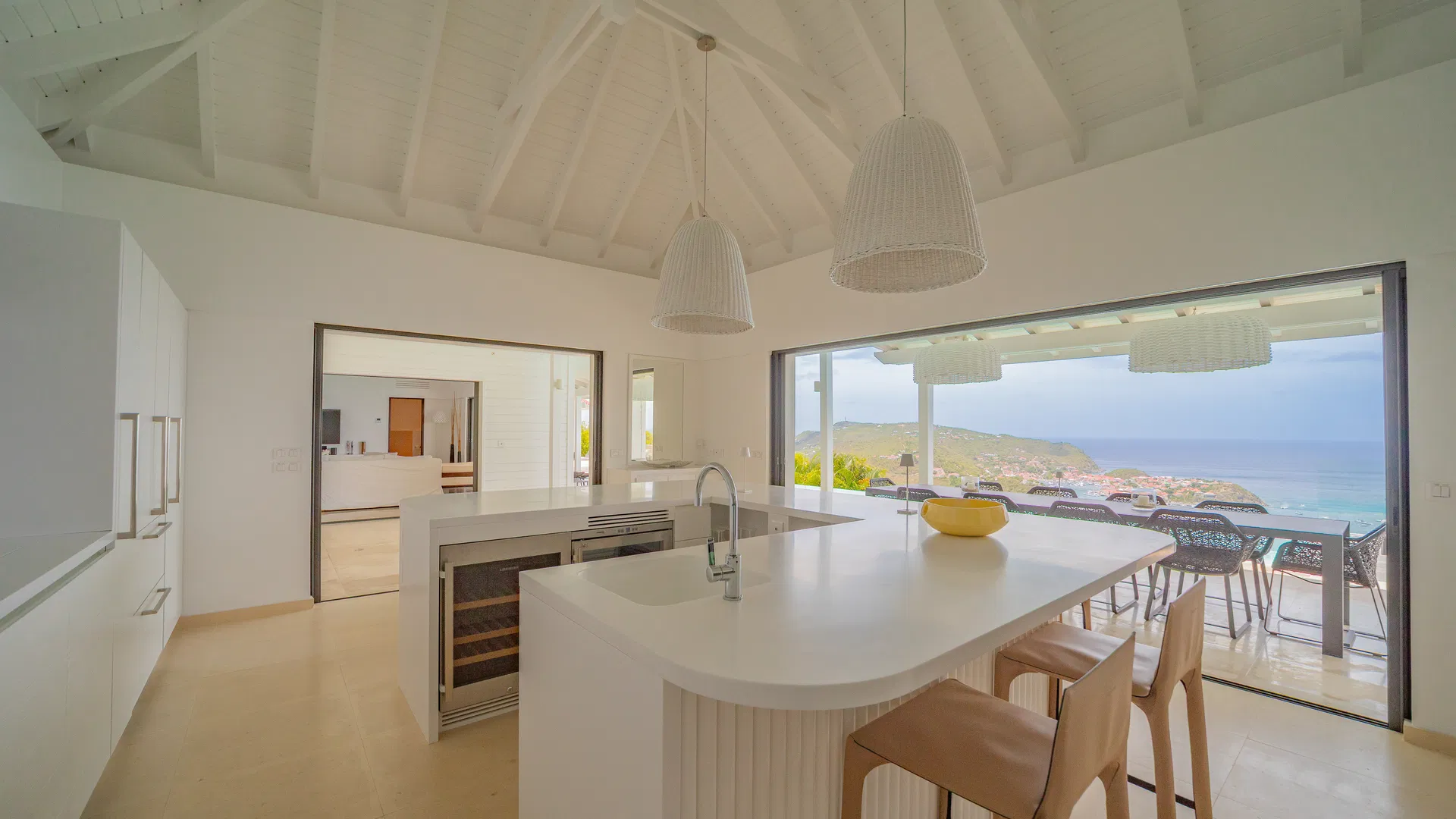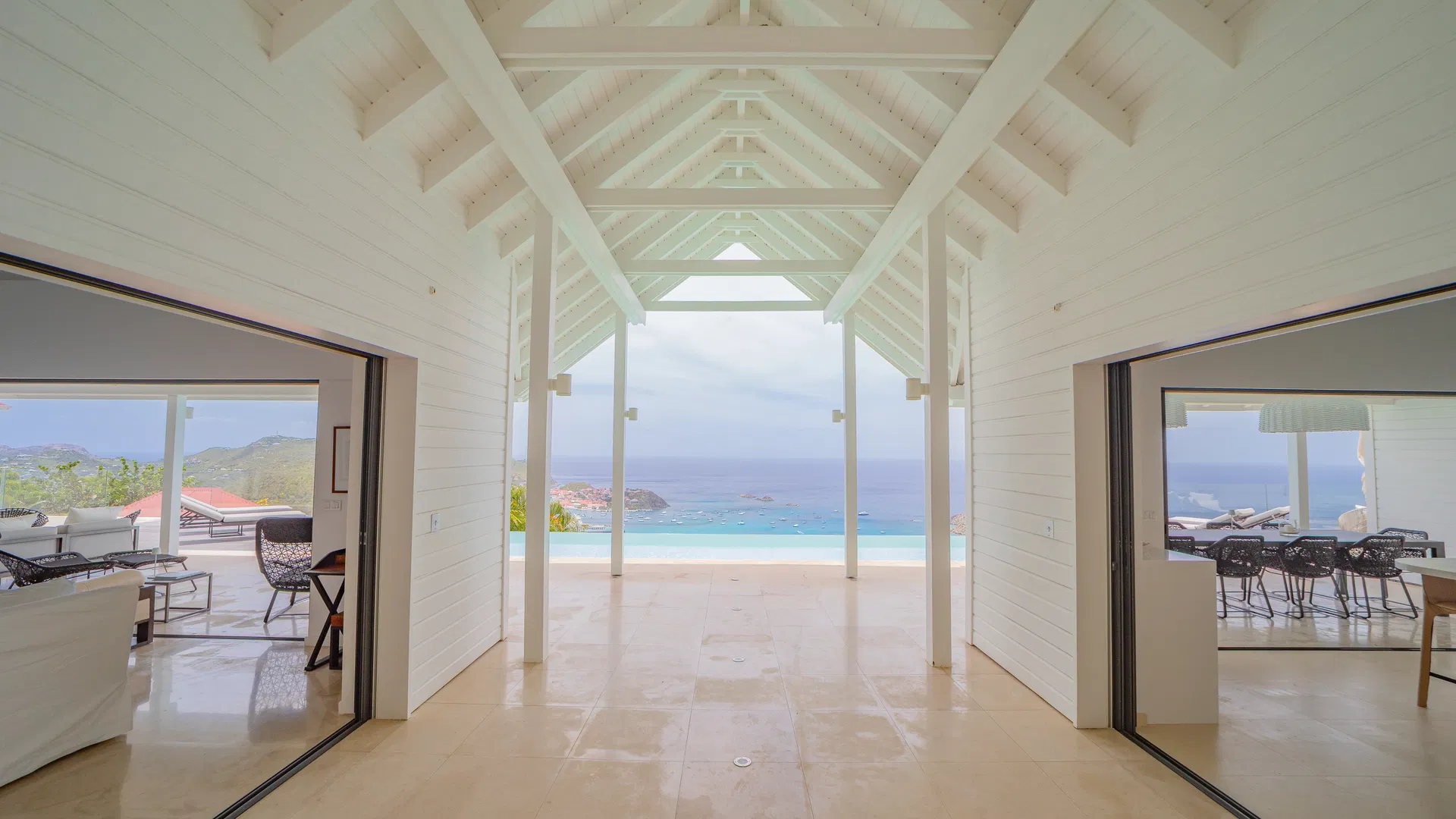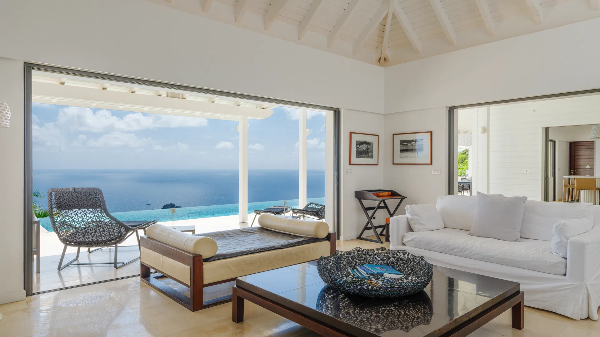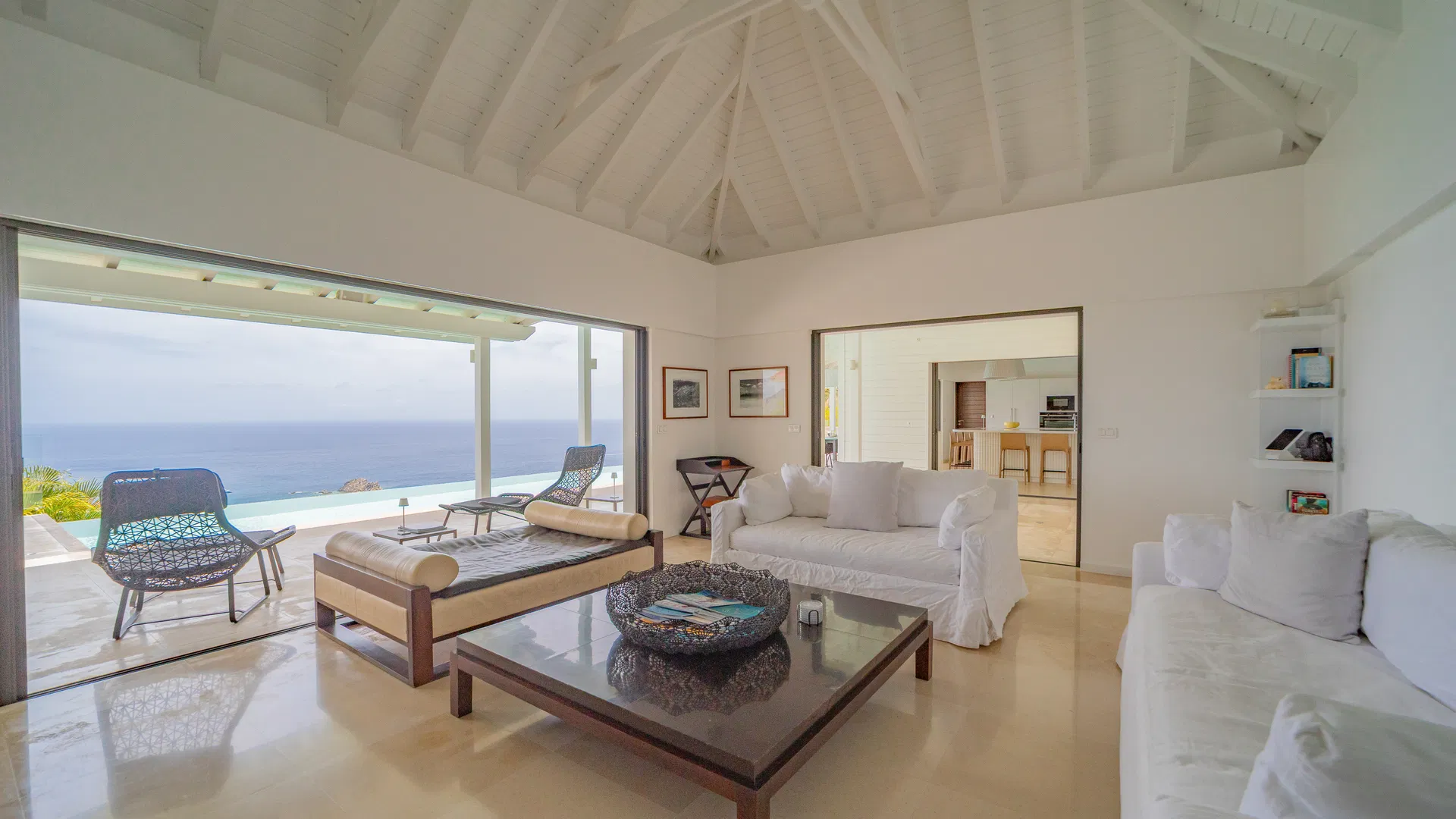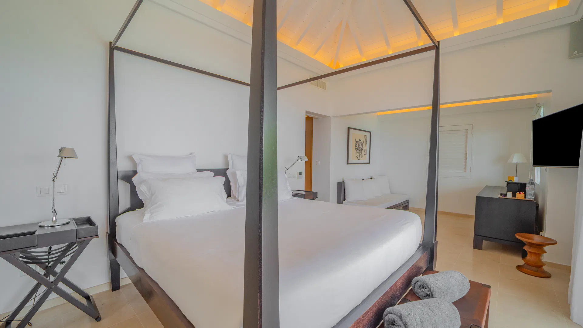 Elegance is felt, not declared, within. Designer leather and parchment pieces add a tactile richness that complements the island’s light, while earthy, natural colors ground the rooms. The living room opens completely to the terrace, where the infinity pool appears to spill into the ocean and the view stretches uninterrupted from the harbor to far-off silhouettes on the water. Evenings huddle around the fire-lit glow of sunset, when the sky turns copper and rose and the yachts become necklaces of light, while afternoons linger here as sails drift across Gustavia.