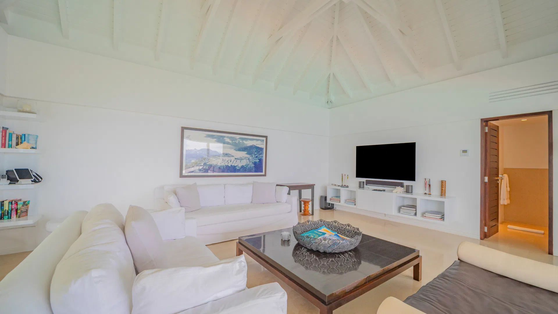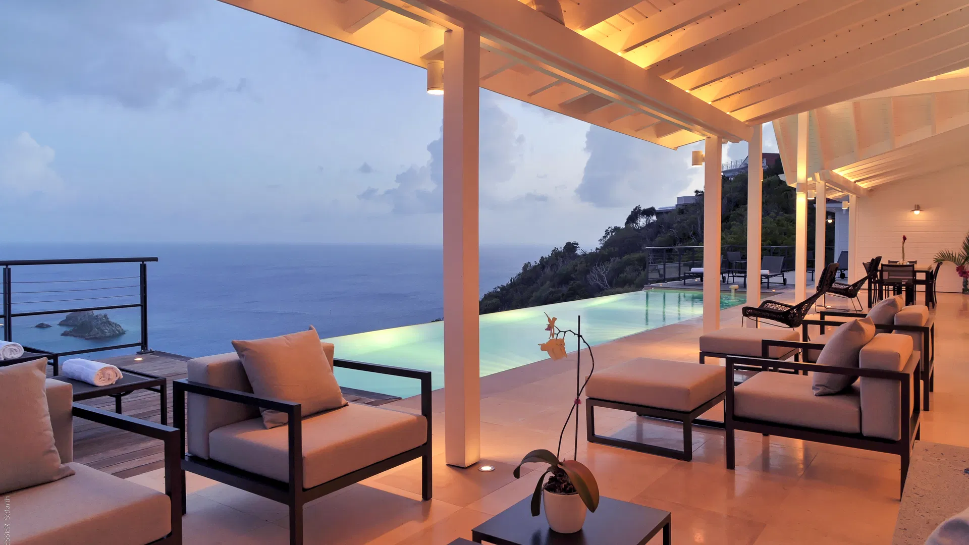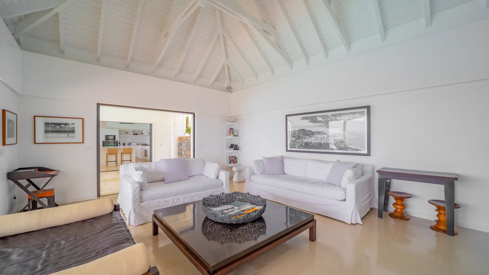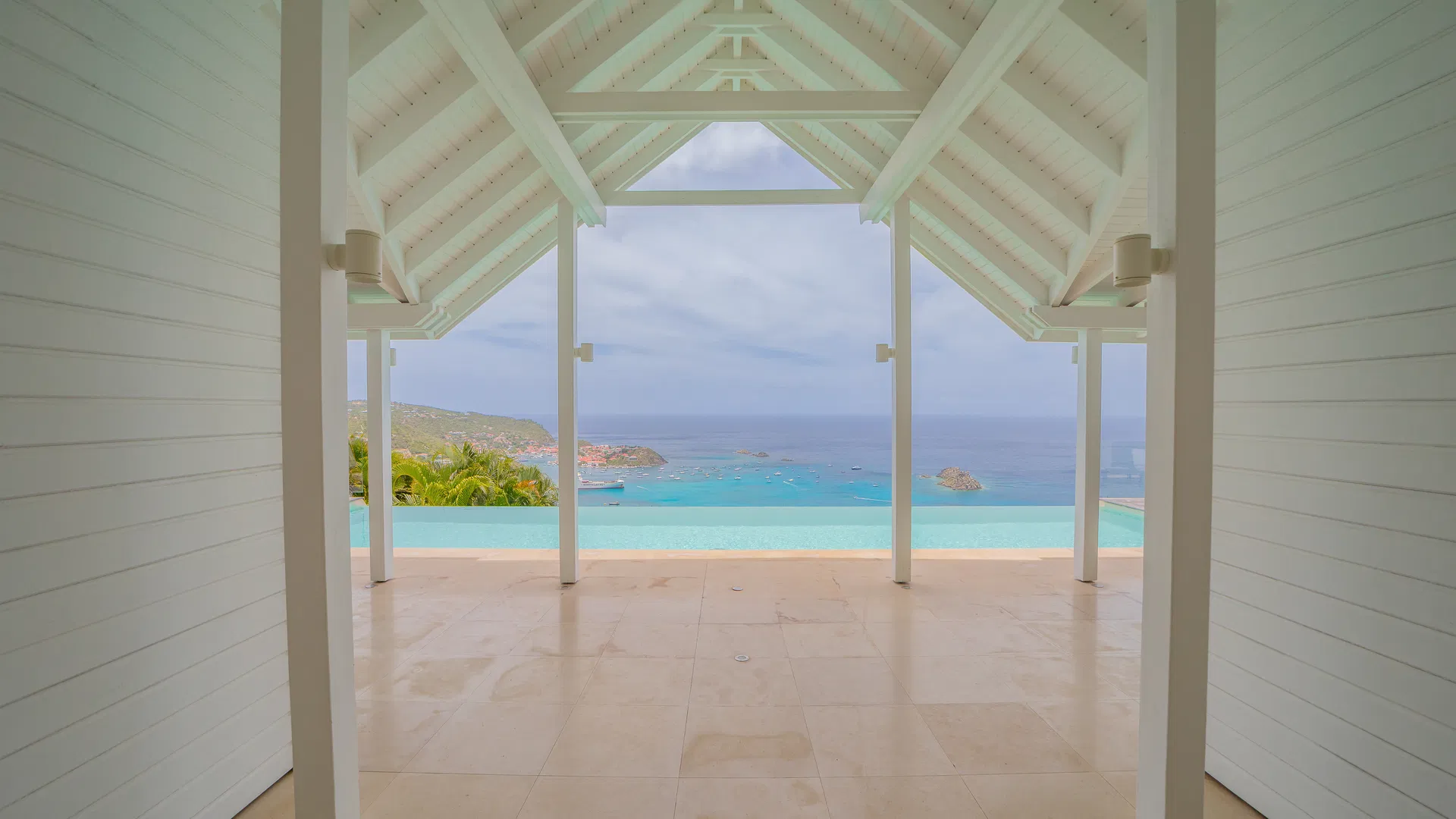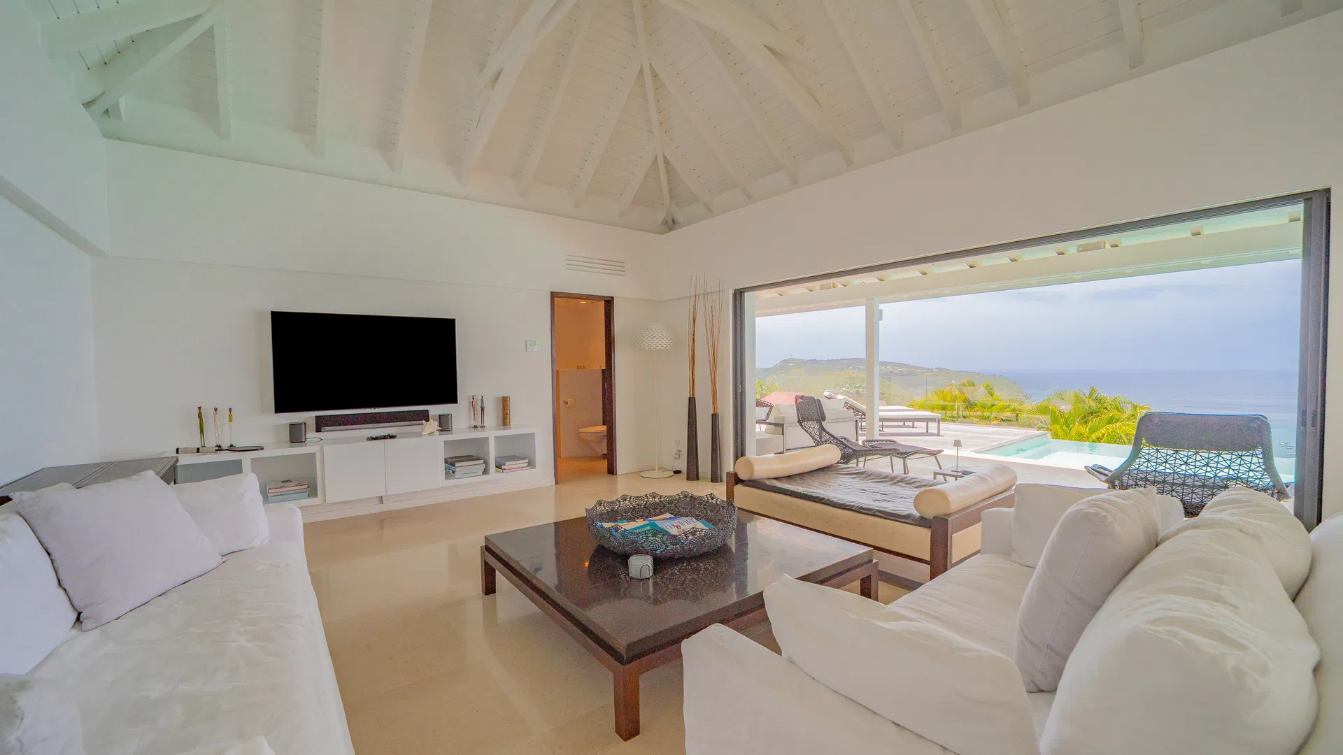 Elegance is felt, not declared, within. Designer leather and parchment pieces add a tactile richness that complements the island’s light, while earthy, natural colors ground the rooms. The living room opens completely to the terrace, where the infinity pool appears to spill into the ocean and the view stretches uninterrupted from the harbor to far-off silhouettes on the water. Evenings huddle around the fire-lit glow of sunset, when the sky turns copper and rose and the yachts become necklaces of light, while afternoons linger here as sails drift across Gustavia.