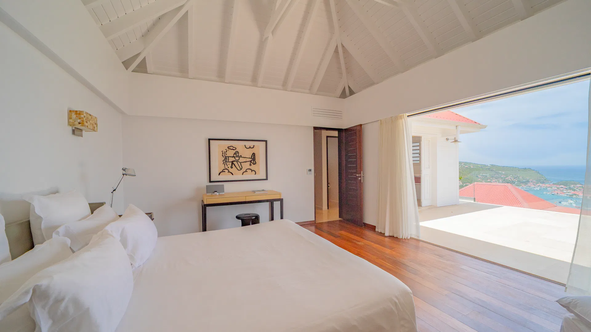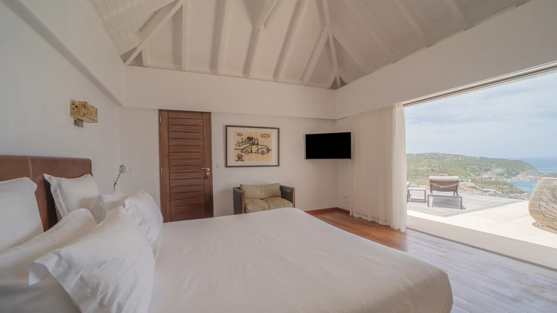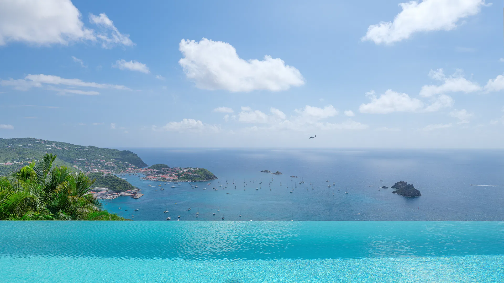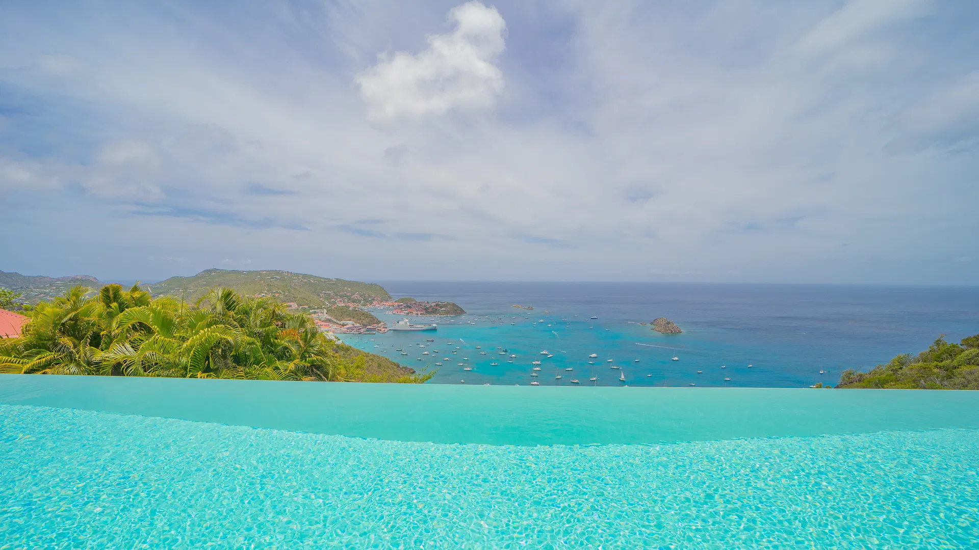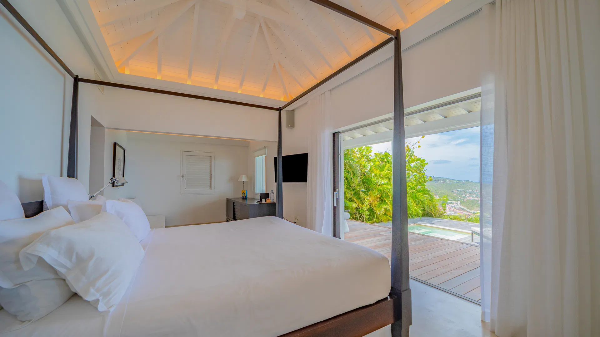 Elegance is felt, not declared, within. Designer leather and parchment pieces add a tactile richness that complements the island’s light, while earthy, natural colors ground the rooms. The living room opens completely to the terrace, where the infinity pool appears to spill into the ocean and the view stretches uninterrupted from the harbor to far-off silhouettes on the water. Evenings huddle around the fire-lit glow of sunset, when the sky turns copper and rose and the yachts become necklaces of light, while afternoons linger here as sails drift across Gustavia.