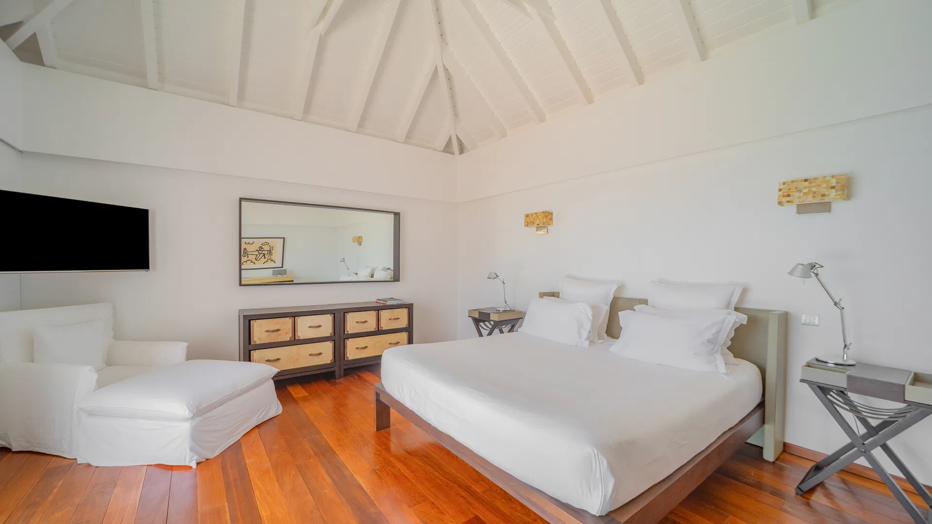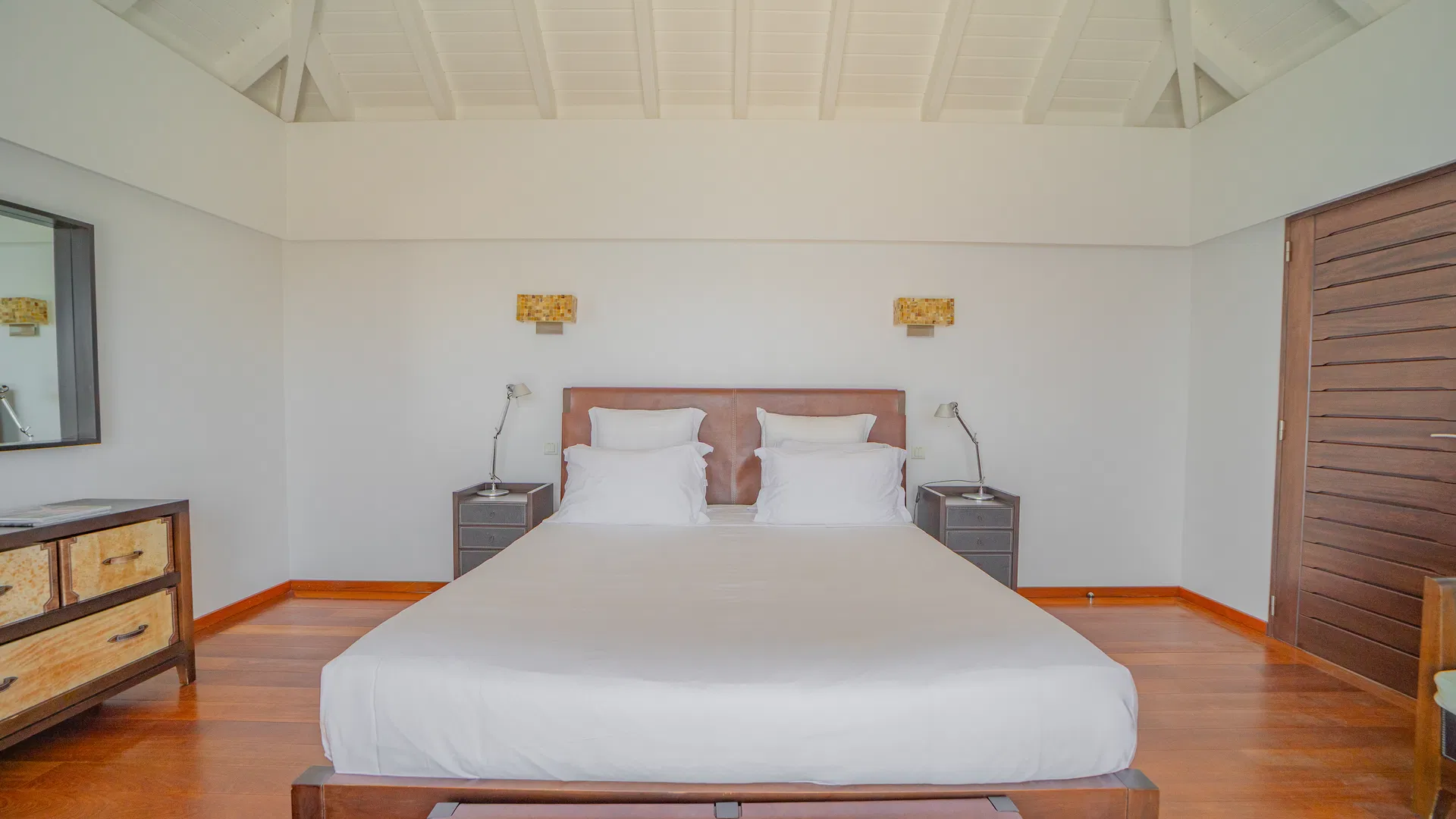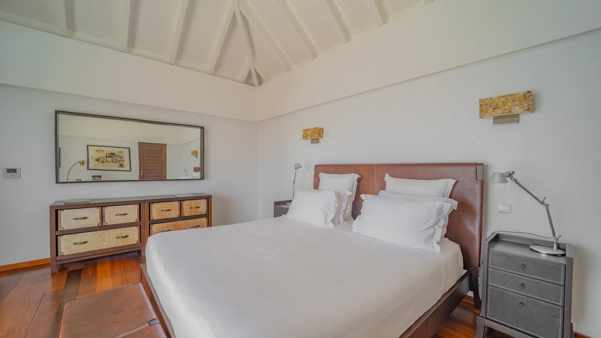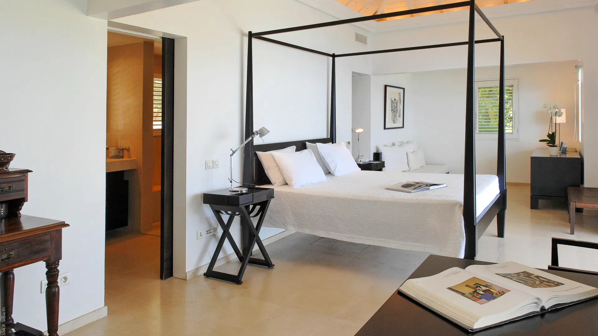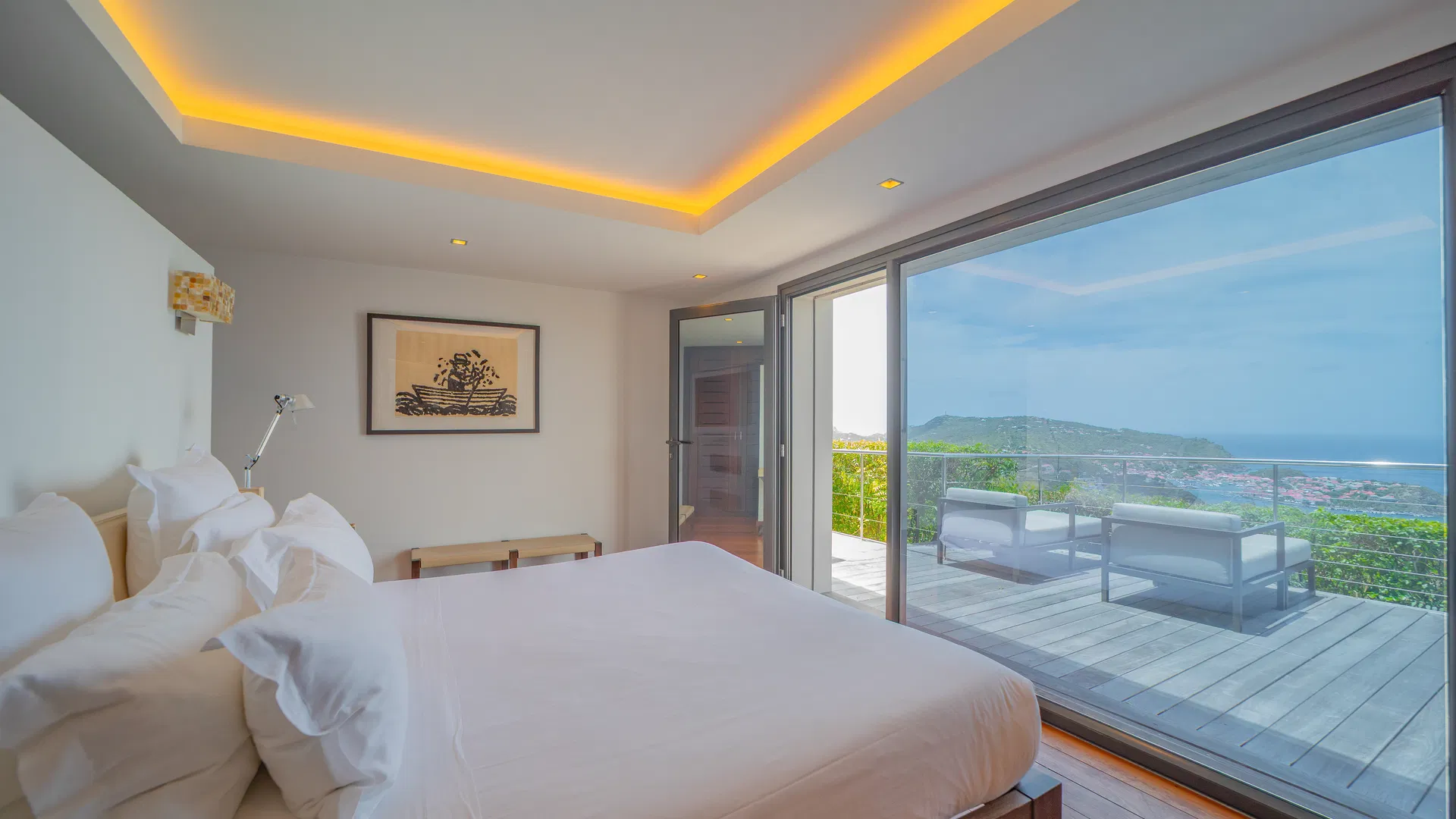 Elegance is felt, not declared, within. Designer leather and parchment pieces add a tactile richness that complements the island’s light, while earthy, natural colors ground the rooms. The living room opens completely to the terrace, where the infinity pool appears to spill into the ocean and the view stretches uninterrupted from the harbor to far-off silhouettes on the water. Evenings huddle around the fire-lit glow of sunset, when the sky turns copper and rose and the yachts become necklaces of light, while afternoons linger here as sails drift across Gustavia.
