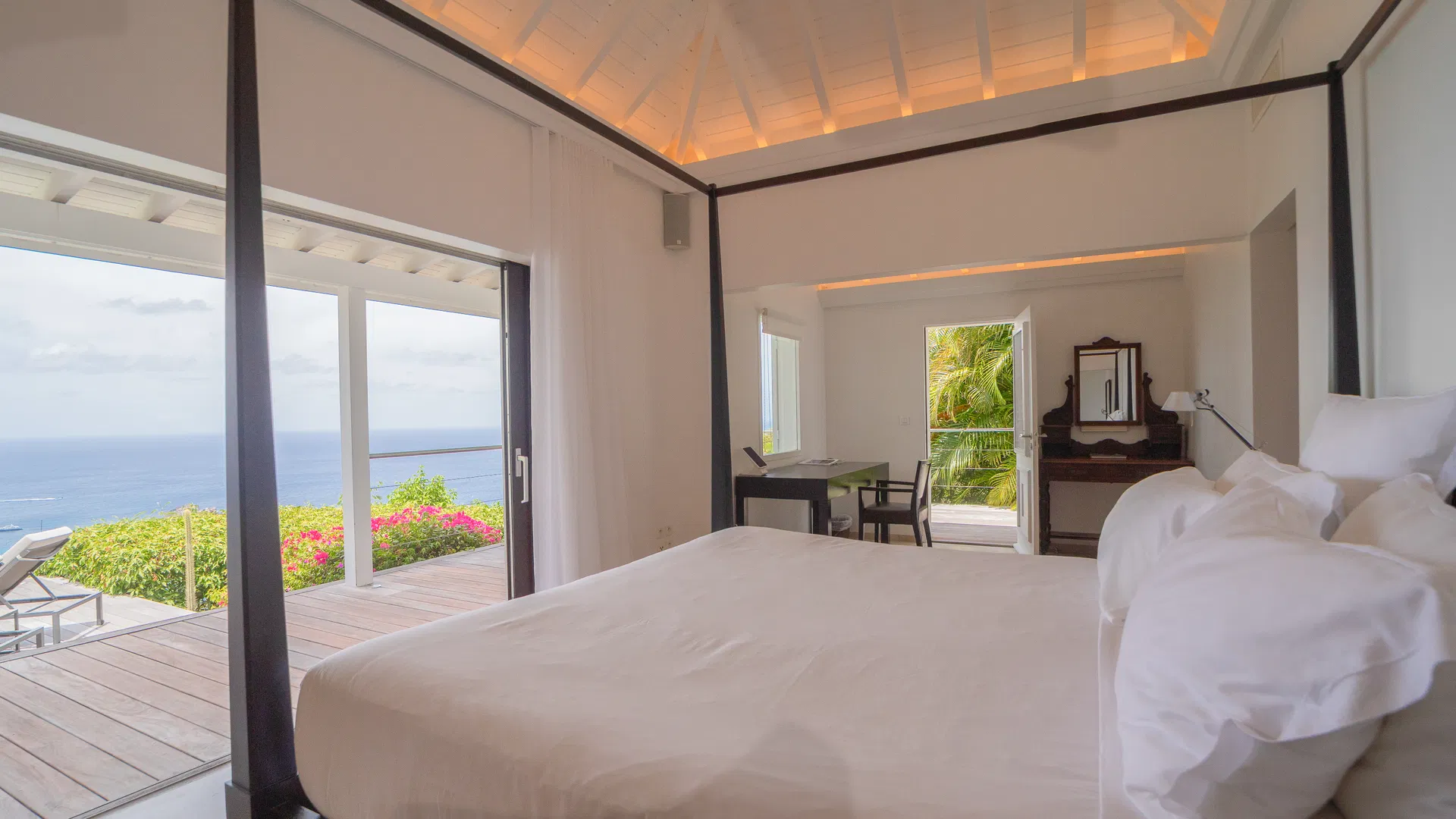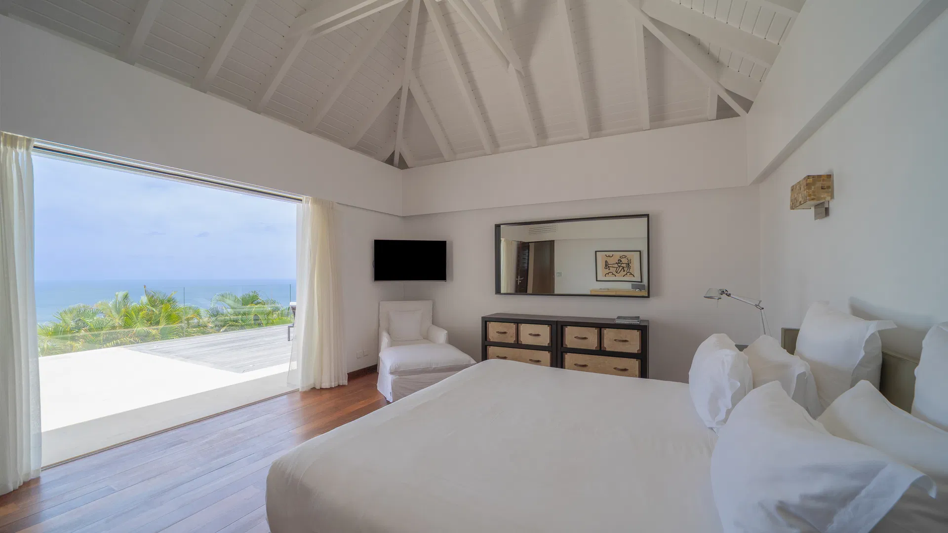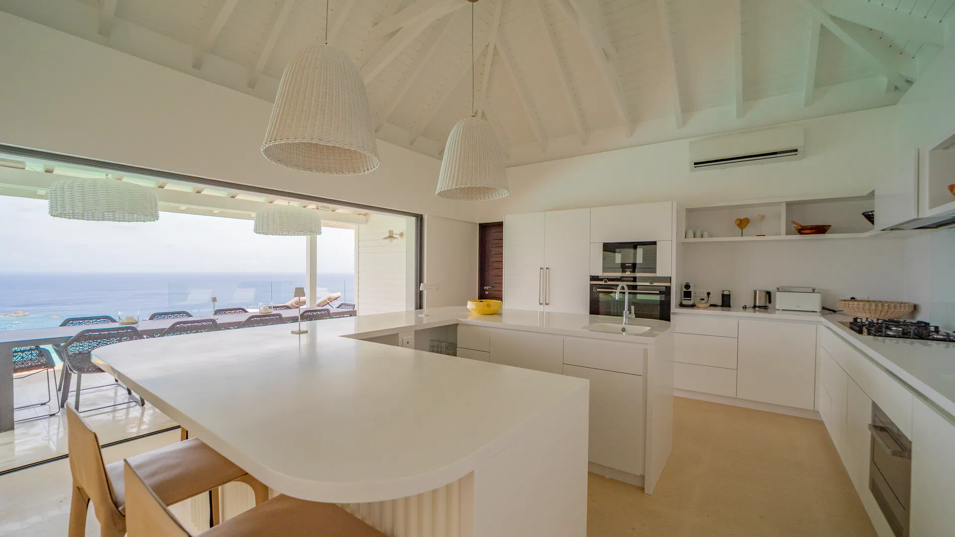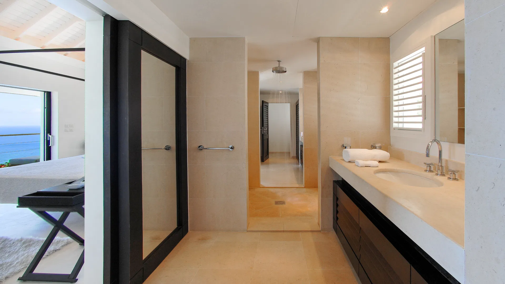 To optimize privacy and view, the property features four bedrooms arranged in tiers. Two suites on the main floor offer expansive views of the sea and spa-like bathrooms with double vanities and large showers that will take you from bed to the stars.