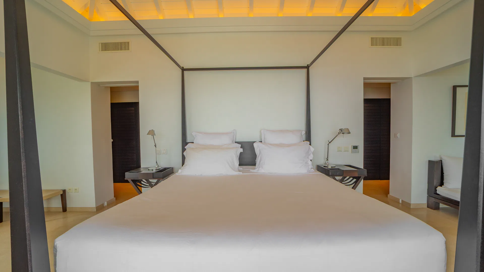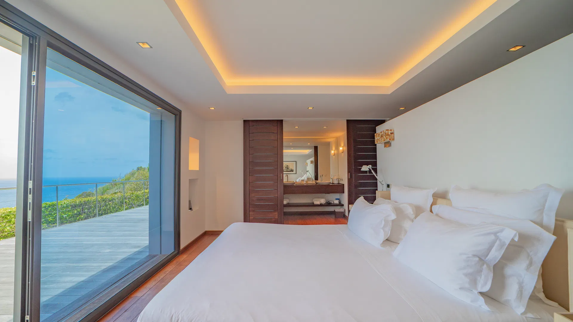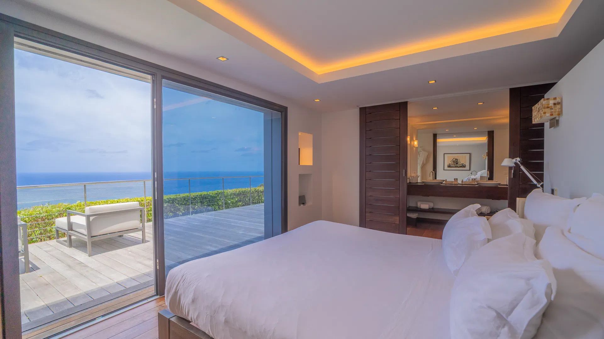 To optimize privacy and view, the property features four bedrooms arranged in tiers. Two suites on the main floor offer expansive views of the sea and spa-like bathrooms with double vanities and large showers that will take you from bed to the stars.