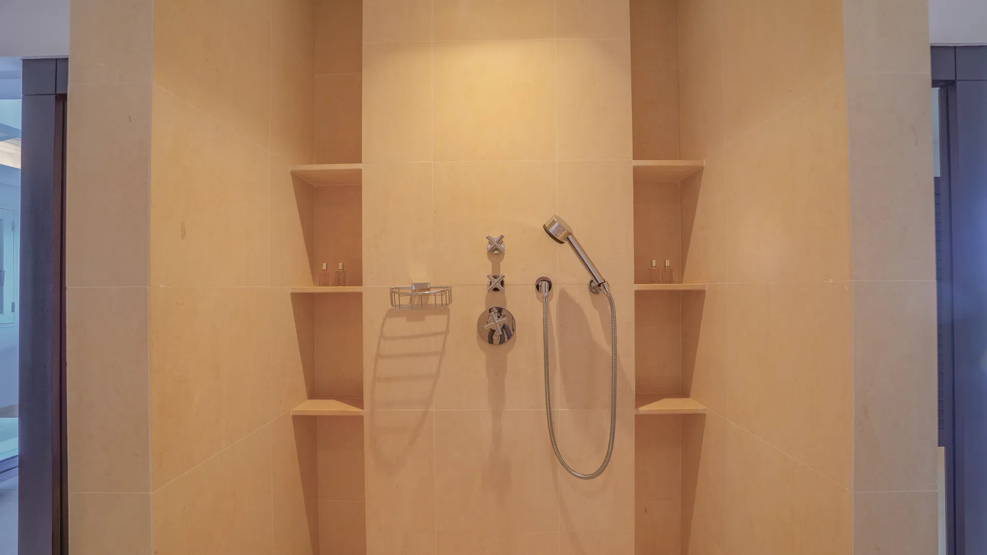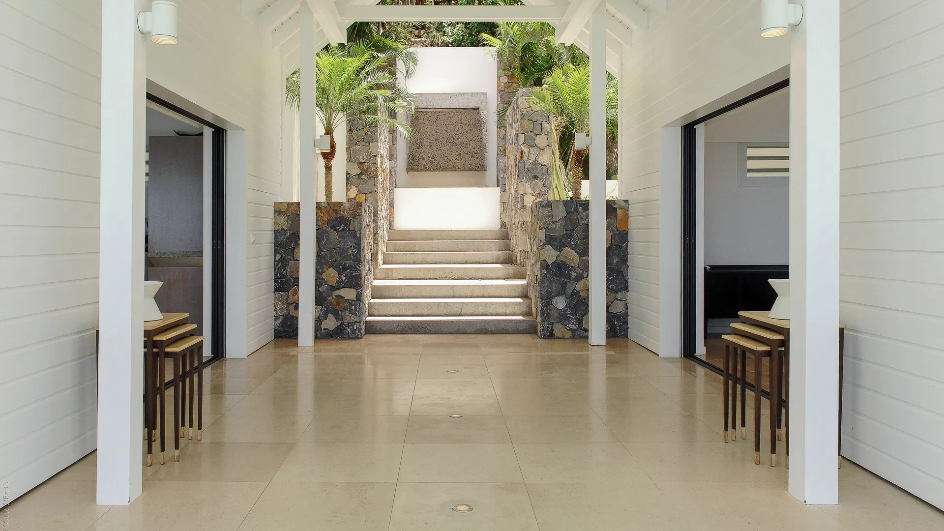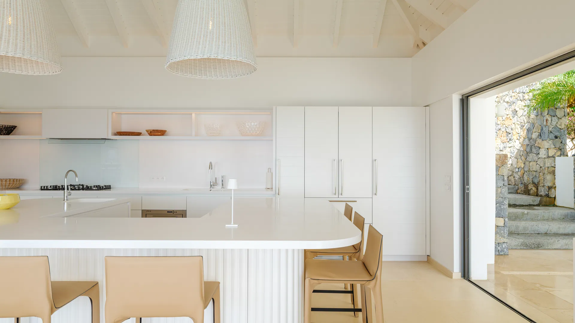 Arrival is ceremonial in its own quiet way: the air becomes cool and gentle as a waterfall mutters against the rock as stone steps descend to the entrance. With the kitchen and dining pavilion to the right and the living room unfolding to the left, the covered passageway beyond the door connects the main part of the house. Everything faces the horizon, and the boundary between the terrace and the interior is so distinct that you can move without realizing you’ve crossed it.