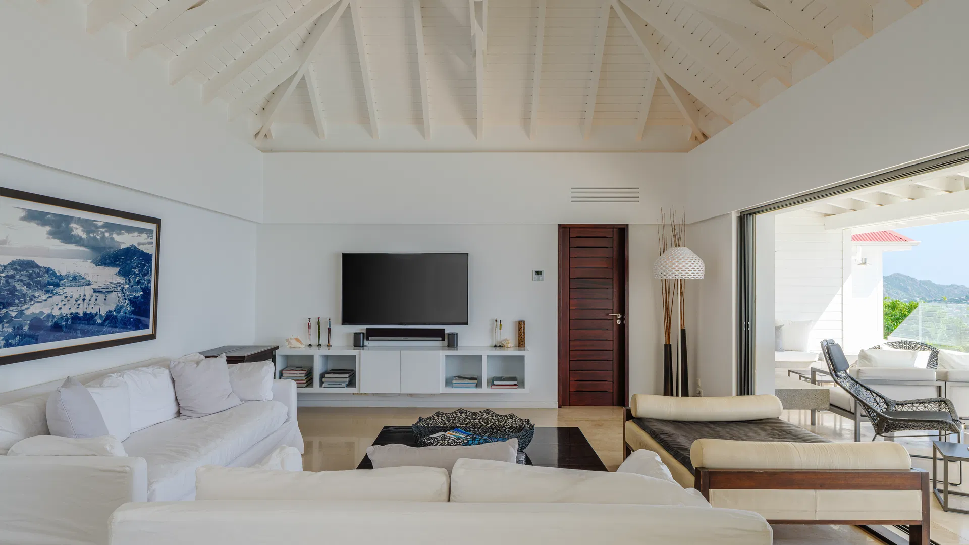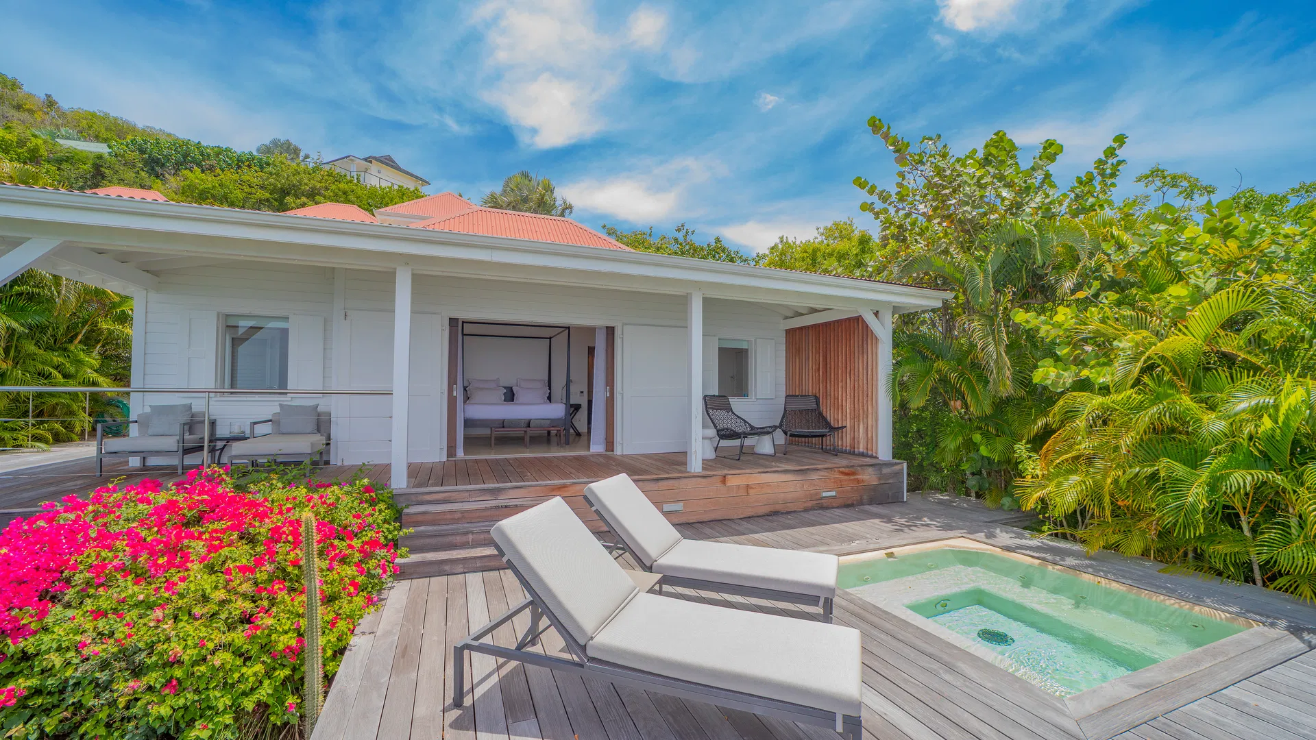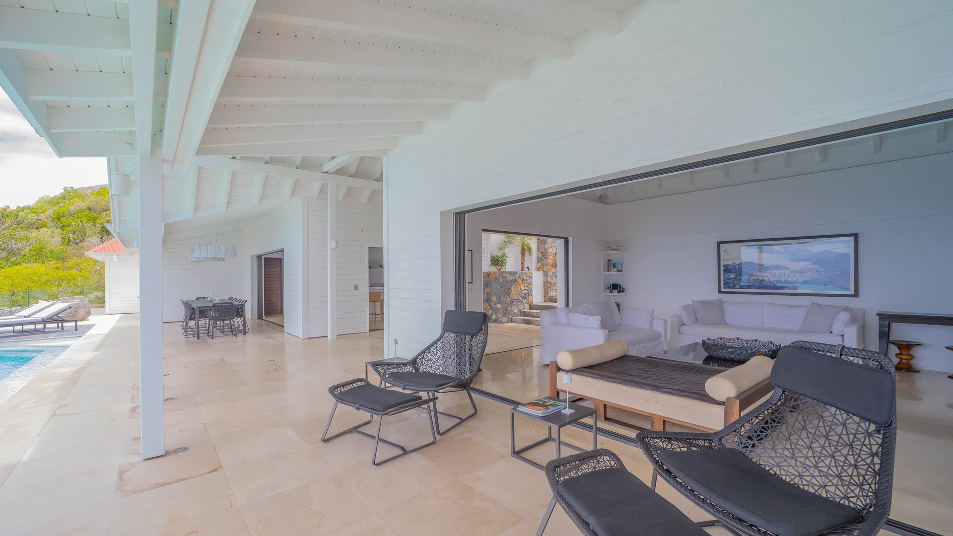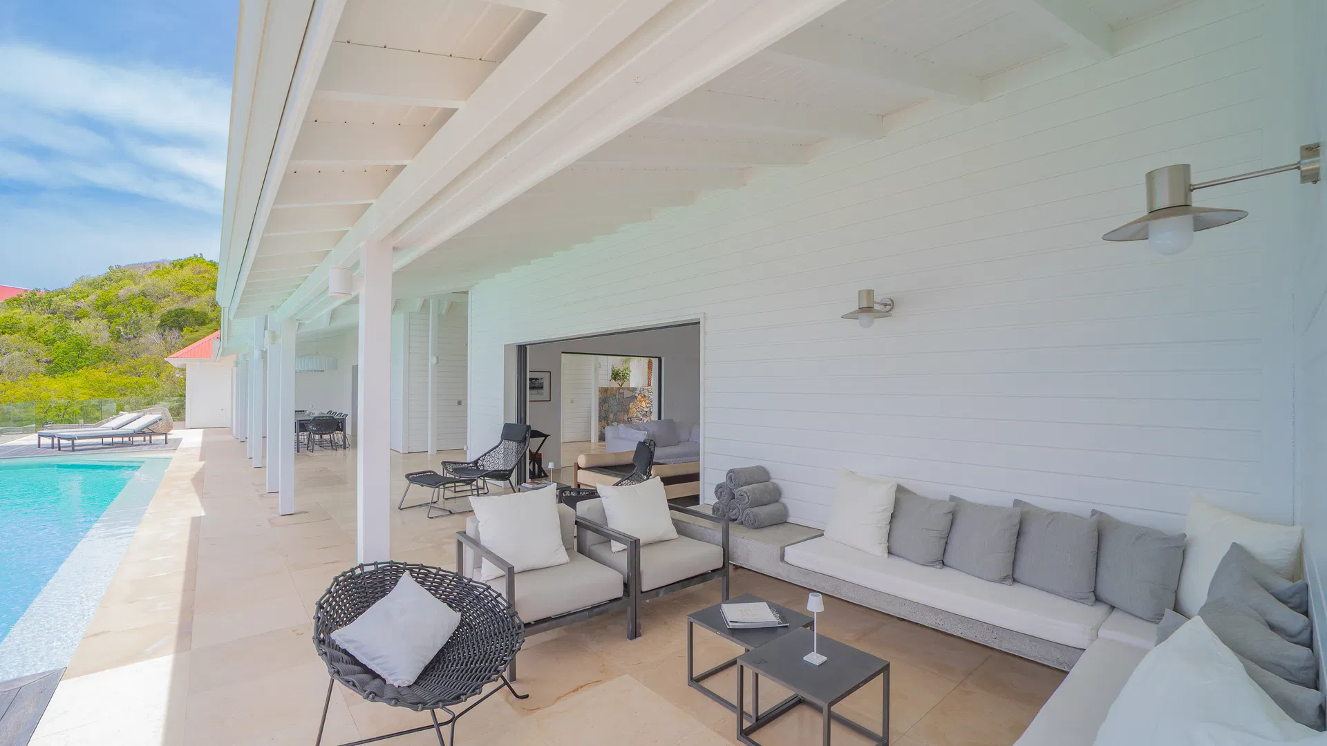 The terrace takes over the days. The pool, which is in the middle of everything, reflects color and clouds like a second sky, while loungers catch the trade winds and deep daybeds beckon for reading and naps. You can follow the sun’s arc until it softens into evening, observe ferries stitching the channel, and trace the outline of Saba, Saint Eustatius, and Saint Kitts & Nevis from this location. Flamands is five minutes away by car, broad and pale with water the color of minted glass; St. Jean is less than ten, bustling with boutiques, beach clubs, and that unique St. Barts energy that elevates a typical afternoon into a special occasion.