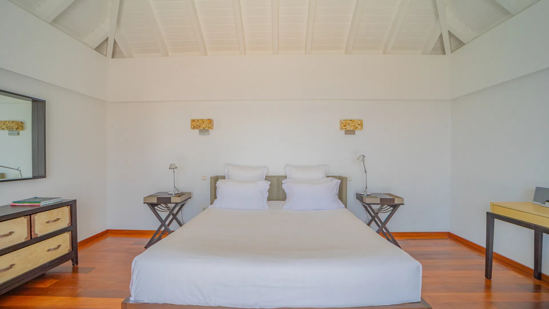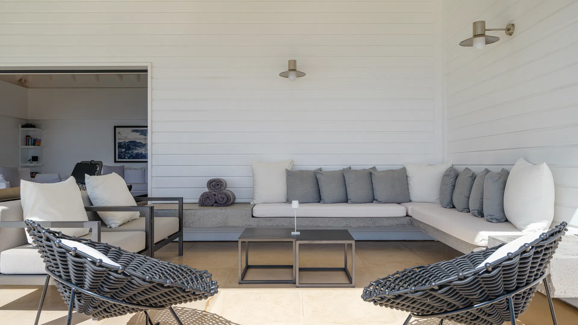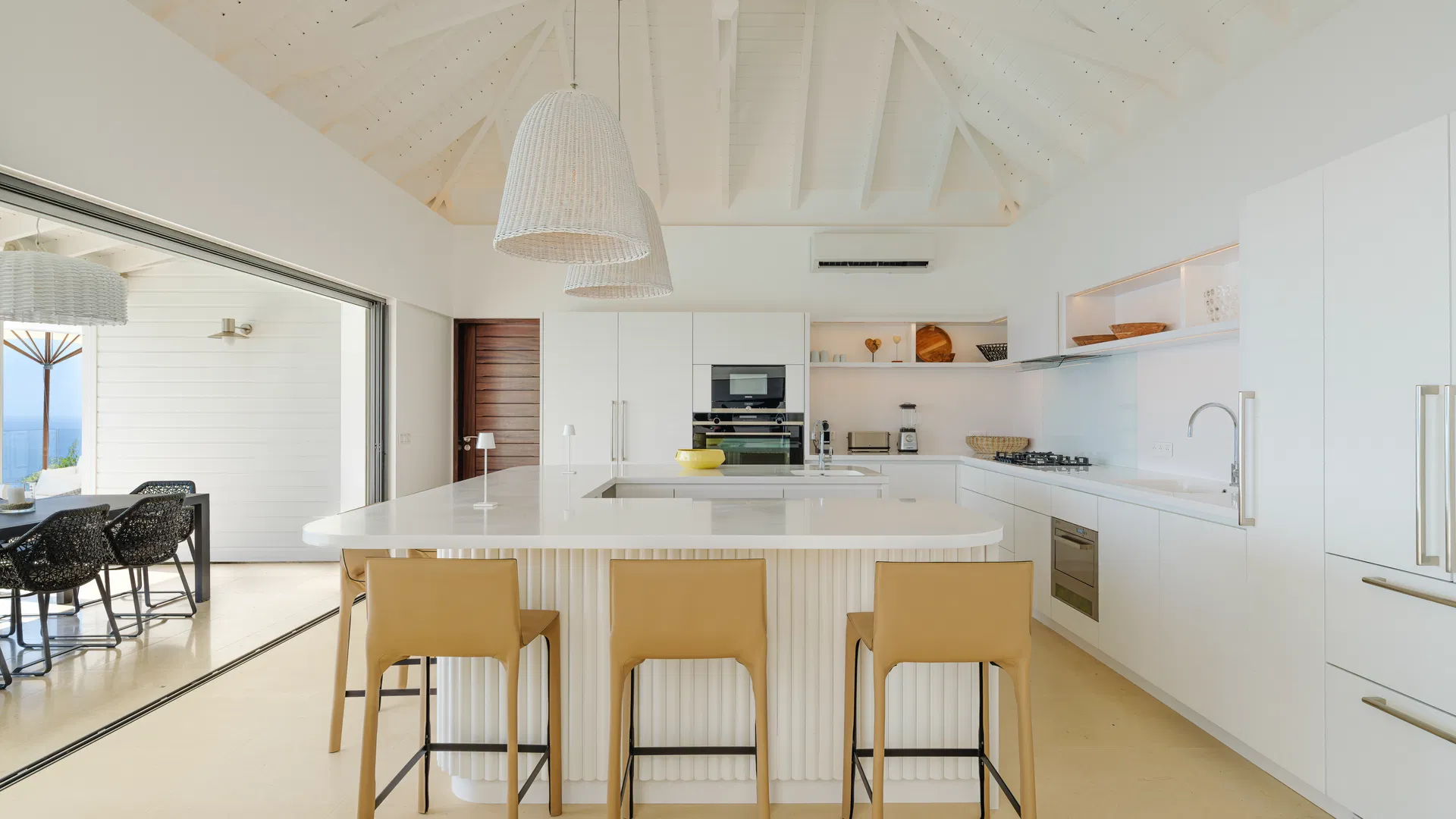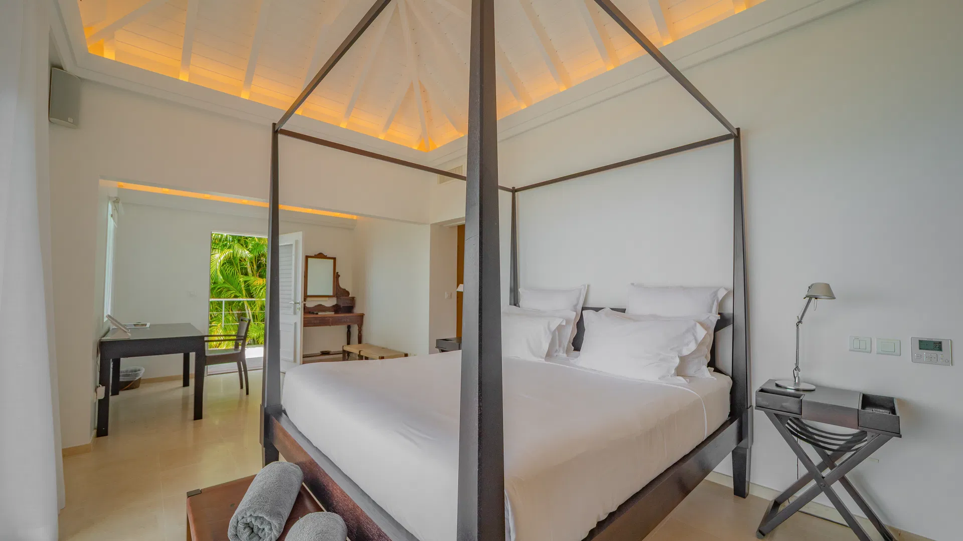 The terrace takes over the days. The pool, which is in the middle of everything, reflects color and clouds like a second sky, while loungers catch the trade winds and deep daybeds beckon for reading and naps. You can follow the sun’s arc until it softens into evening, observe ferries stitching the channel, and trace the outline of Saba, Saint Eustatius, and Saint Kitts & Nevis from this location. Flamands is five minutes away by car, broad and pale with water the color of minted glass; St. Jean is less than ten, bustling with boutiques, beach clubs, and that unique St. Barts energy that elevates a typical afternoon into a special occasion.