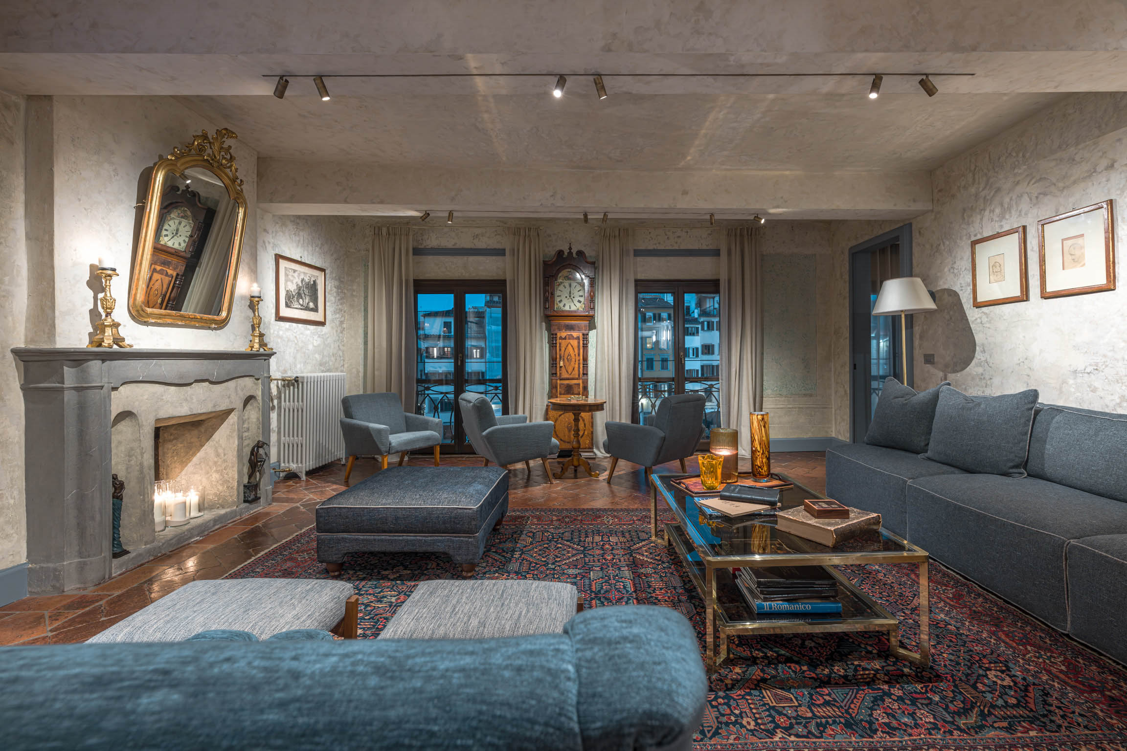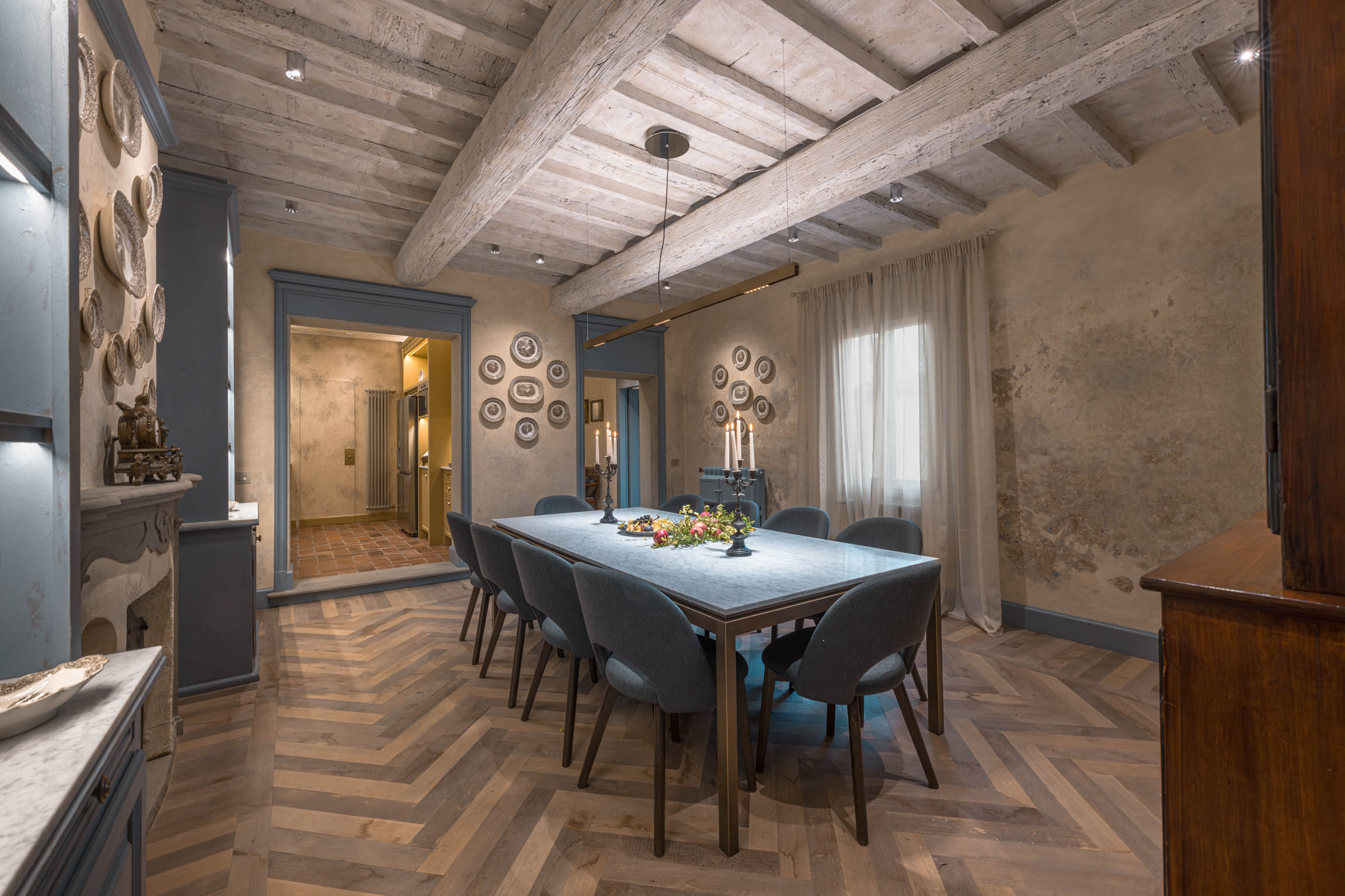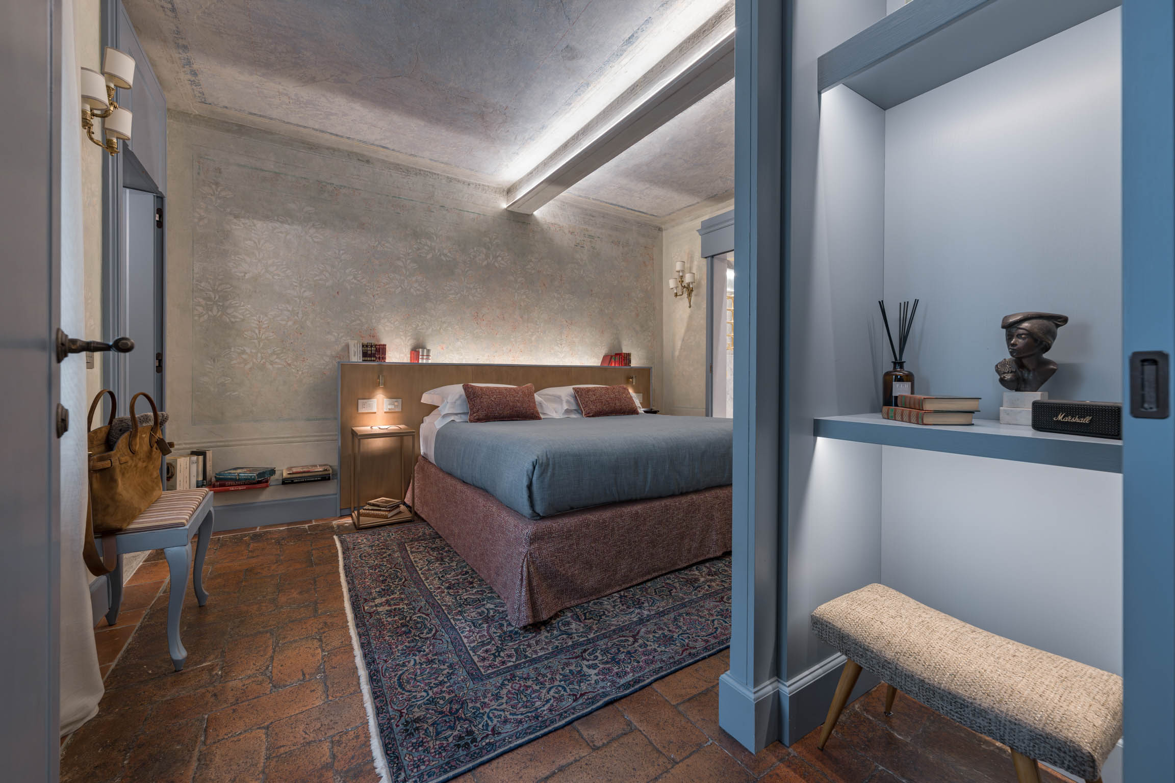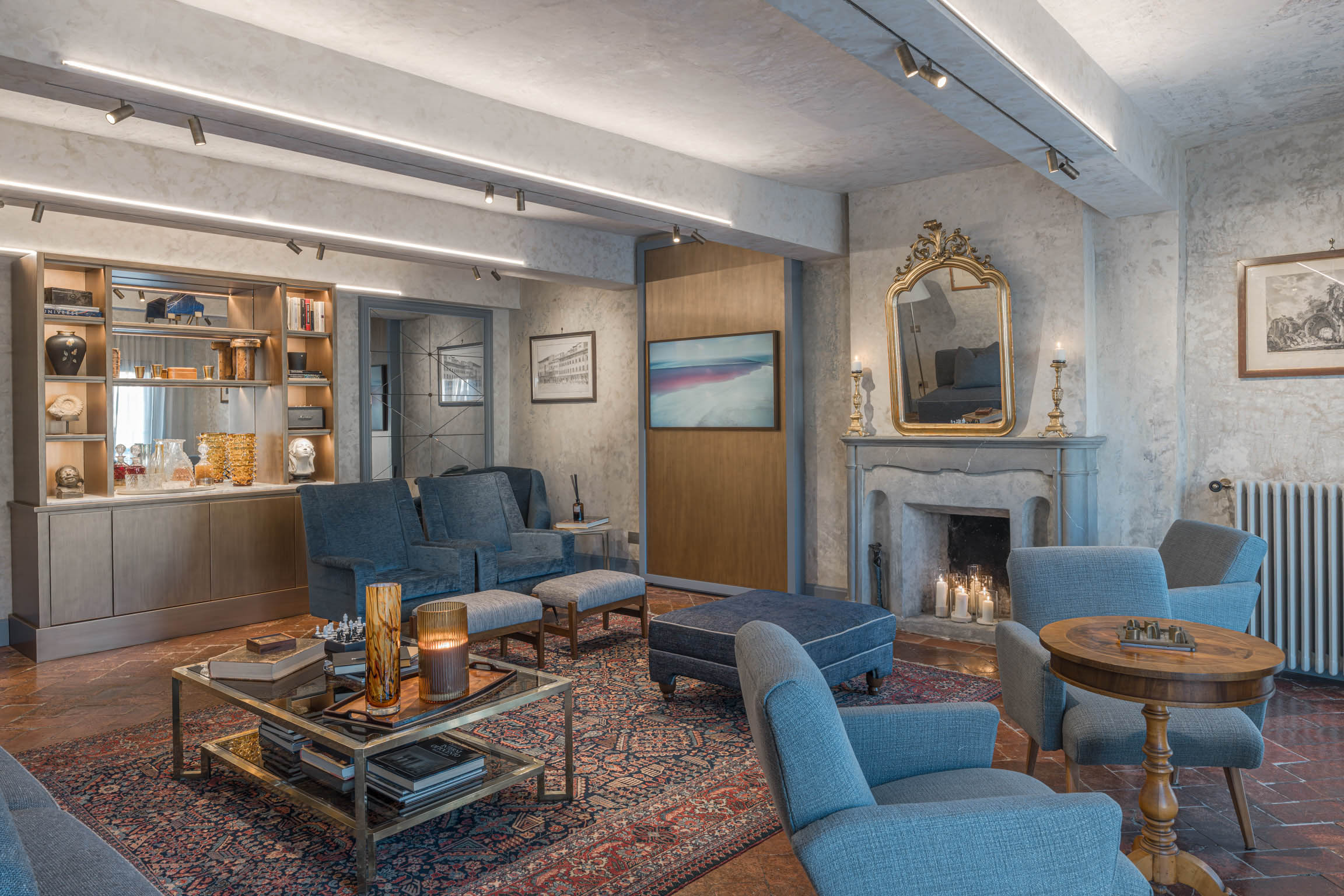 The apartment’s atmosphere is calm and cohesive, designed around a palette of greyish blues and natural tones that softens the grandeur of its historic bones. Original architectural details—like terracotta floors, textured plaster walls, and a stone fireplace—root the home in tradition, while carefully chosen furnishings introduce a clean, modern sensibility that feels refined rather than trendy.