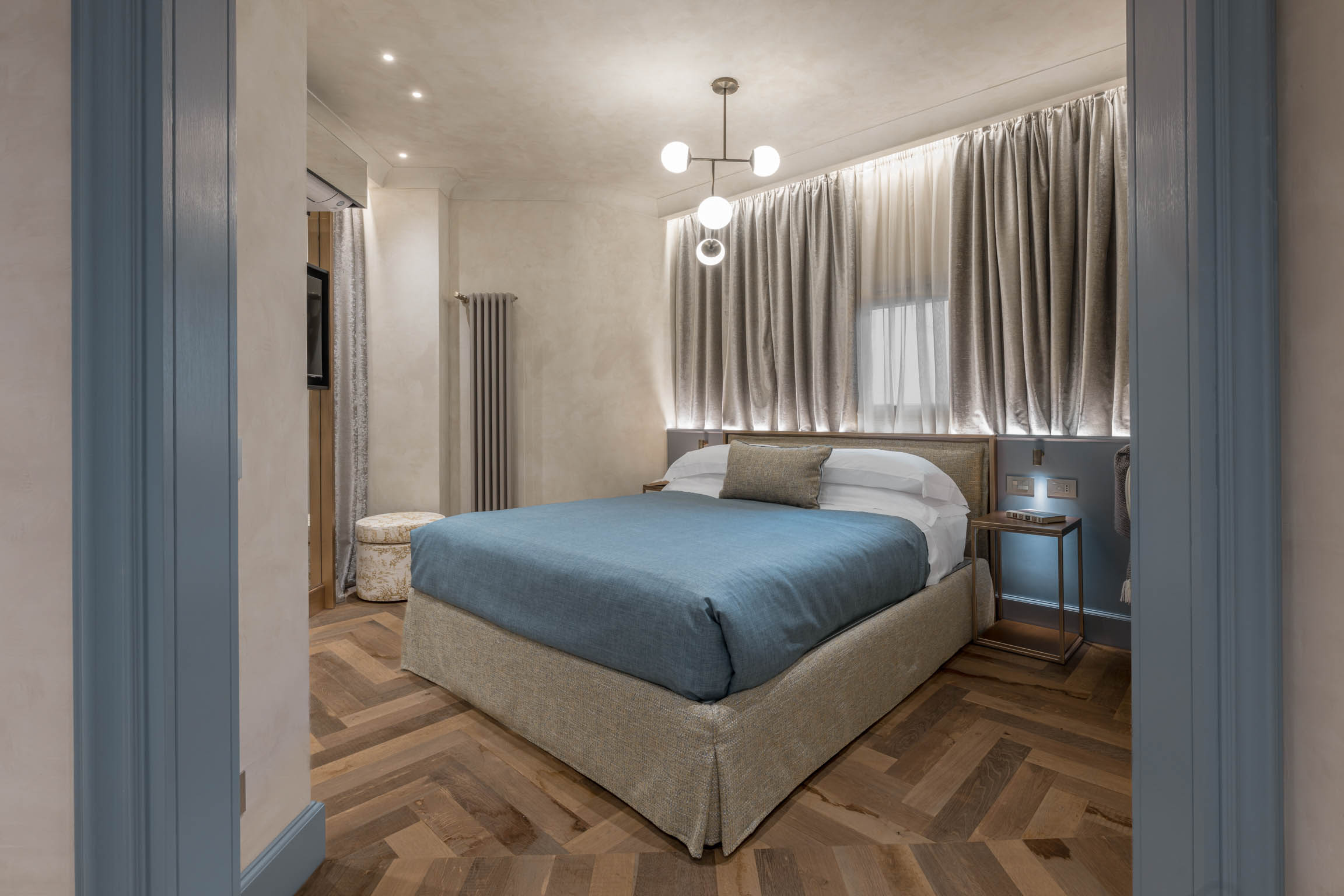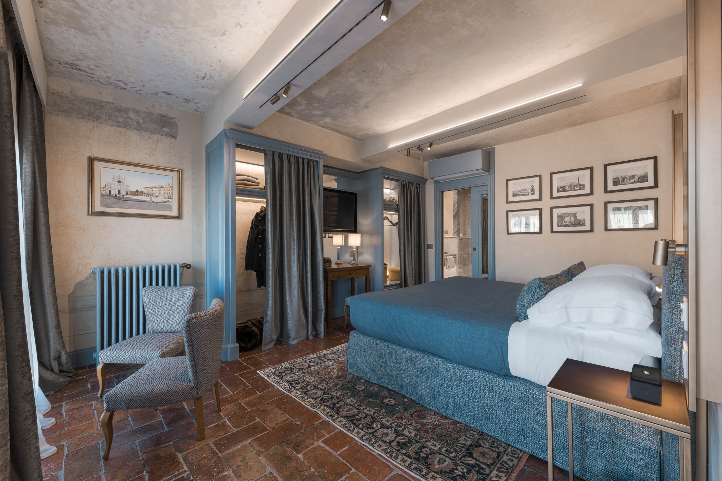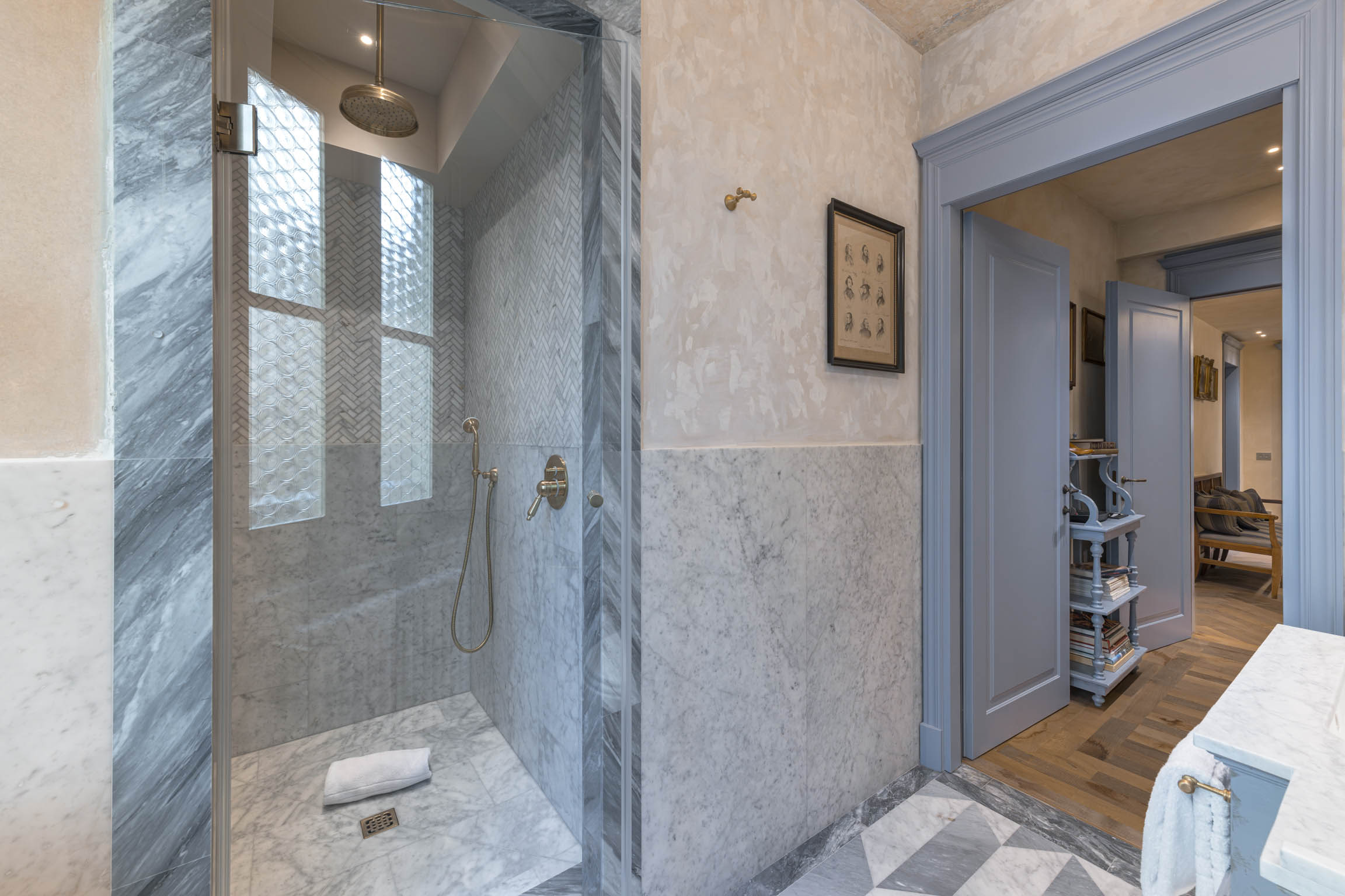 The apartment’s atmosphere is calm and cohesive, designed around a palette of greyish blues and natural tones that softens the grandeur of its historic bones. Original architectural details—like terracotta floors, textured plaster walls, and a stone fireplace—root the home in tradition, while carefully chosen furnishings introduce a clean, modern sensibility that feels refined rather than trendy.