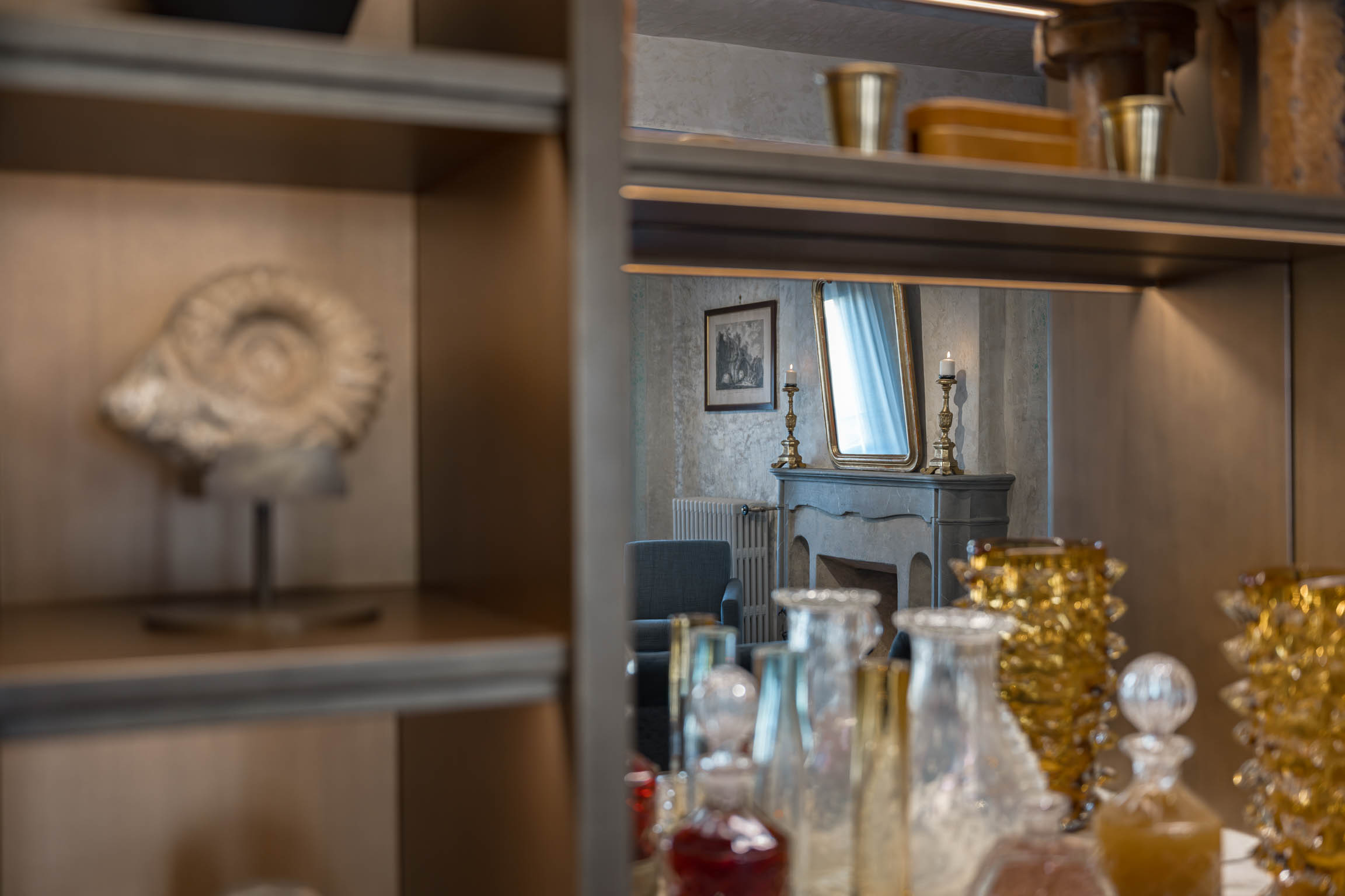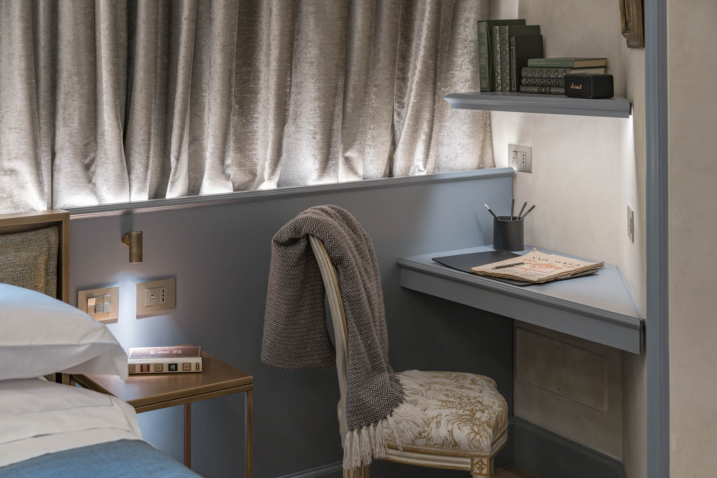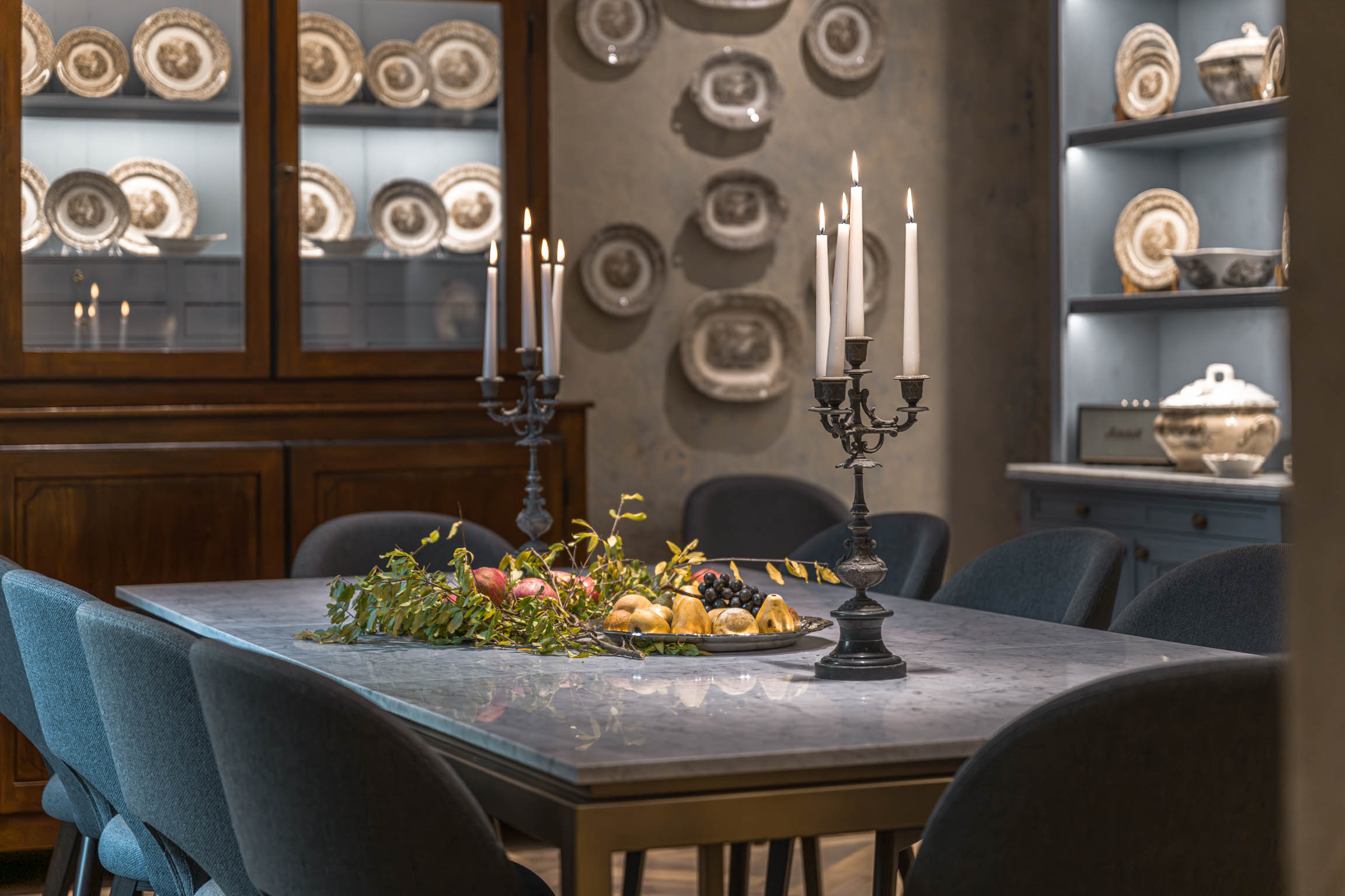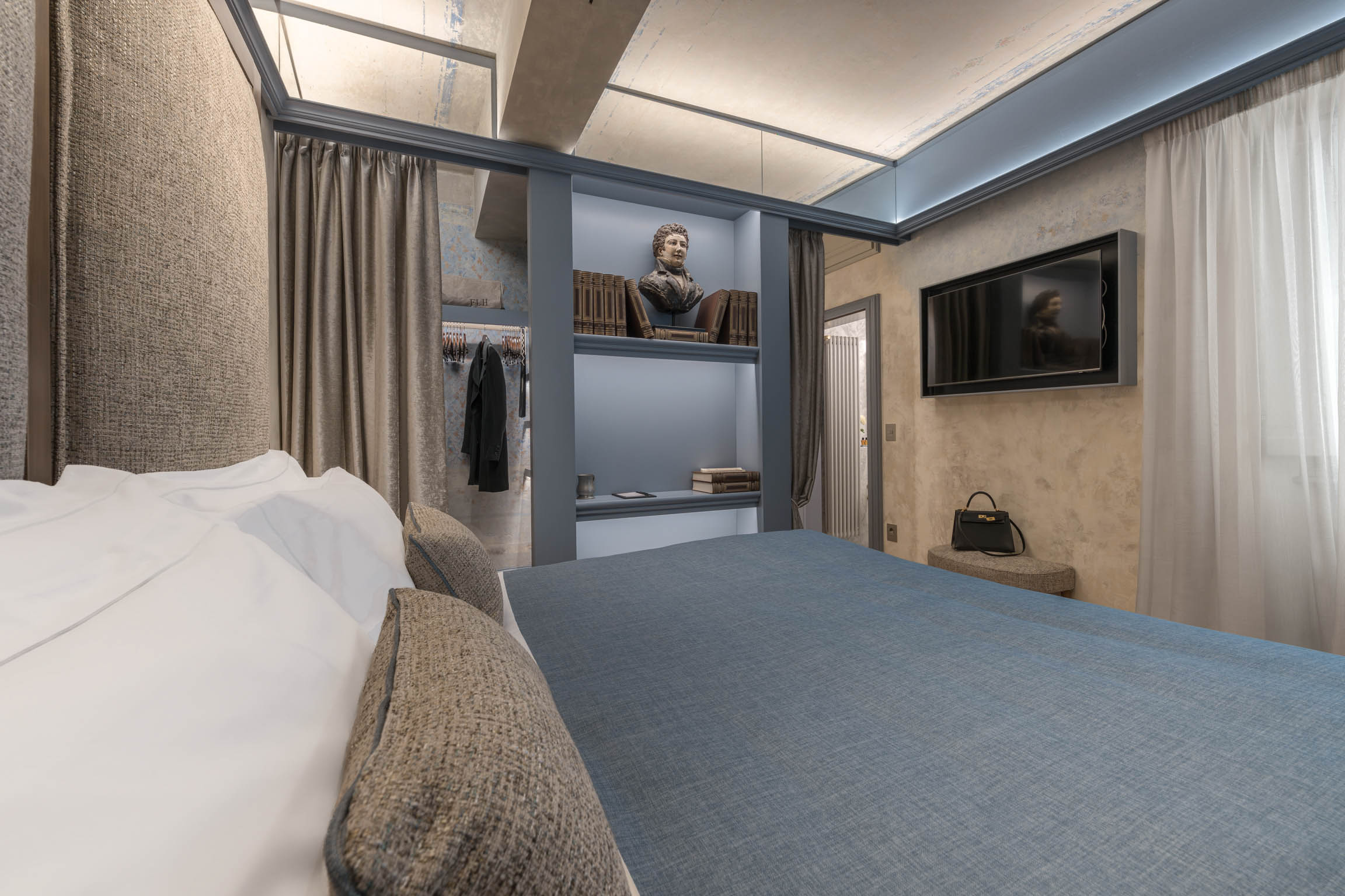 The apartment’s atmosphere is calm and cohesive, designed around a palette of greyish blues and natural tones that softens the grandeur of its historic bones. Original architectural details—like terracotta floors, textured plaster walls, and a stone fireplace—root the home in tradition, while carefully chosen furnishings introduce a clean, modern sensibility that feels refined rather than trendy.