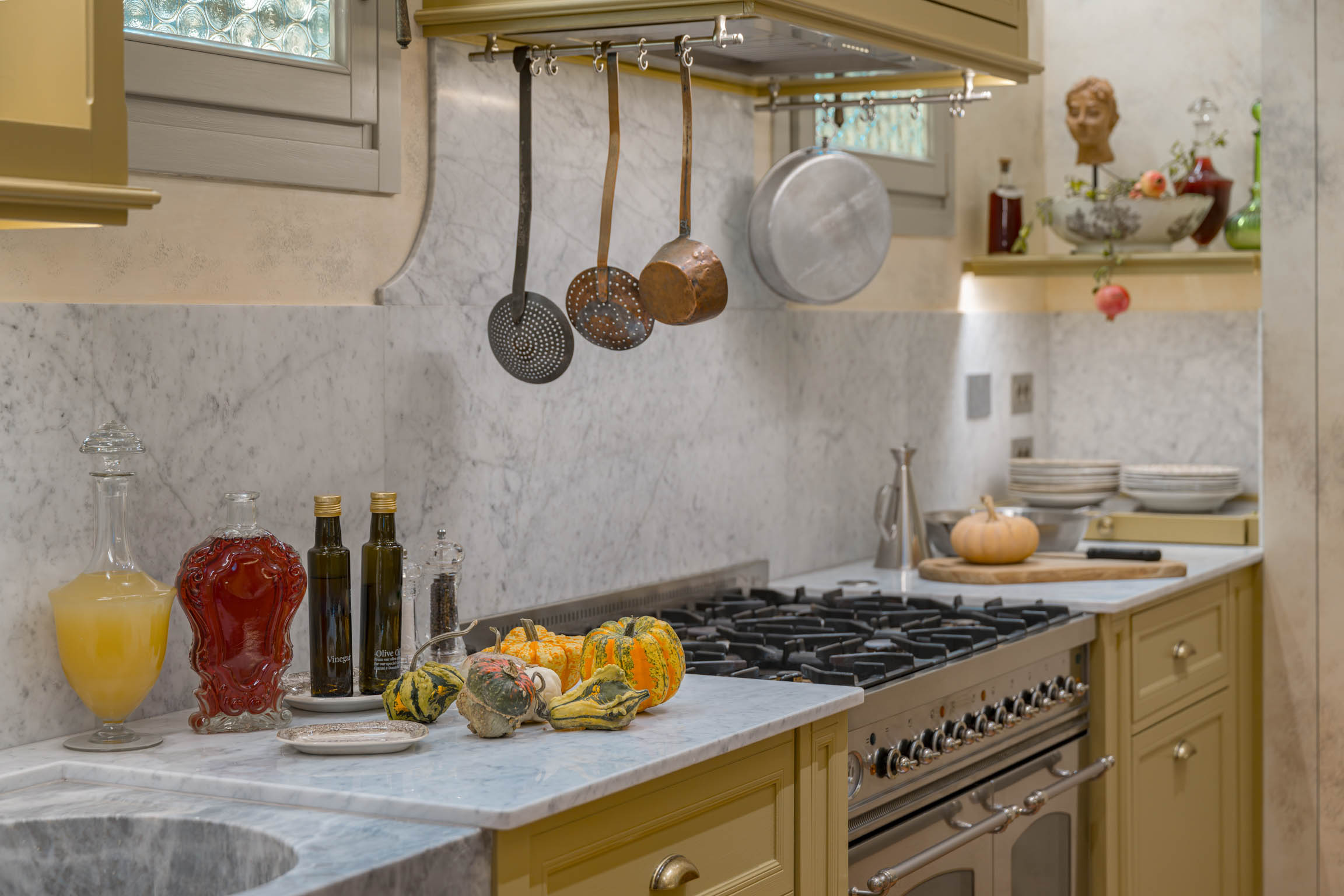 The living areas are designed for both elegance and everyday ease. The formal living room is a beautiful expression of the home’s character: historic architecture and subtle, design-forward furnishings balanced in a way that feels inviting from the first moment you step in. A separate dining room features a generous table seating up to twelve guests, perfect for celebratory dinners, leisurely breakfasts, or chef-prepared meals that turn into long evenings. Adjacent to the dining room, a highly functional galley kitchen is thoughtfully organized with ample storage, designed to make cooking easy whether you’re preparing something simple or working alongside the in-house culinary team. A dedicated laundry room with washer and dryer adds an extra level of convenience—particularly welcome for longer stays.