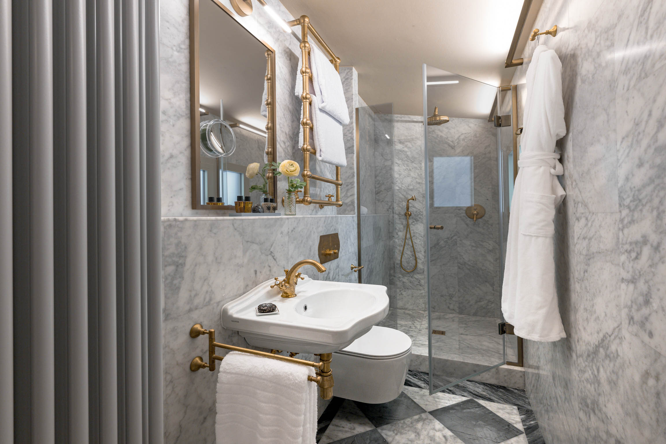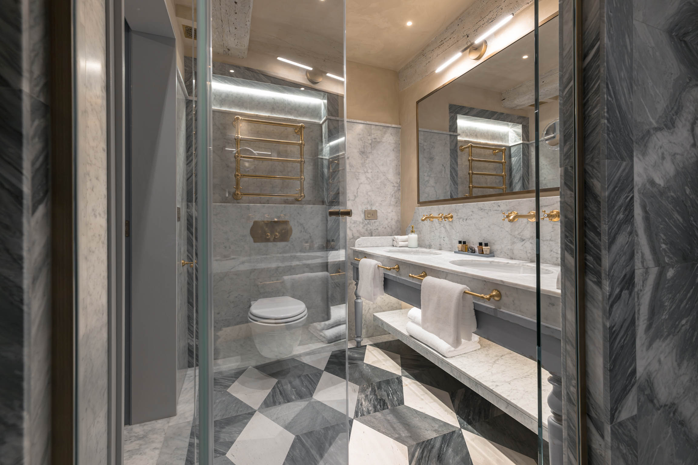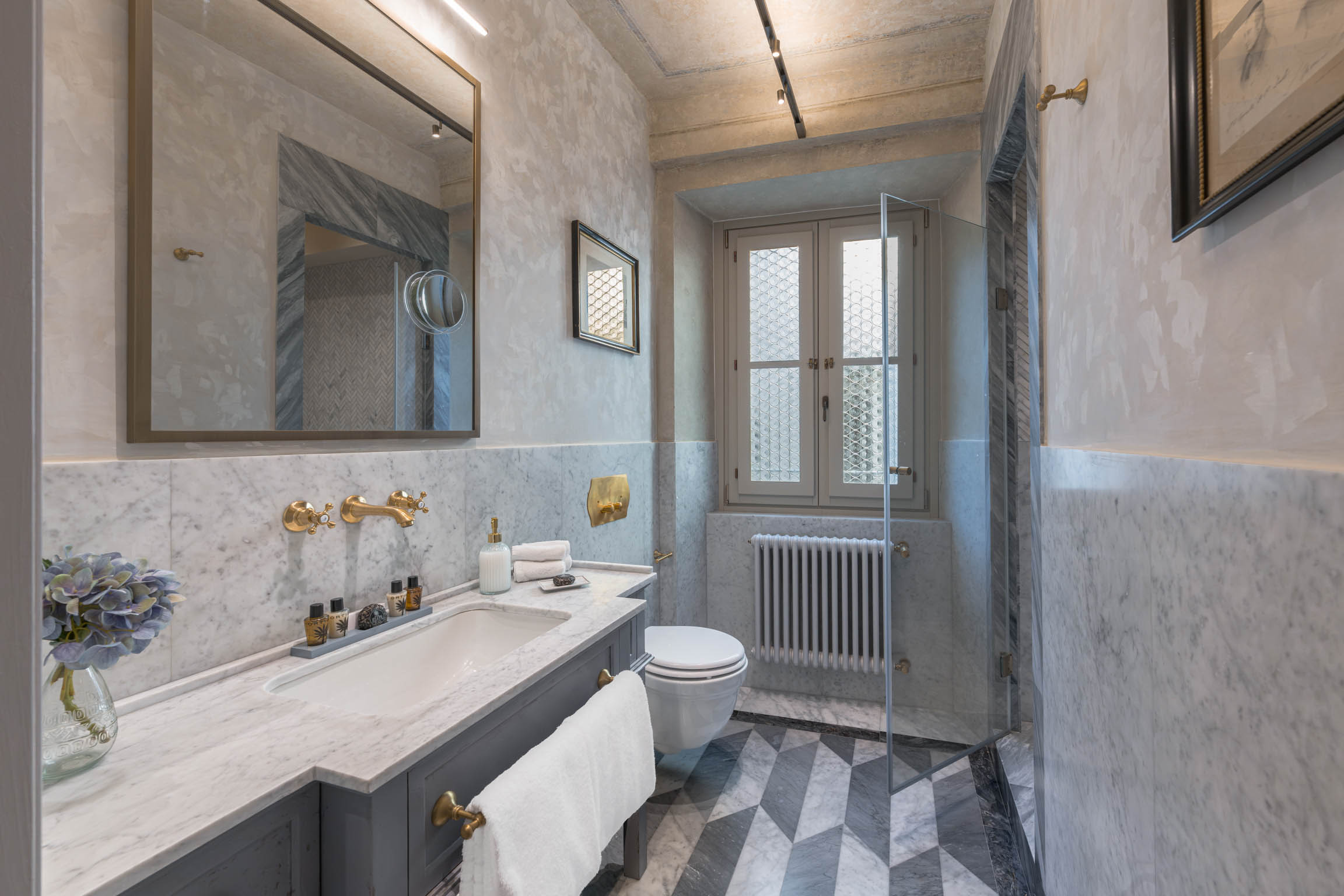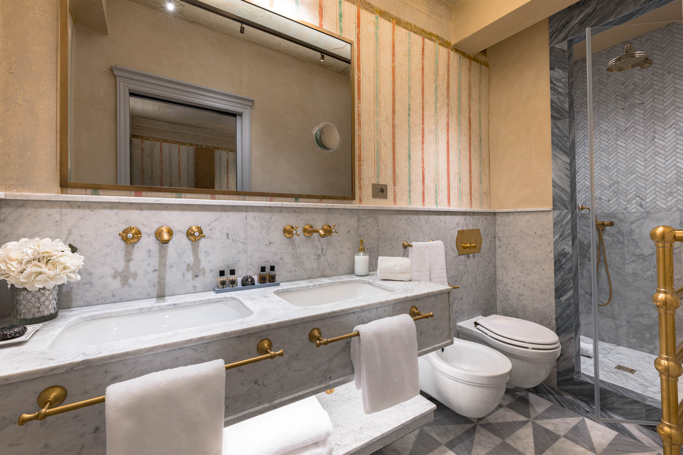 Valorea’s five bedrooms, each with an ensuite bathroom, are arranged to provide genuine privacy for larger groups—something exceptionally uncommon in Florence’s rental landscape. Two bedrooms can be configured as queen or twin (each mattress 90 cm x 190 cm) and each includes an ensuite with double sinks and a shower. Two additional queen bedrooms (mattress 180 cm x 190 cm) feature ensuite bathrooms—one with double sinks and a large shower, and one with a shower. The fifth bedroom offers a French bed (mattress 150 cm x 190 cm) with an ensuite bathroom and shower. All bedrooms are air-conditioned, and every bathroom is stocked with hair dryers and luxury toiletries, giving the residence the feel of a private hotel suite—only with far more space.