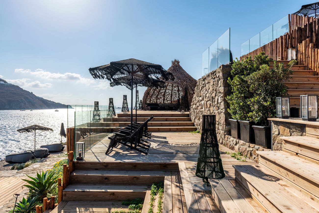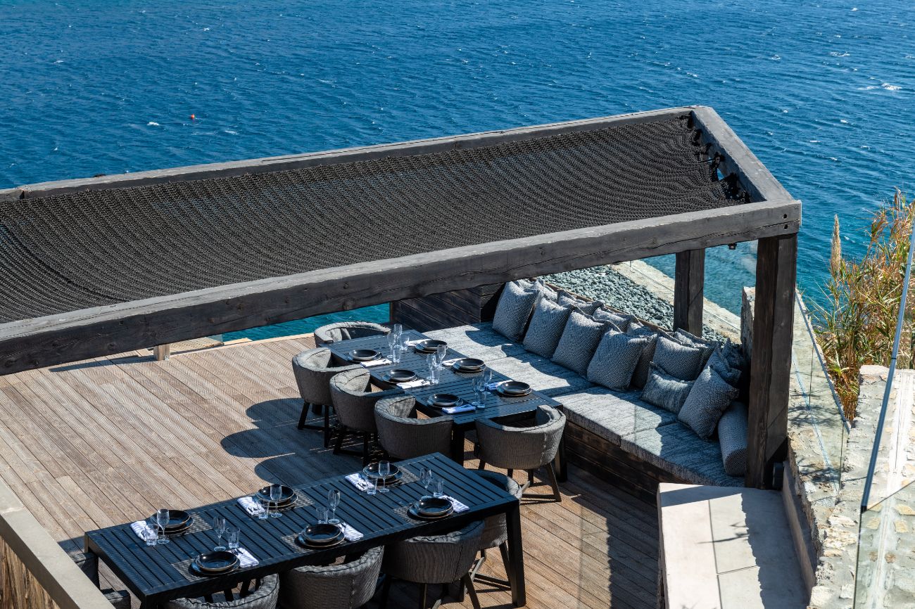It is located on the water’s edge at a higher level, faces the Aegean Sea with its turquoise waters and provides wide views for visitors.
