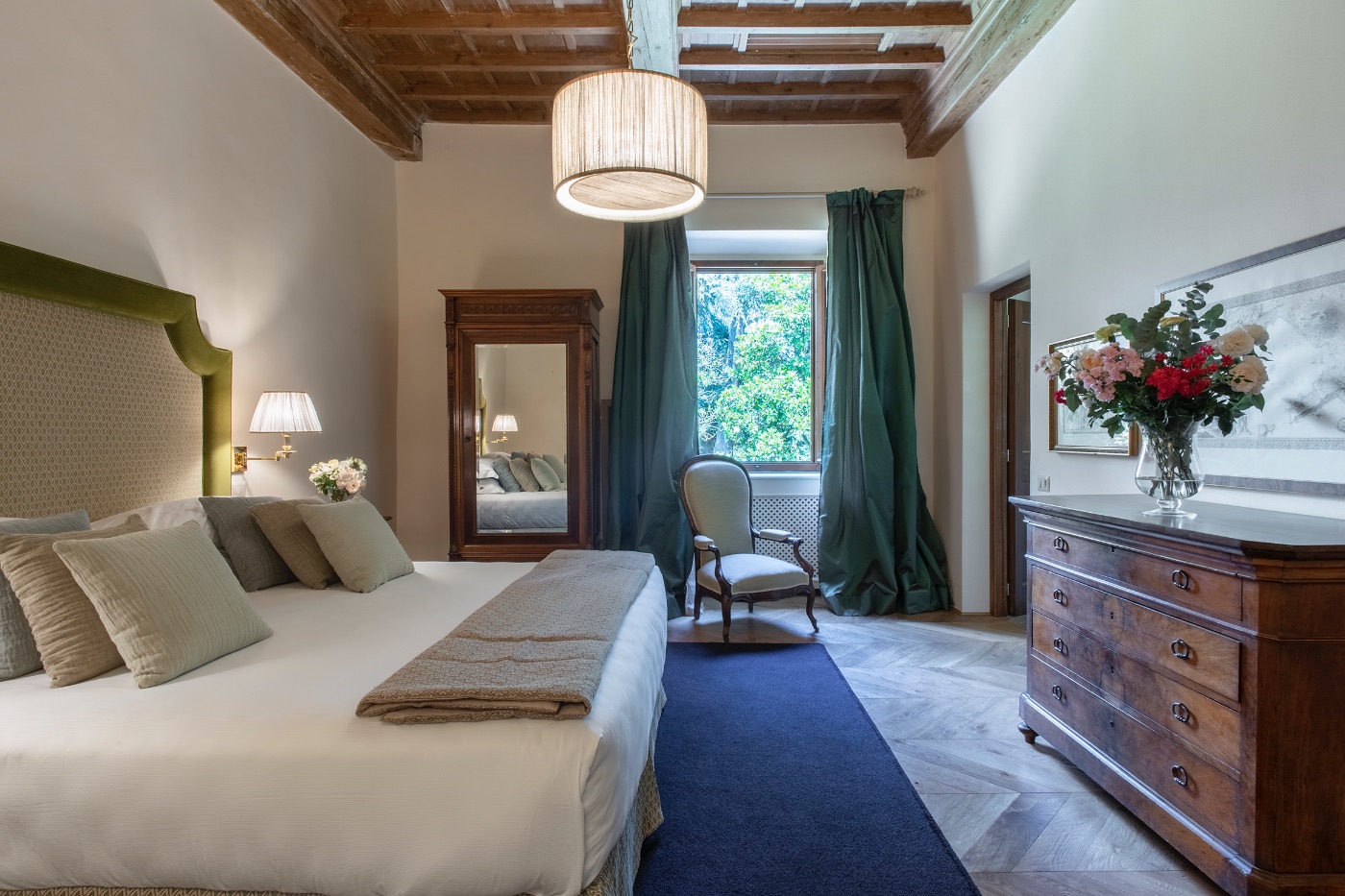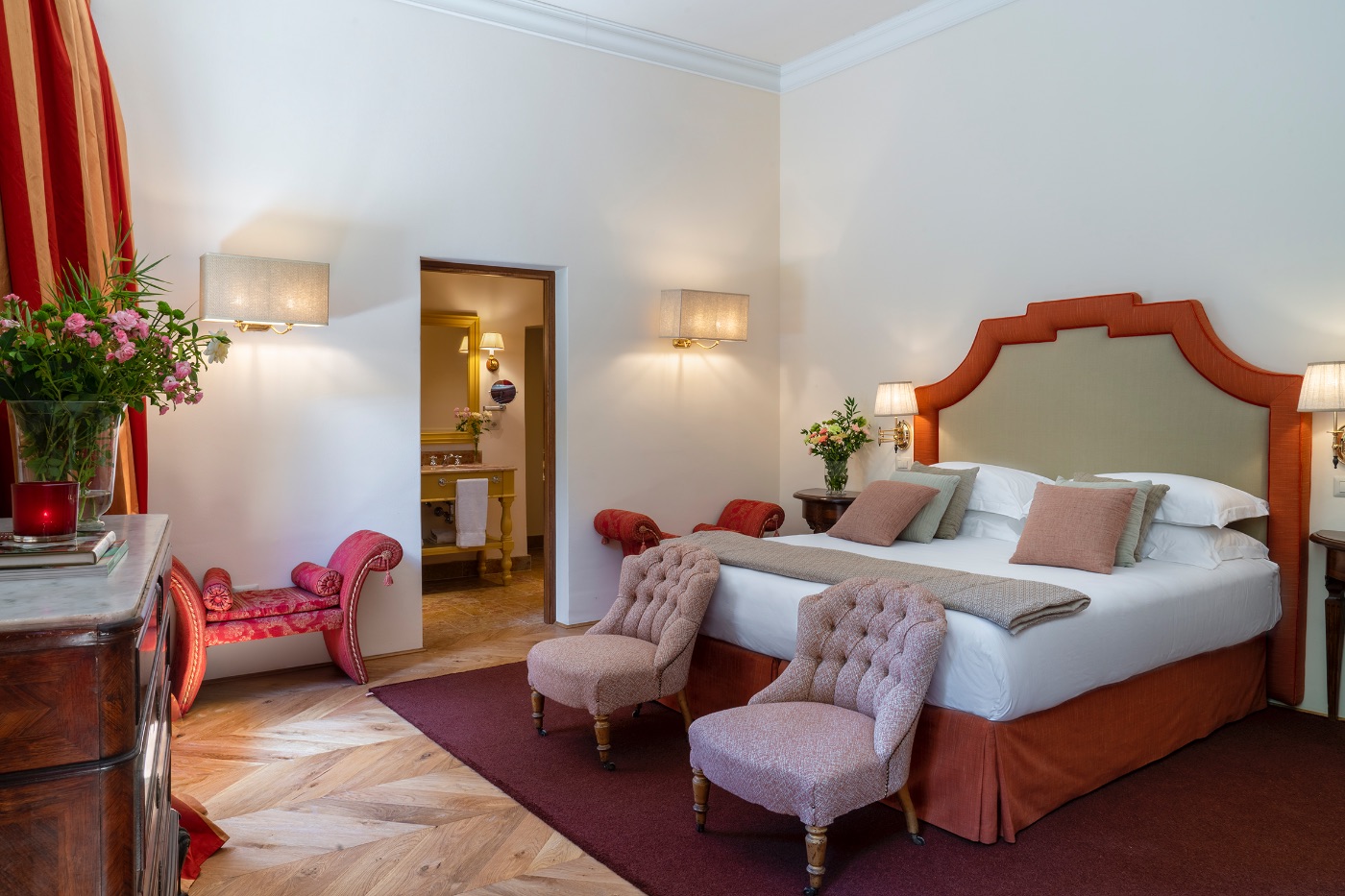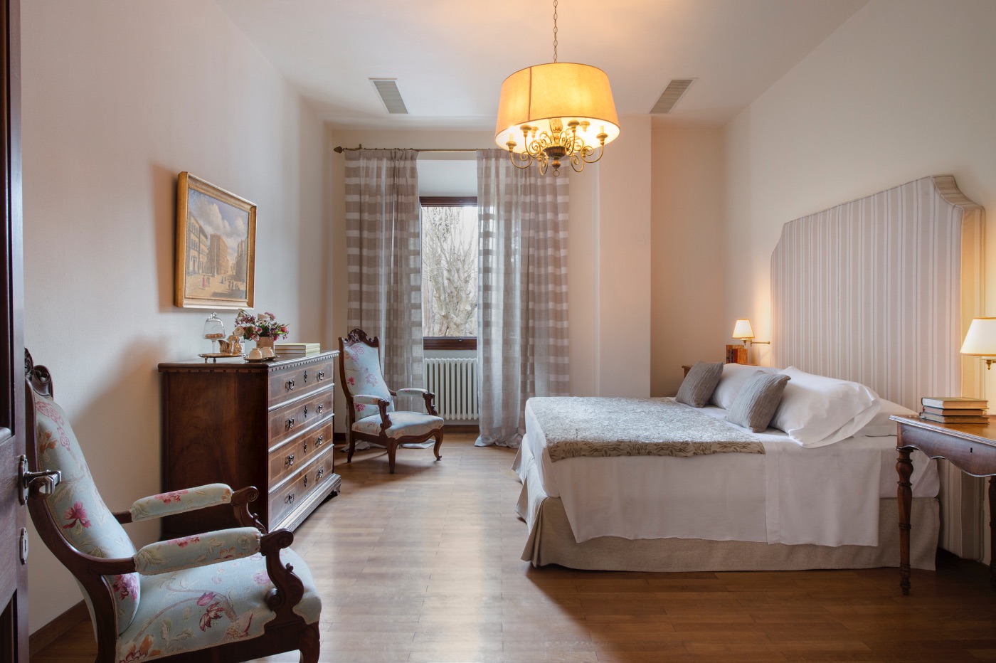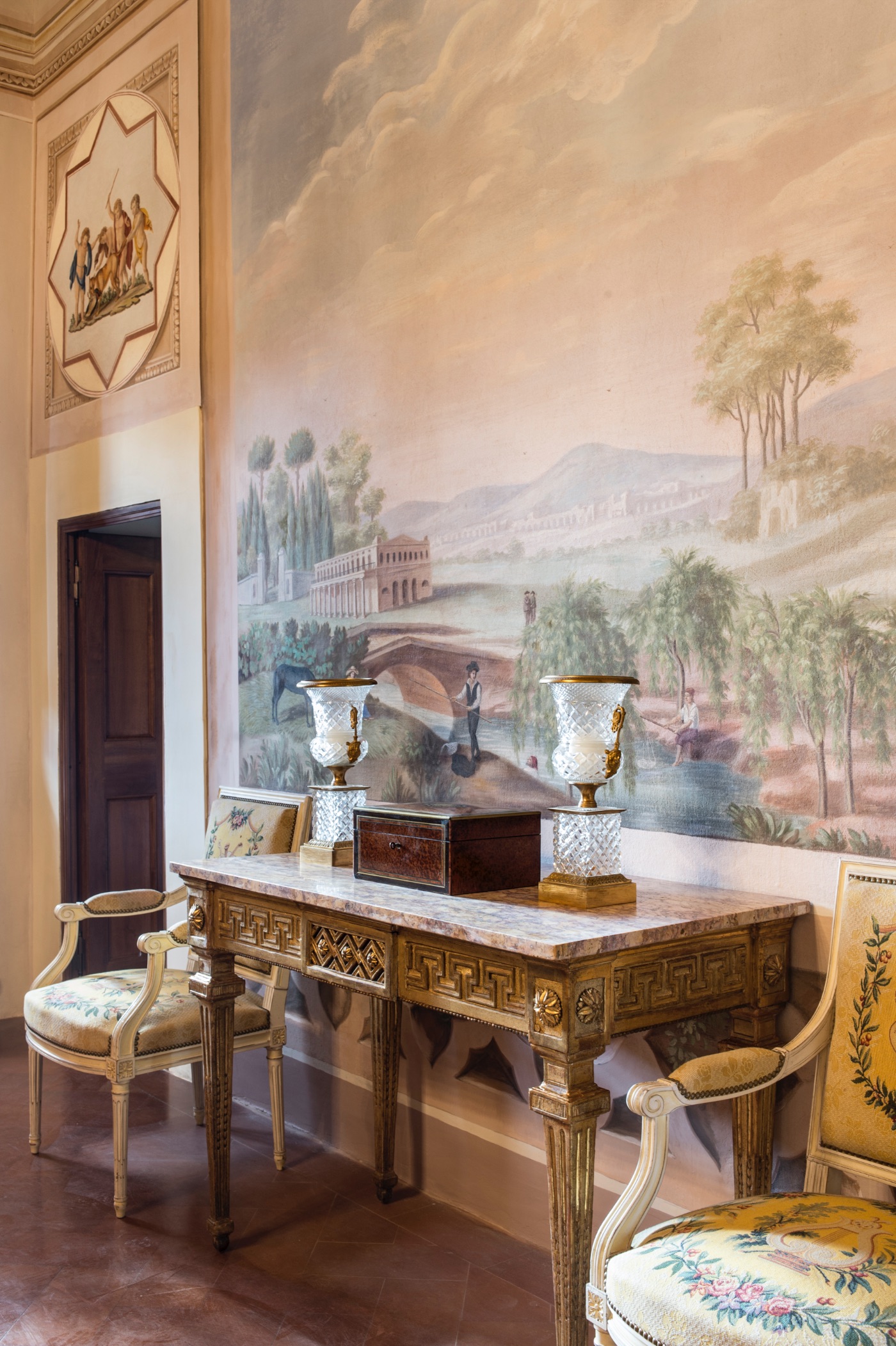 First Floor: The spacious sitting room with stunning frescoed walls provides a comfortable reading and relaxing spot, making it an ideal gathering place for a quiet conversation over a nightcap.