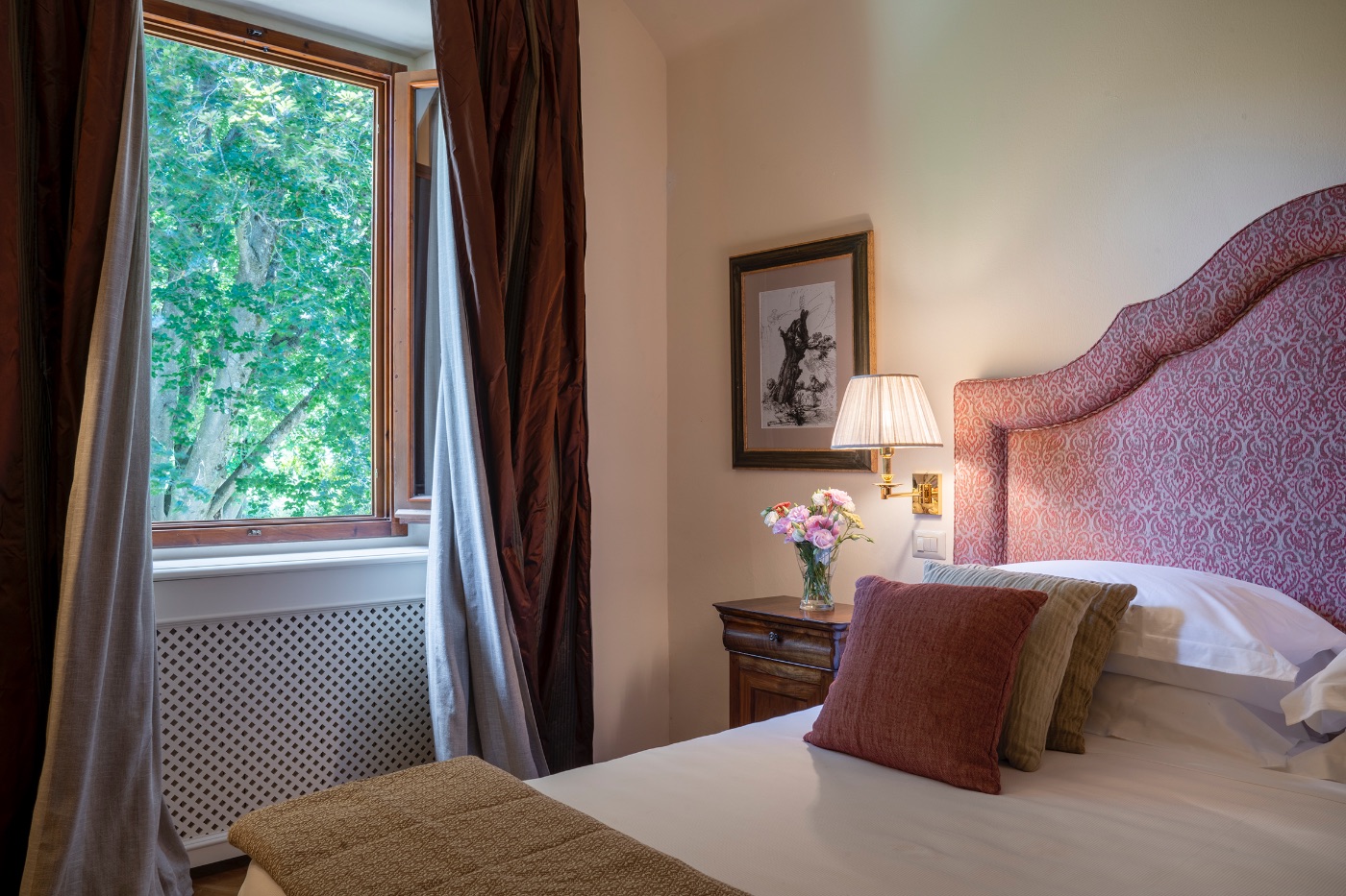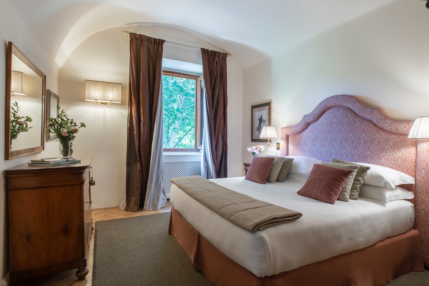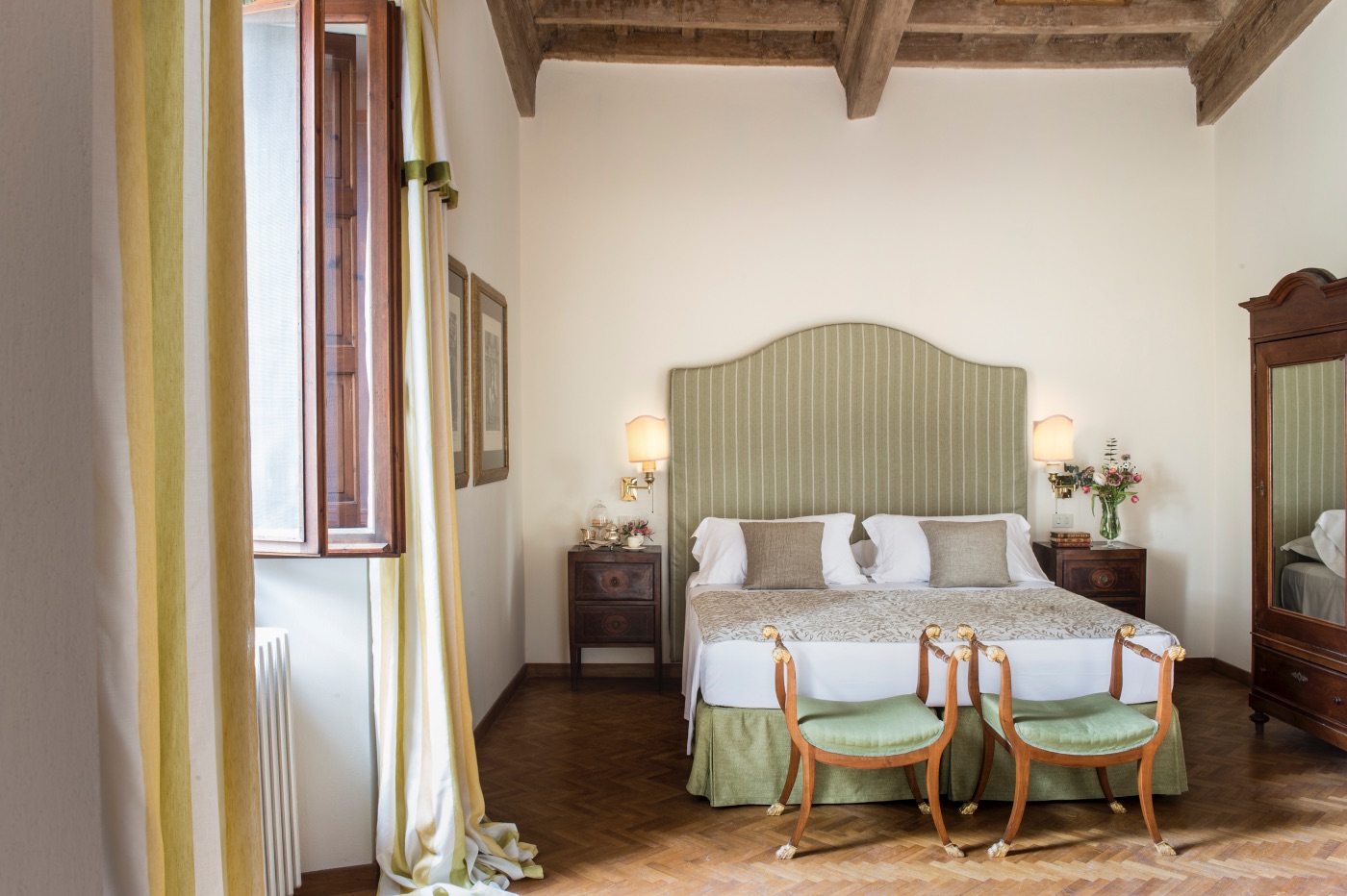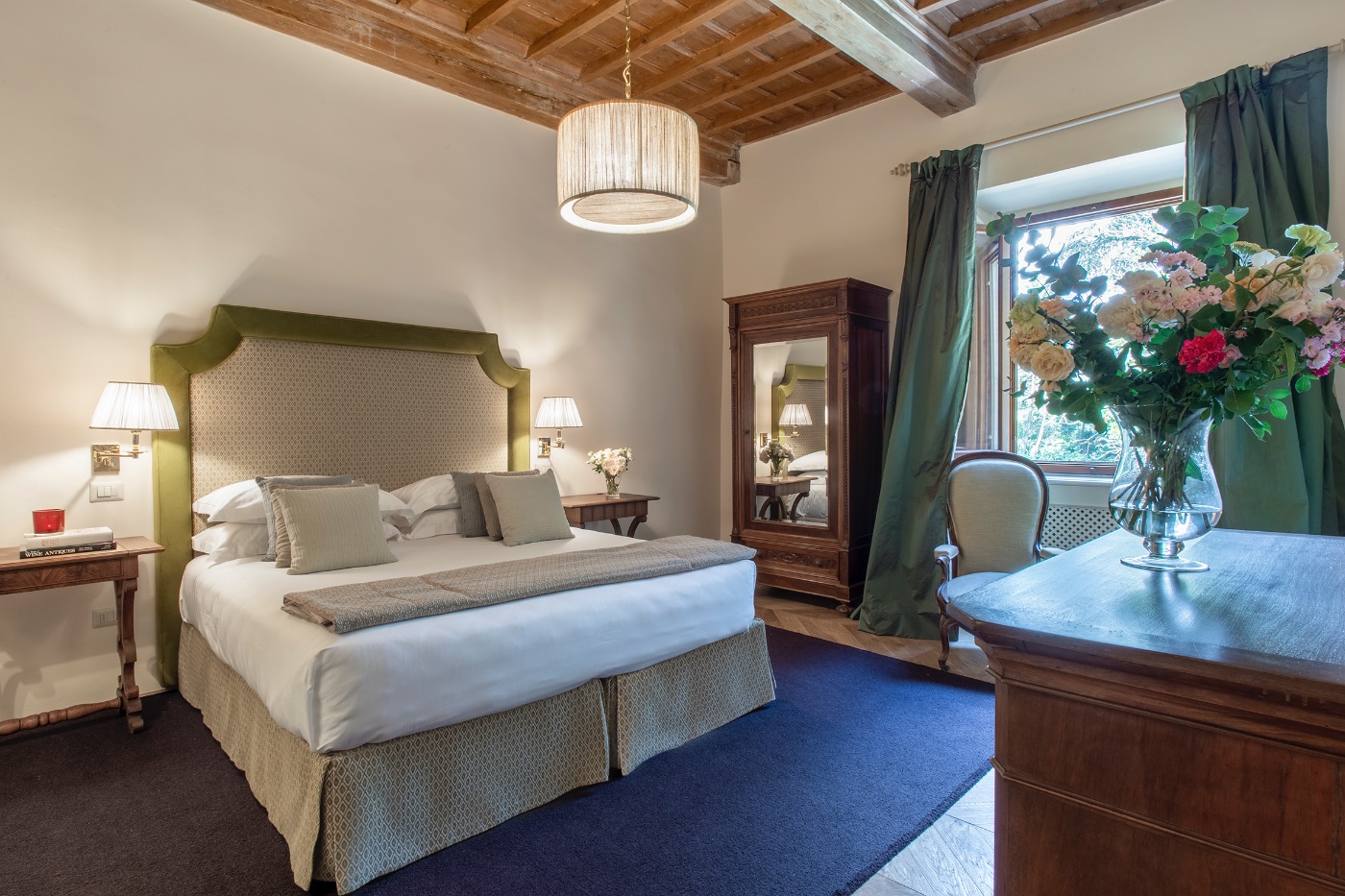 First Floor: The spacious sitting room with stunning frescoed walls provides a comfortable reading and relaxing spot, making it an ideal gathering place for a quiet conversation over a nightcap.