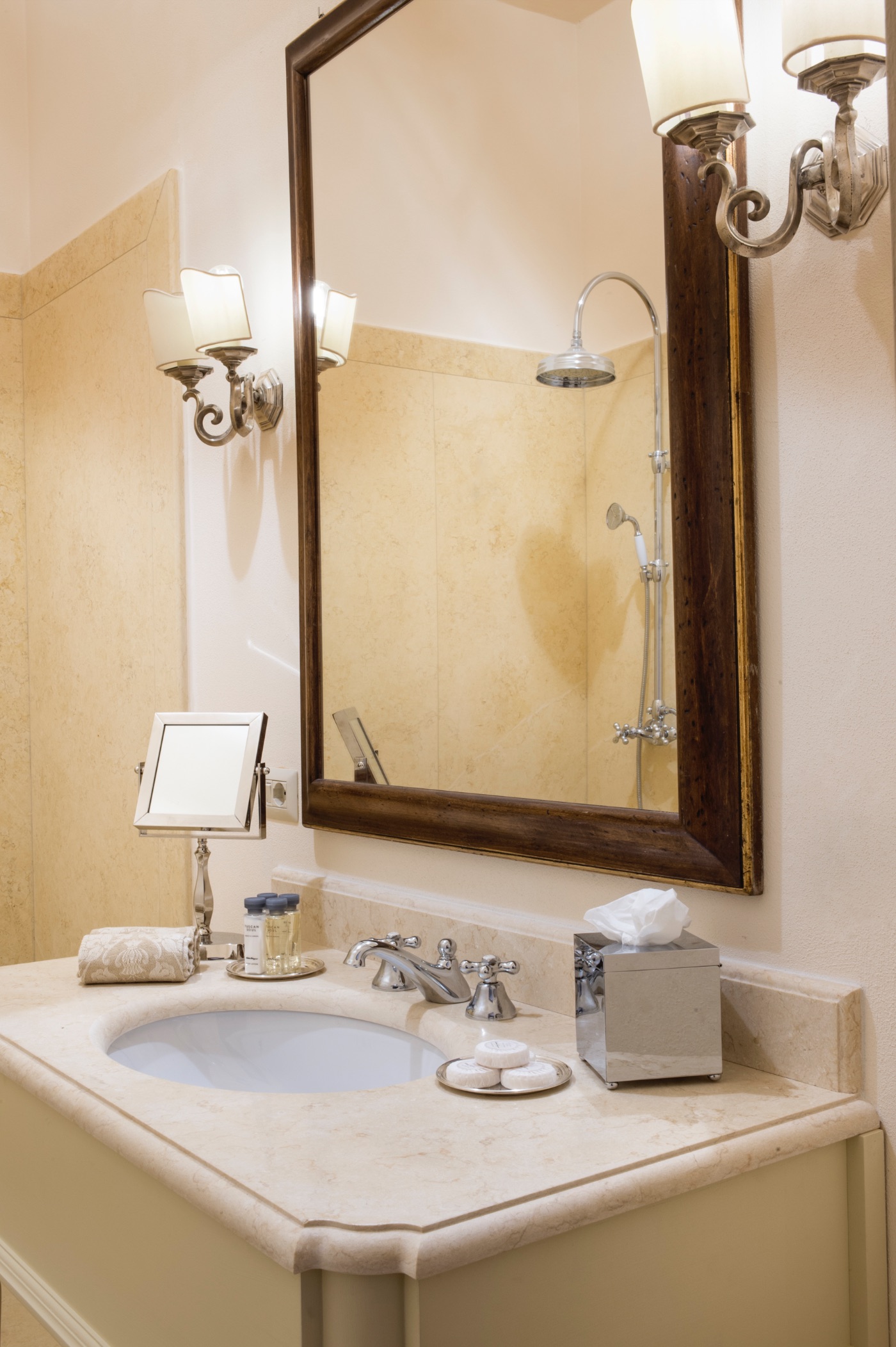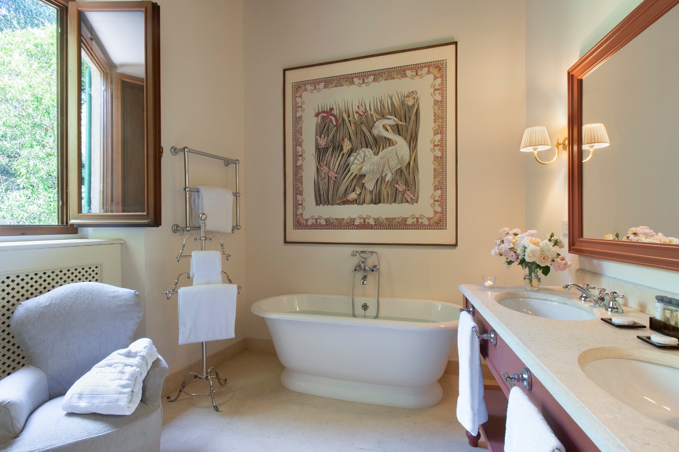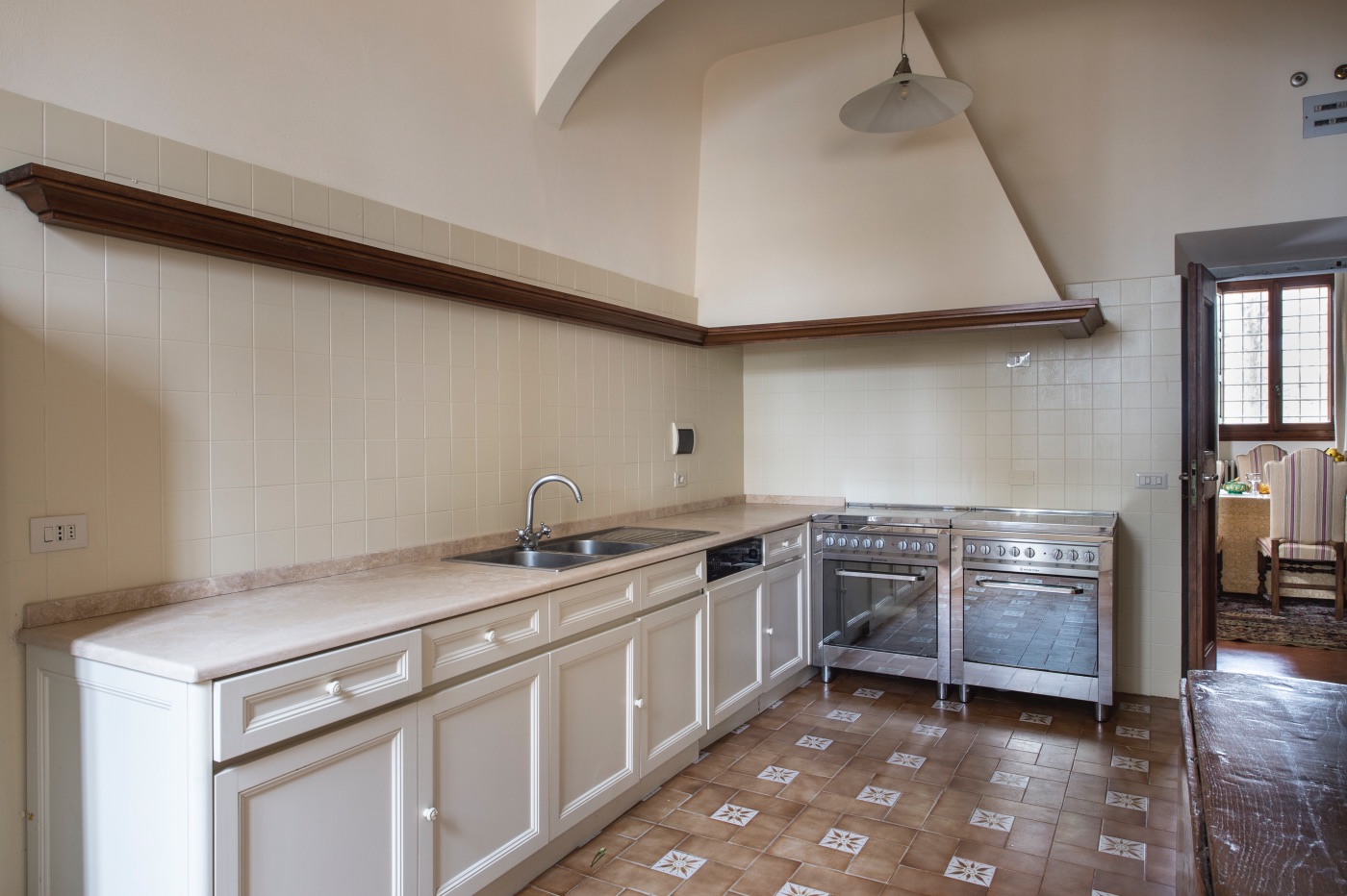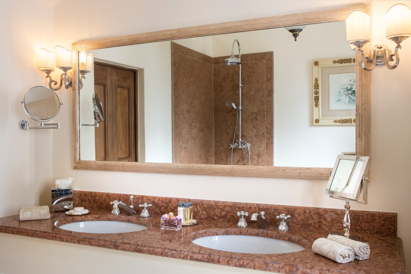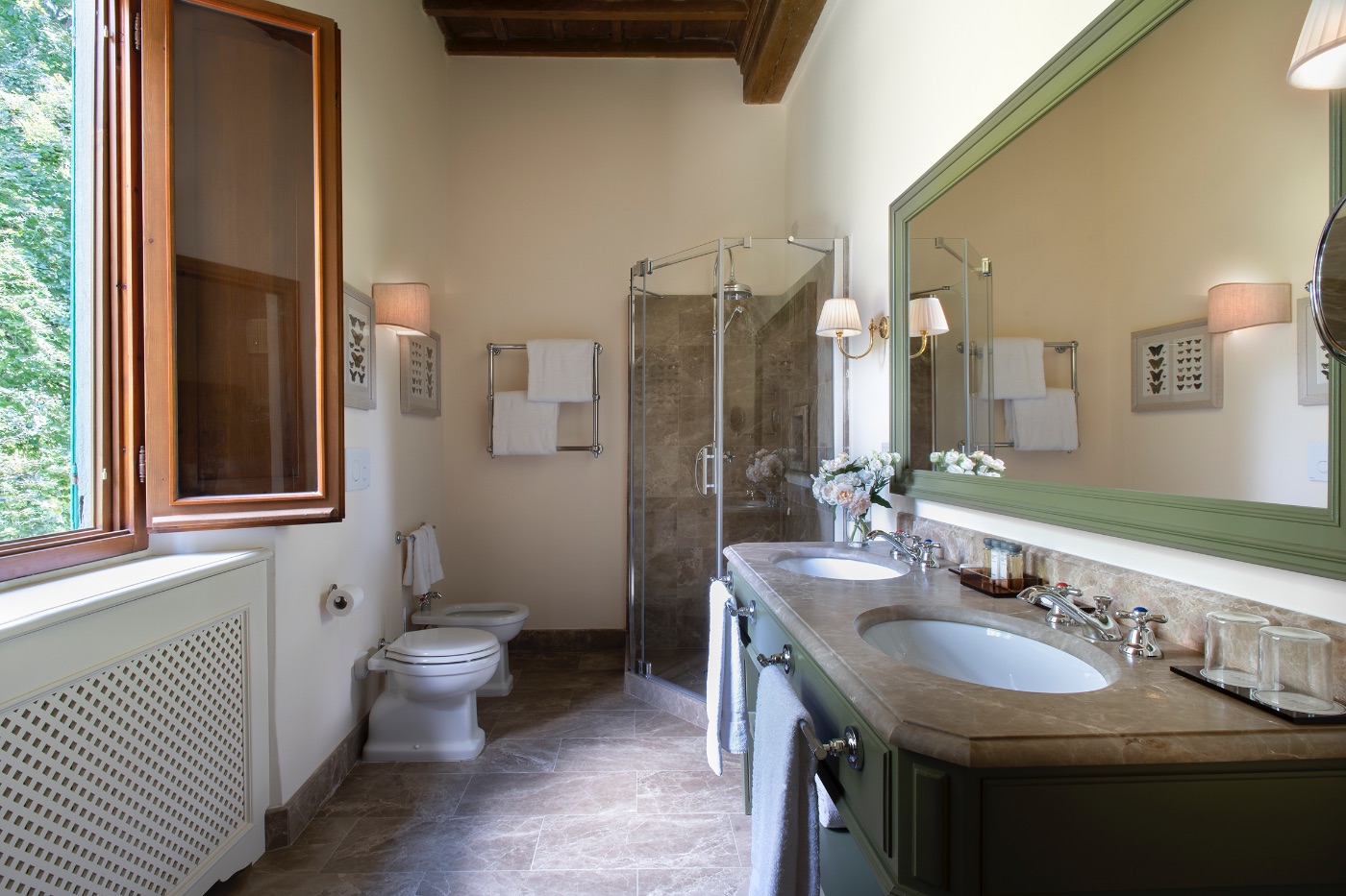 Ground Floor: The villa’s traditional décor is a mix of old and new, exquisitely selected from the owner’s family heirlooms. The elegant dining room, with a long table seating up to 12 and comfortable upholstered chairs, is perfect for formal dinners and opens onto a panoramic terrace. The adjacent spacious living room features ample seating and a romantic fireplace, while the large breakfast room has warm wood paneling, a red brick wall, and an open-hearth fireplace for an intimate feel. The contemporary kitchen serves both the dining and breakfast rooms, with the caring villa staff preparing your breakfasts and dinners. A cozy sitting room with a TV and a library with a fireplace are also located on this floor, offering perfect areas to enjoy some alone time. Two guest bathrooms complete this floor.