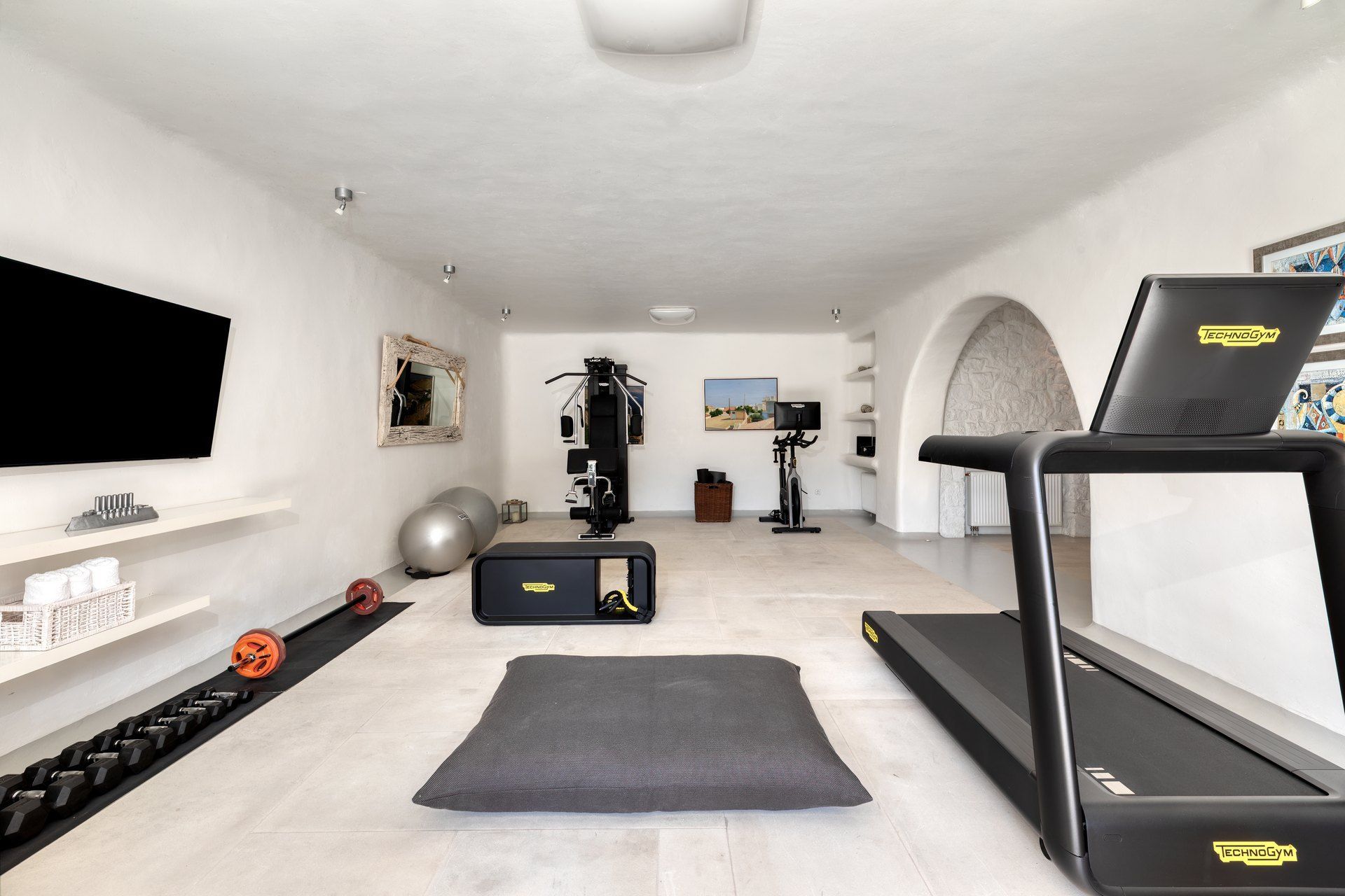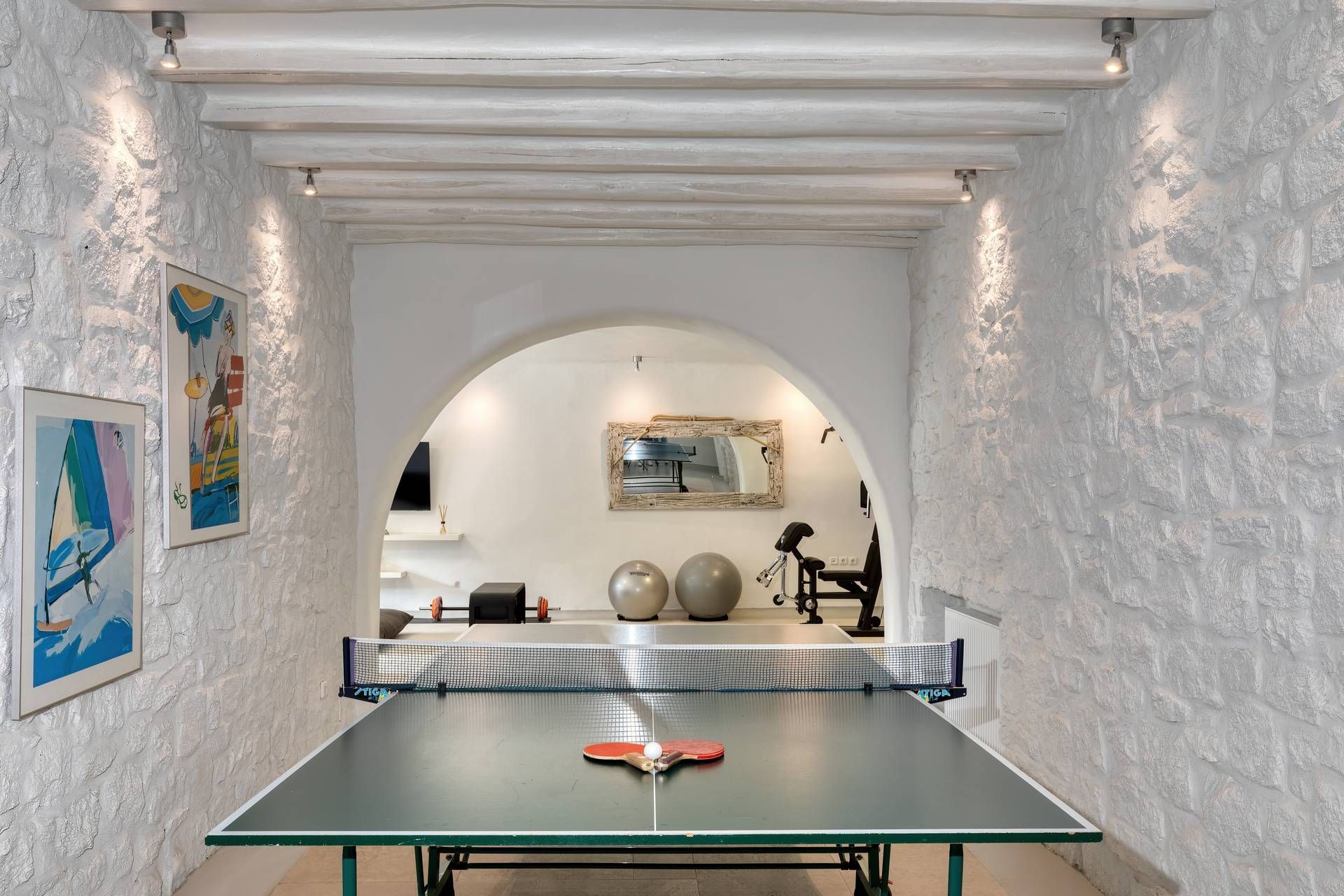 Here, wellbeing is given special attention. While a game-friendly playroom with table tennis—ideal for friendly tournaments that somehow always go on until someone calls for a swim—creates a playful atmosphere, a fitness room with a Technogym treadmill allows you to go for sunrise runs even if you would rather stay villa-side. Parents will appreciate the considerate touches, such as the availability of highchairs and baby cots and the proximity of Mykonos Town for last-minute necessities, as the holidays should be easy for everyone in the group.