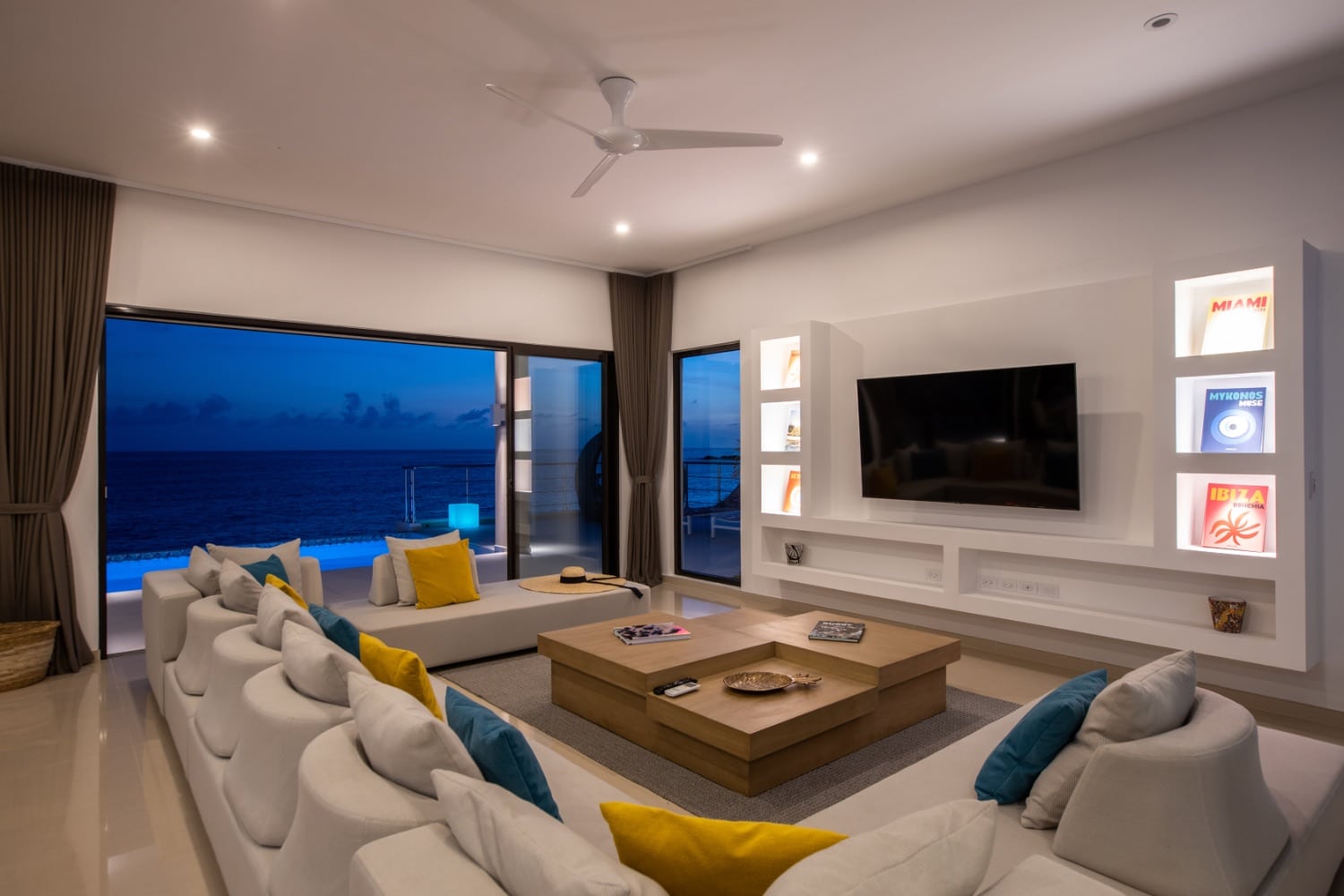Step outside and the experience becomes even more captivating. The private swimming pool sits at the edge of the terrace, perfectly positioned to overlook the ocean and capture the golden colors of sunset. Six comfortable sun loungers line the spacious terrace, creating a relaxed poolside setting ideal for long afternoons under the Caribbean sun. In the evening, the pool deck becomes a front-row seat to one of the island’s most beautiful sunset views, where the sky shifts from soft pink to deep orange over the sea.