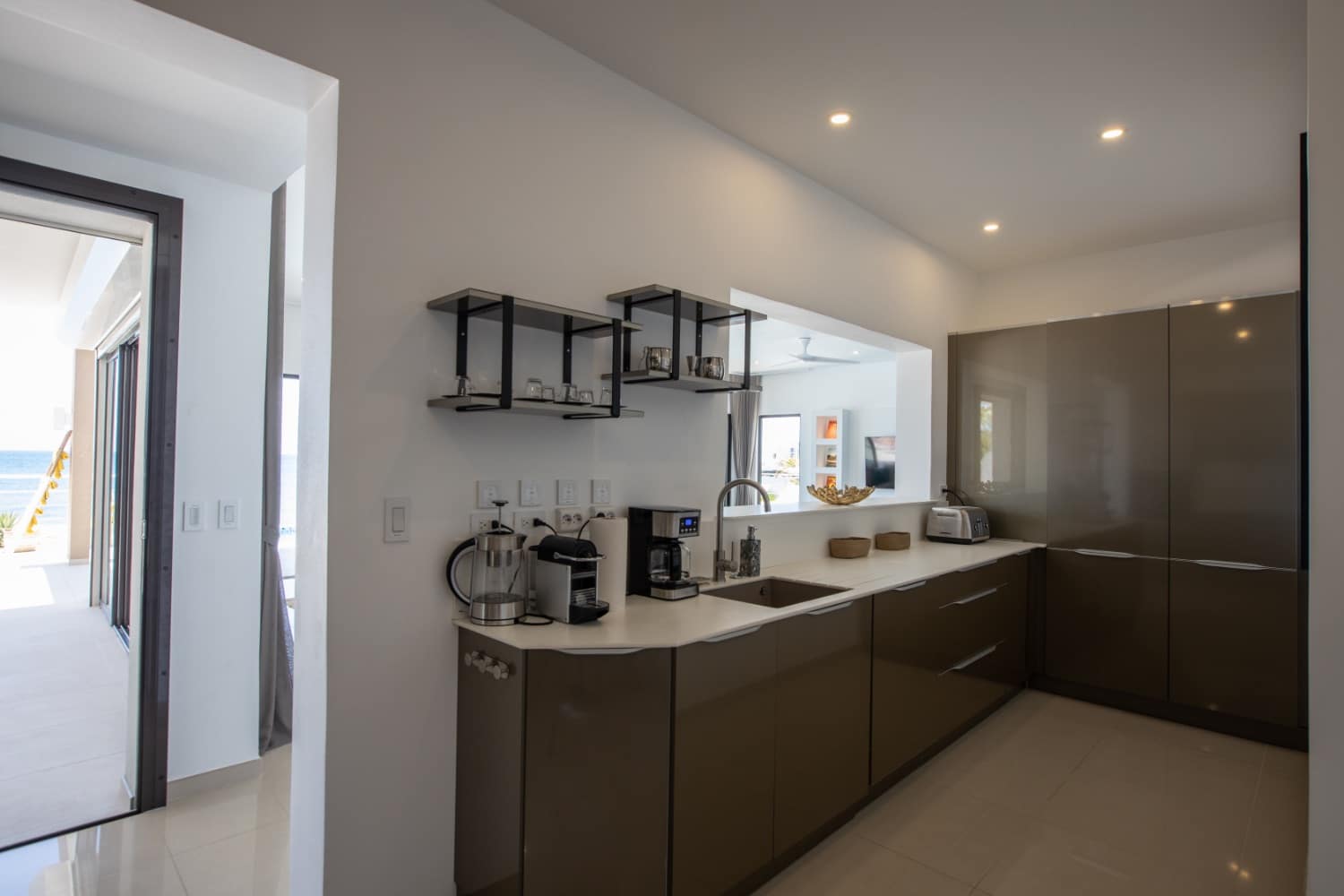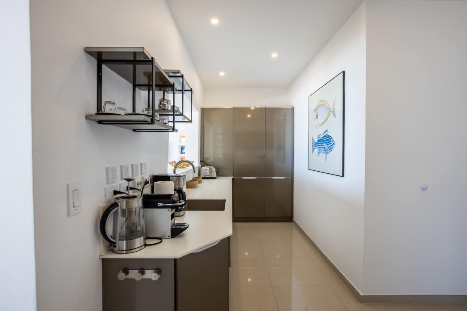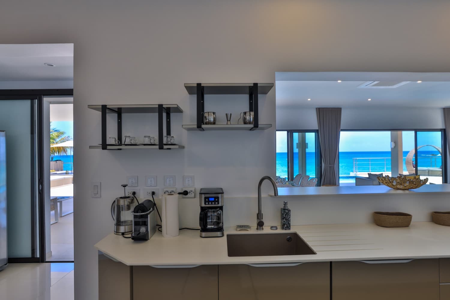 Inside, Villa Alma unfolds with a sense of light and openness. The spacious living area flows naturally into an elegant dining space and a modern open kitchen, all oriented toward breathtaking ocean views that stretch across the Caribbean Sea. Floor-to-ceiling openings allow sunlight to fill the room while maintaining a cool, breezy ambiance. The kitchen is fully equipped for everything from a relaxed breakfast to a sunset dinner, featuring an espresso machine, coffee maker, electric oven, toaster, dishwasher, BBQ grill, and all the essentials expected in premium St Martin Villas.