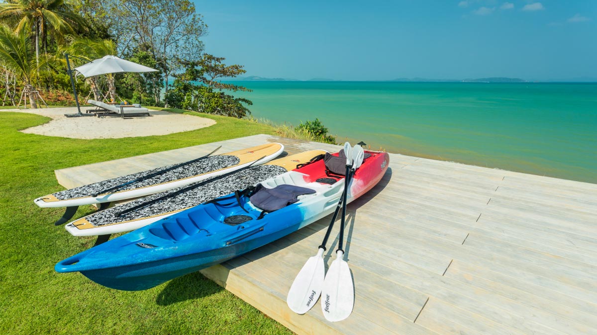 And for those who want to engage more directly with the elements, the villa’s man-made beach—complete with kayaks and paddleboards—provides a playful, immersive experience of island living, without leaving the estate.