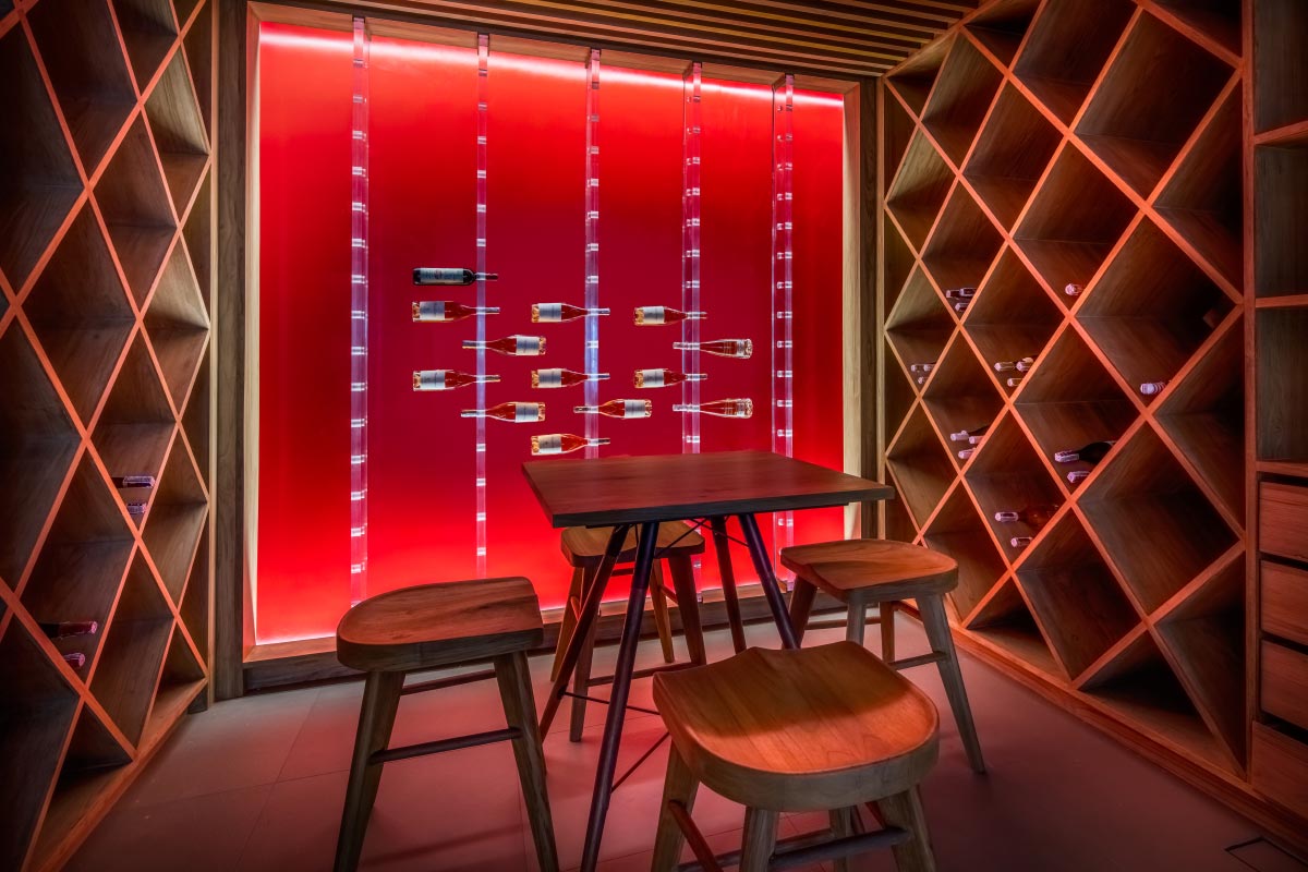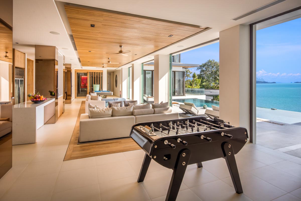 There is also a dedicated wine cellar and tasting table, ideal for evening conversation or informal gatherings, as well as an additional lounge with billiards, foosball, and direct access to the mid-level pool and deck area.