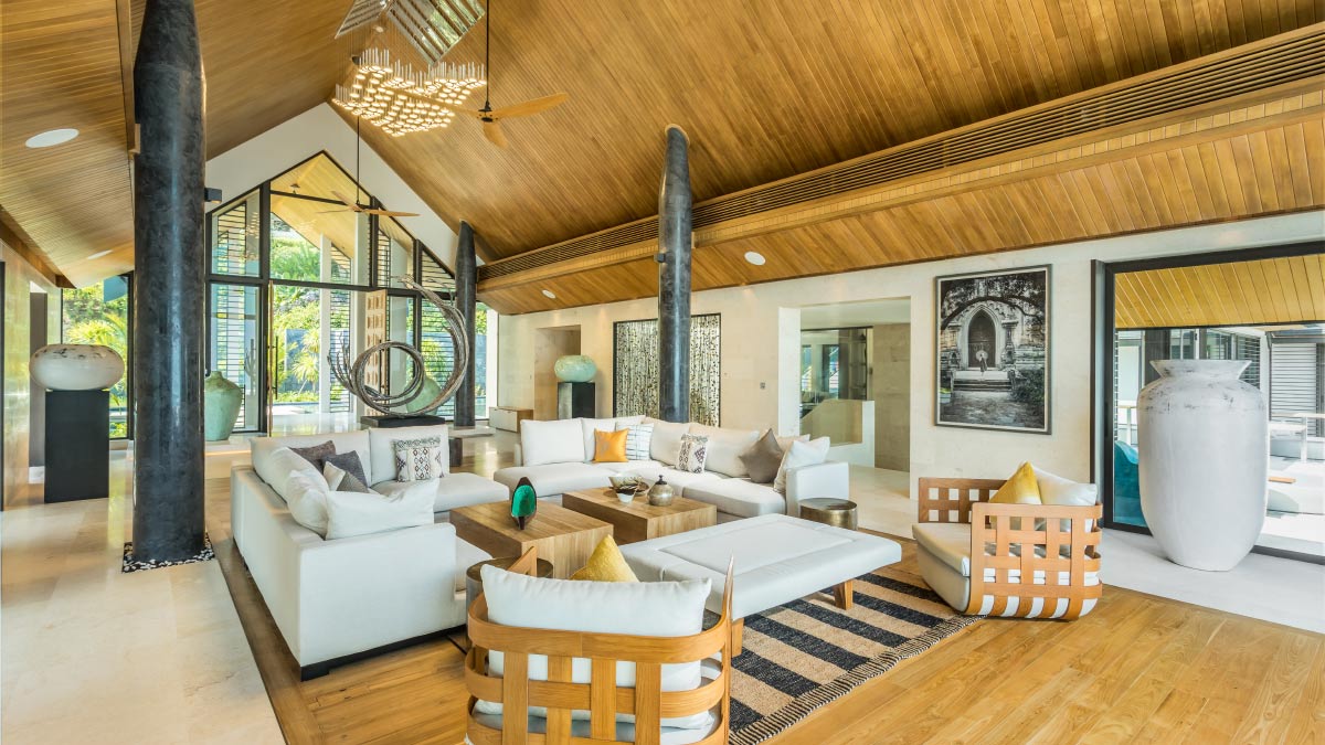 From the moment one arrives, the villa reveals its dual personality. A classic Thai gabled roof nods to the region’s cultural heritage, while inside, clean architectural lines, elegant marble surfaces, and rich wooden finishes speak to the purity and restraint of Nordic design principles. The effect is striking: a home that feels at once serene, purposeful, and intimately connected to its surroundings.