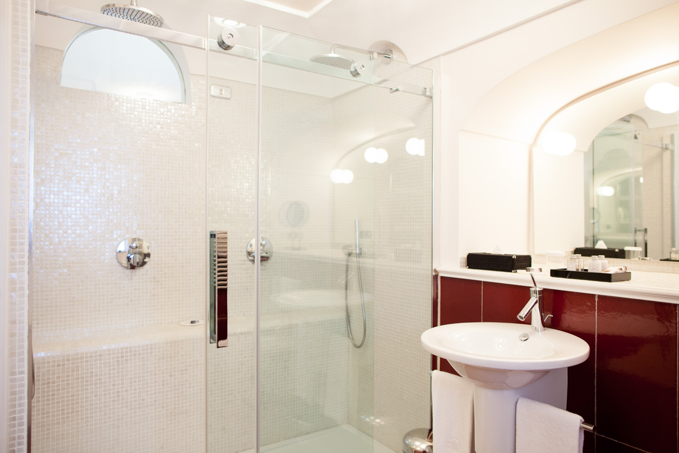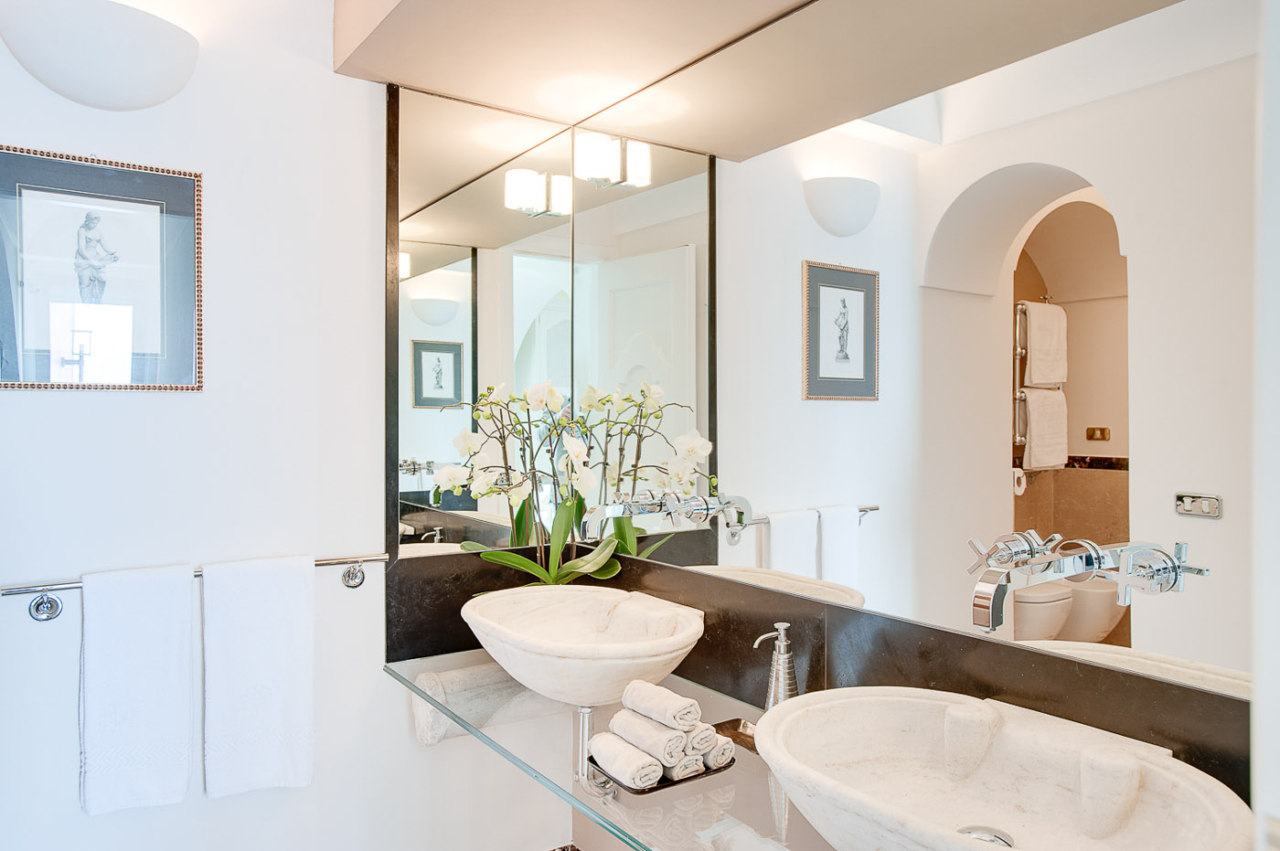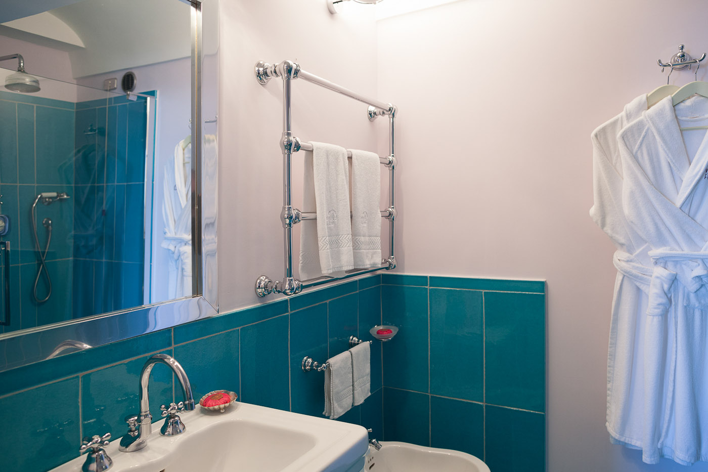 The fifth bedroom does not have the en-suite bathroom. The bathroom can be reached from the bedroom going down 10 small stairs in the hallway. In the bathroom, you will find a nice courtesy kit from Etro and Cotè Bastide.