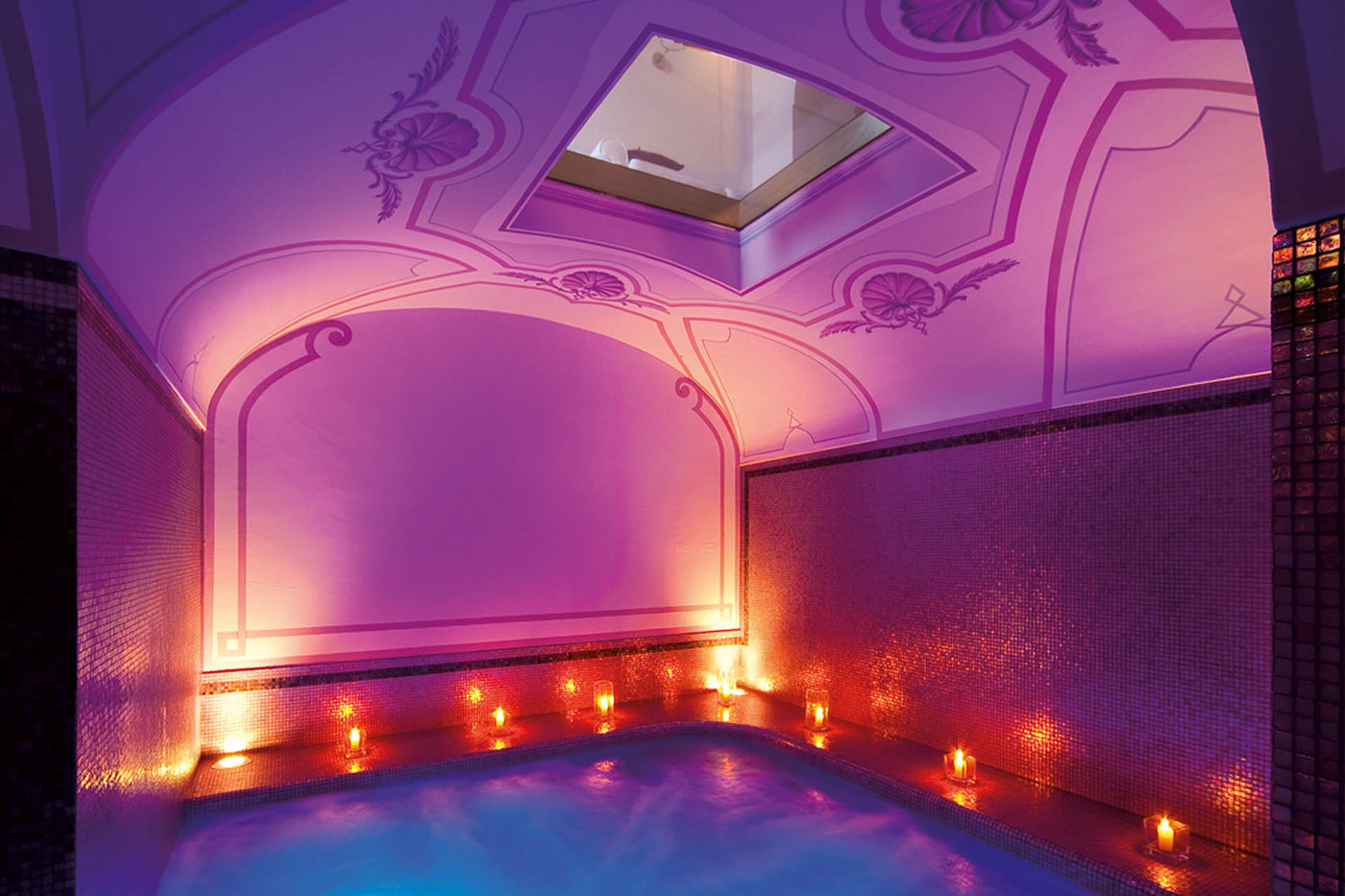 The floors boast large, white ceramic tiles. Many ceilings have hand-painted decorations and special lighting. The living area is equipped with sofas, a table, and a large, flat screen Satellite TV. There is a courtyard with chairs and tables and a second living room with sofas overlooking the indoor pool.